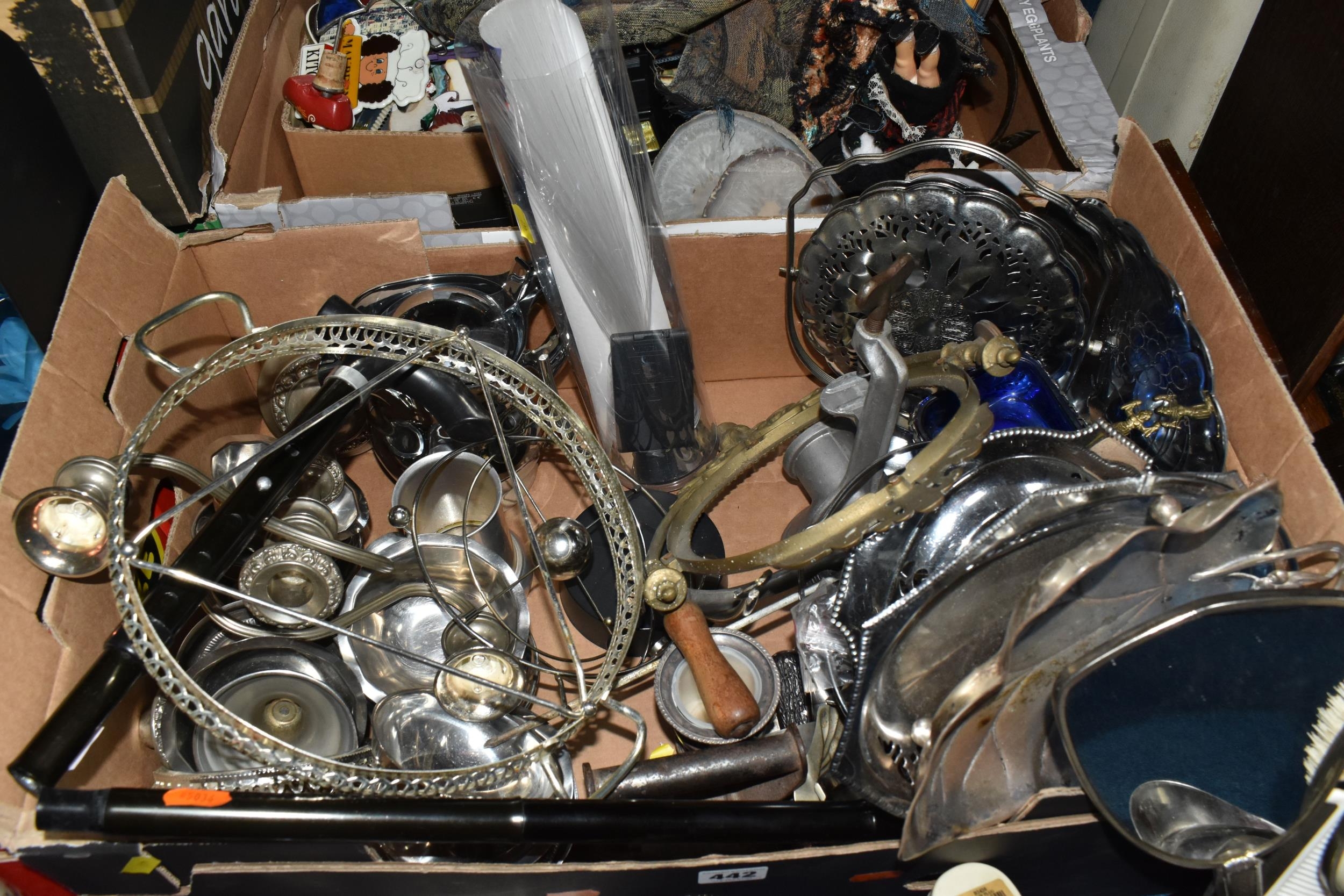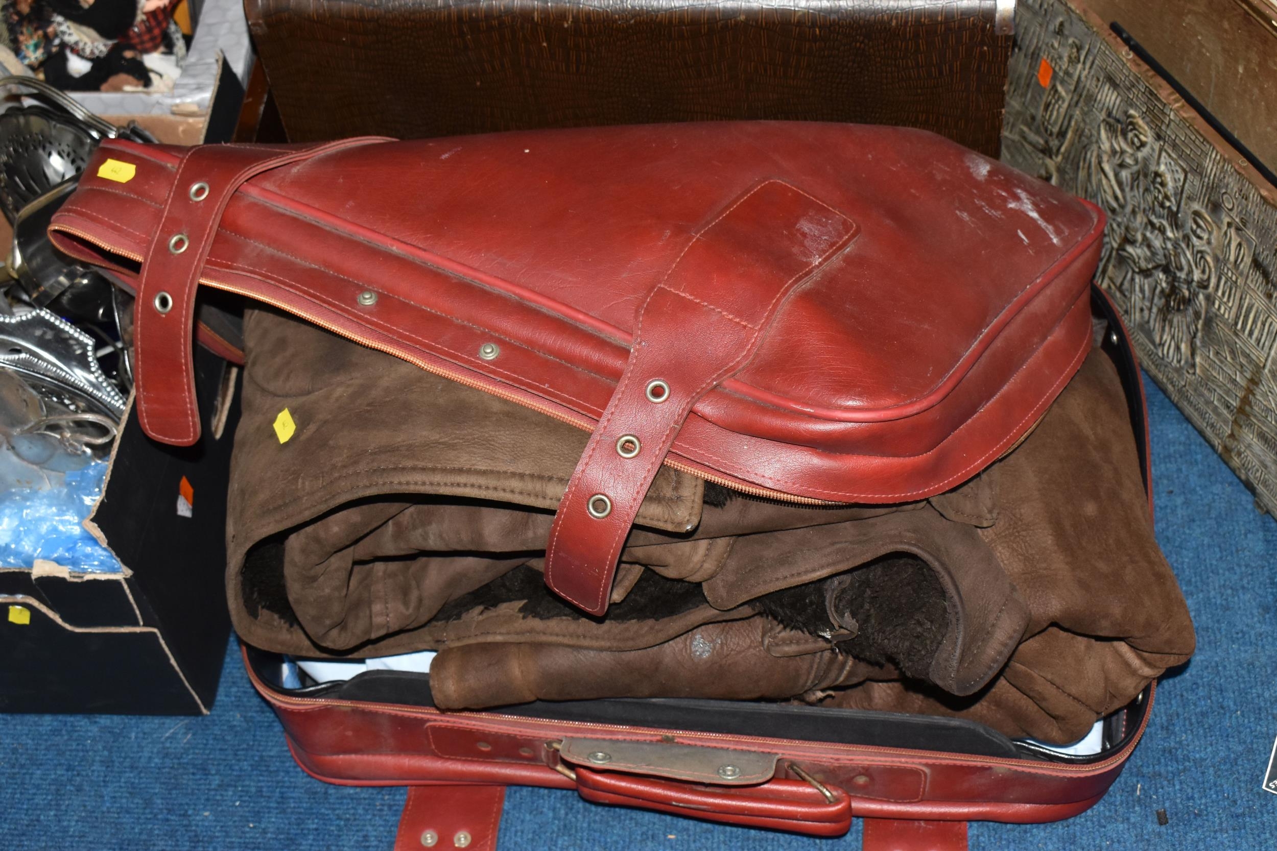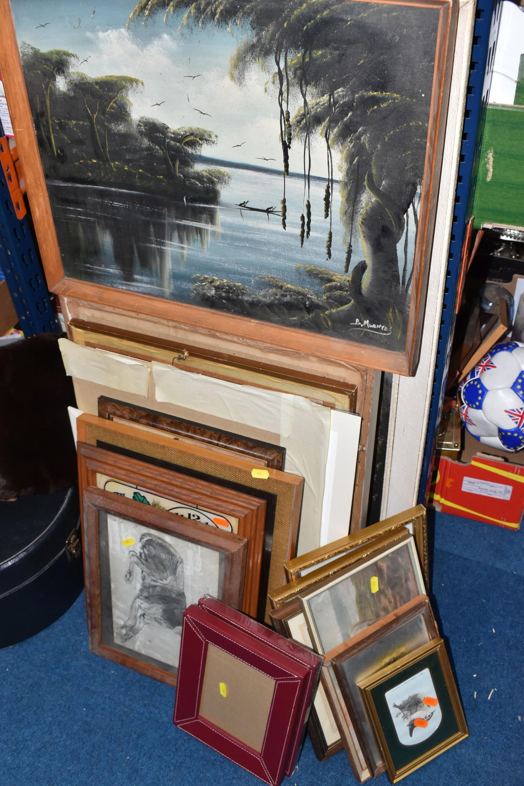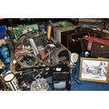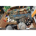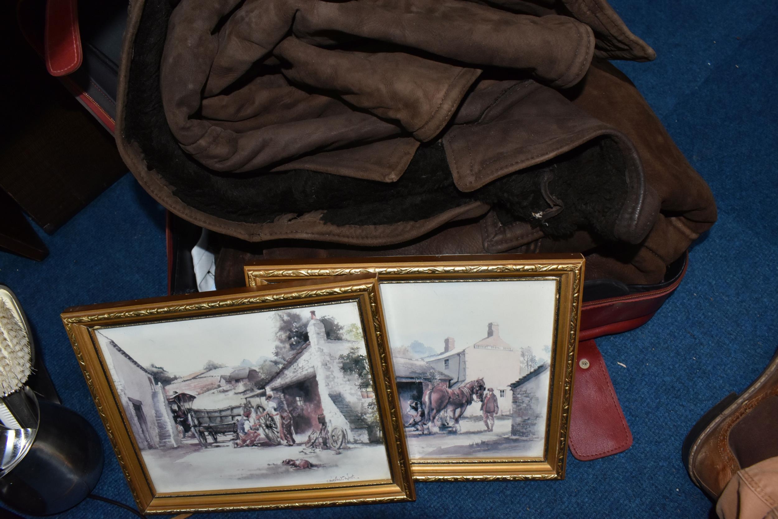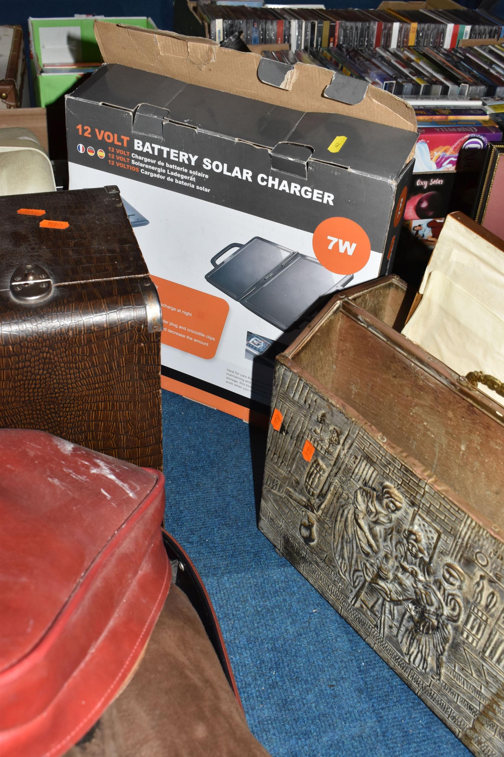 FIVE BOXES AND LOOSE MISCELLANEOUS ITEM, to include various sized pictures some framed some canvas approximately fifteen, a retro egg shaped mirror, over fifty needlecraft magazines, twenty five DVDs subjects include fantasy, romance, comedy etc. box of various fridge magnets over one hundred, portable Casio TV-400 pocket colour TV, solar charger 135 still packaged, natural stone sliced rock, two brown sheepskin coats, selection of ties, a vintage singer sewing machine in wooden case F8368594, a box of mixed metalware included candelabra, dessert bowls, trays, cruet set etc., a large oval roasting pot etc. (sd), (5 boxes + loose)