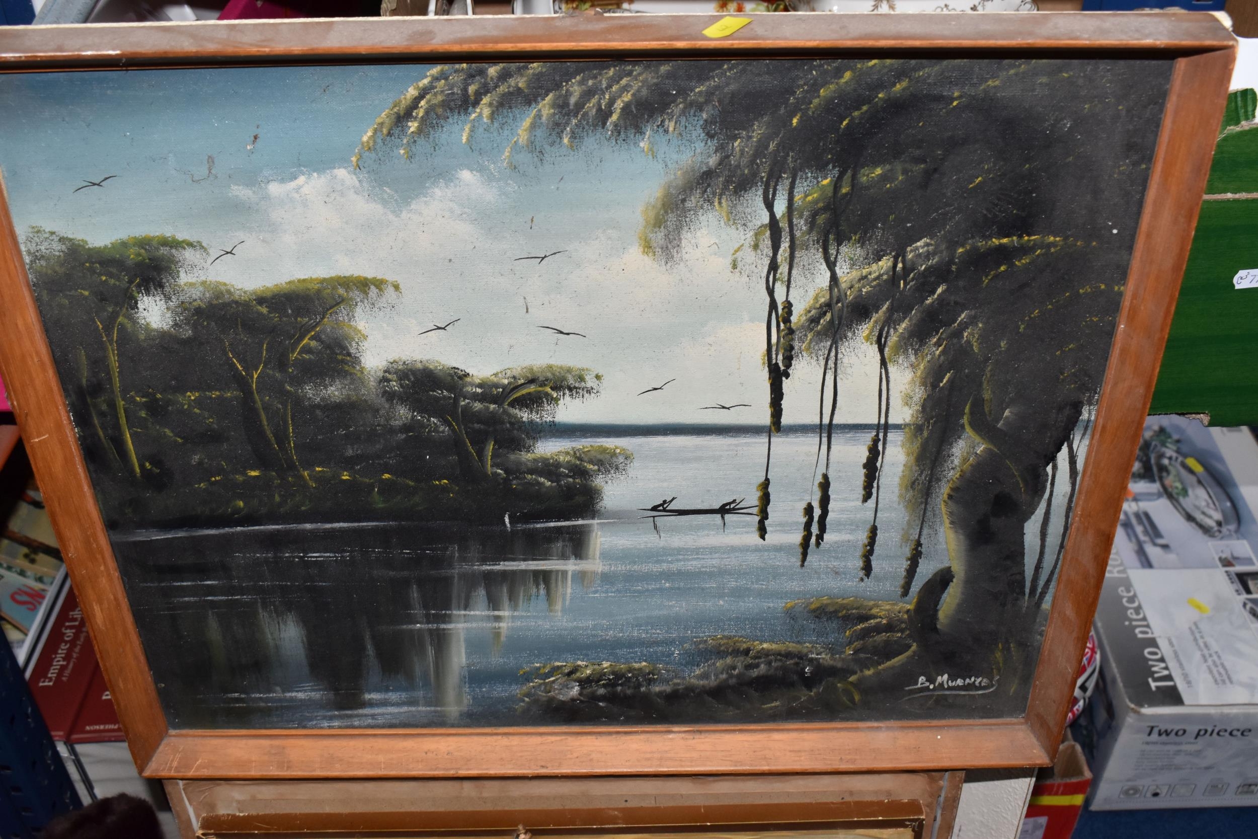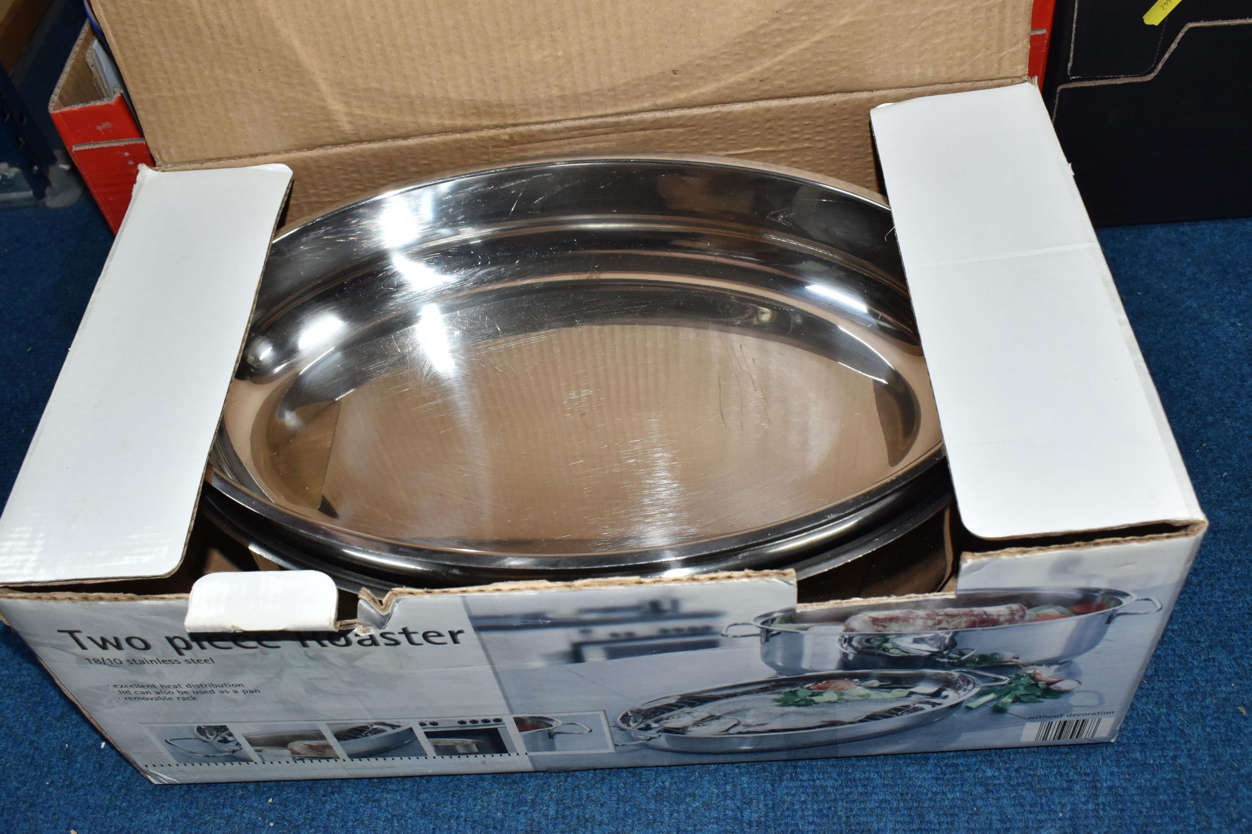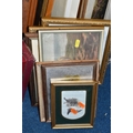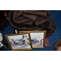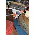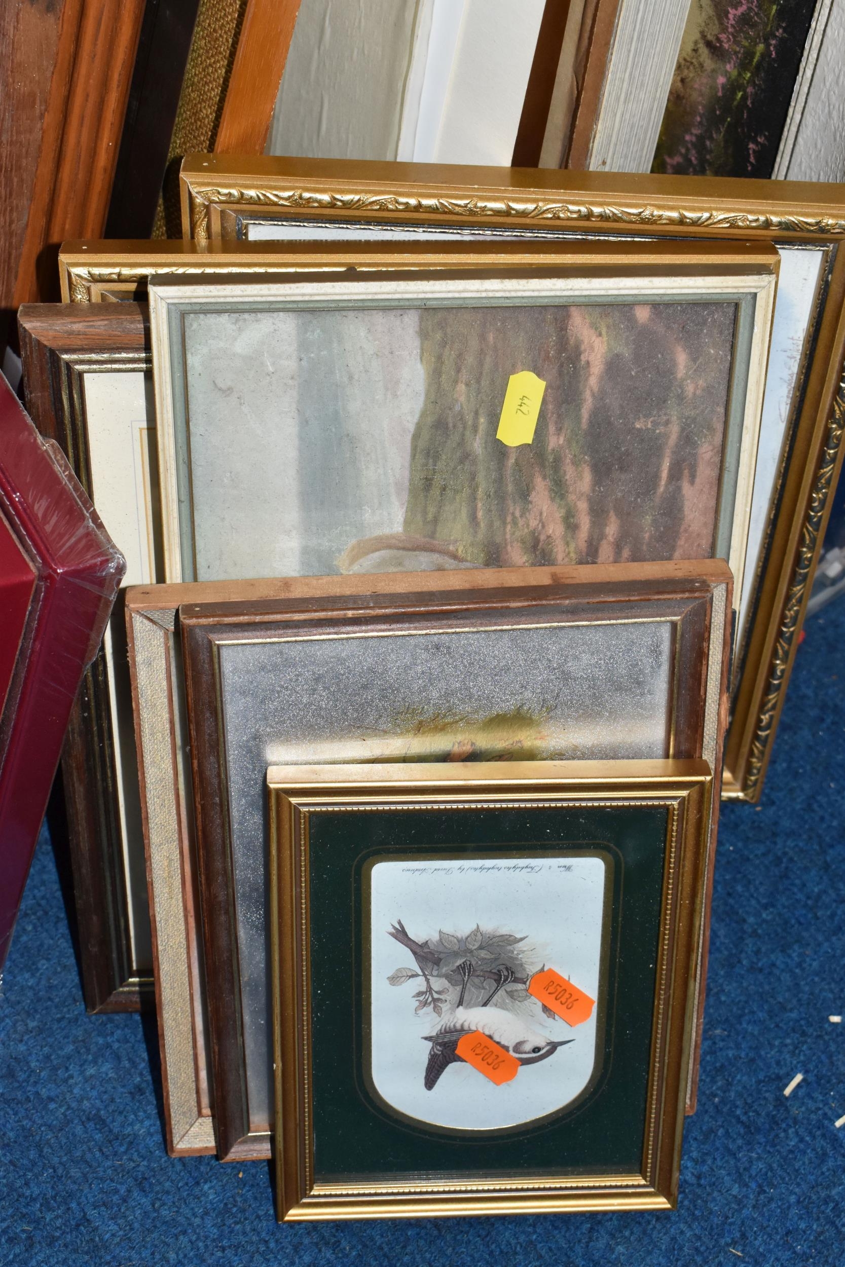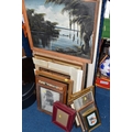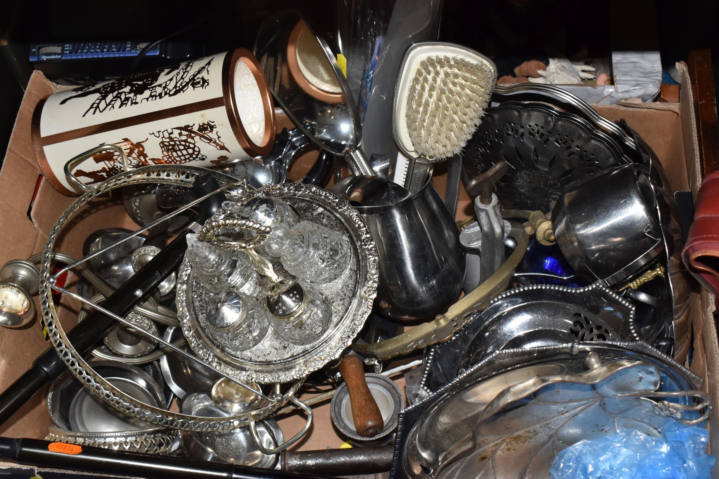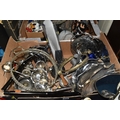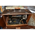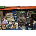 FIVE BOXES AND LOOSE MISCELLANEOUS ITEM, to include various sized pictures some framed some canvas approximately fifteen, a retro egg shaped mirror, over fifty needlecraft magazines, twenty five DVDs subjects include fantasy, romance, comedy etc. box of various fridge magnets over one hundred, portable Casio TV-400 pocket colour TV, solar charger 135 still packaged, natural stone sliced rock, two brown sheepskin coats, selection of ties, a vintage singer sewing machine in wooden case F8368594, a box of mixed metalware included candelabra, dessert bowls, trays, cruet set etc., a large oval roasting pot etc. (sd), (5 boxes + loose)
