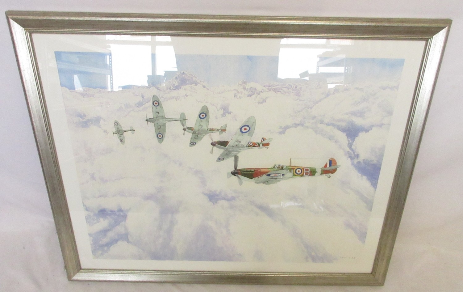 The Ricky Groves Collection - Ian Hay watercolour of Spitfire squadron in the clouds, 89.7cm x 72cm