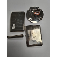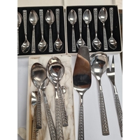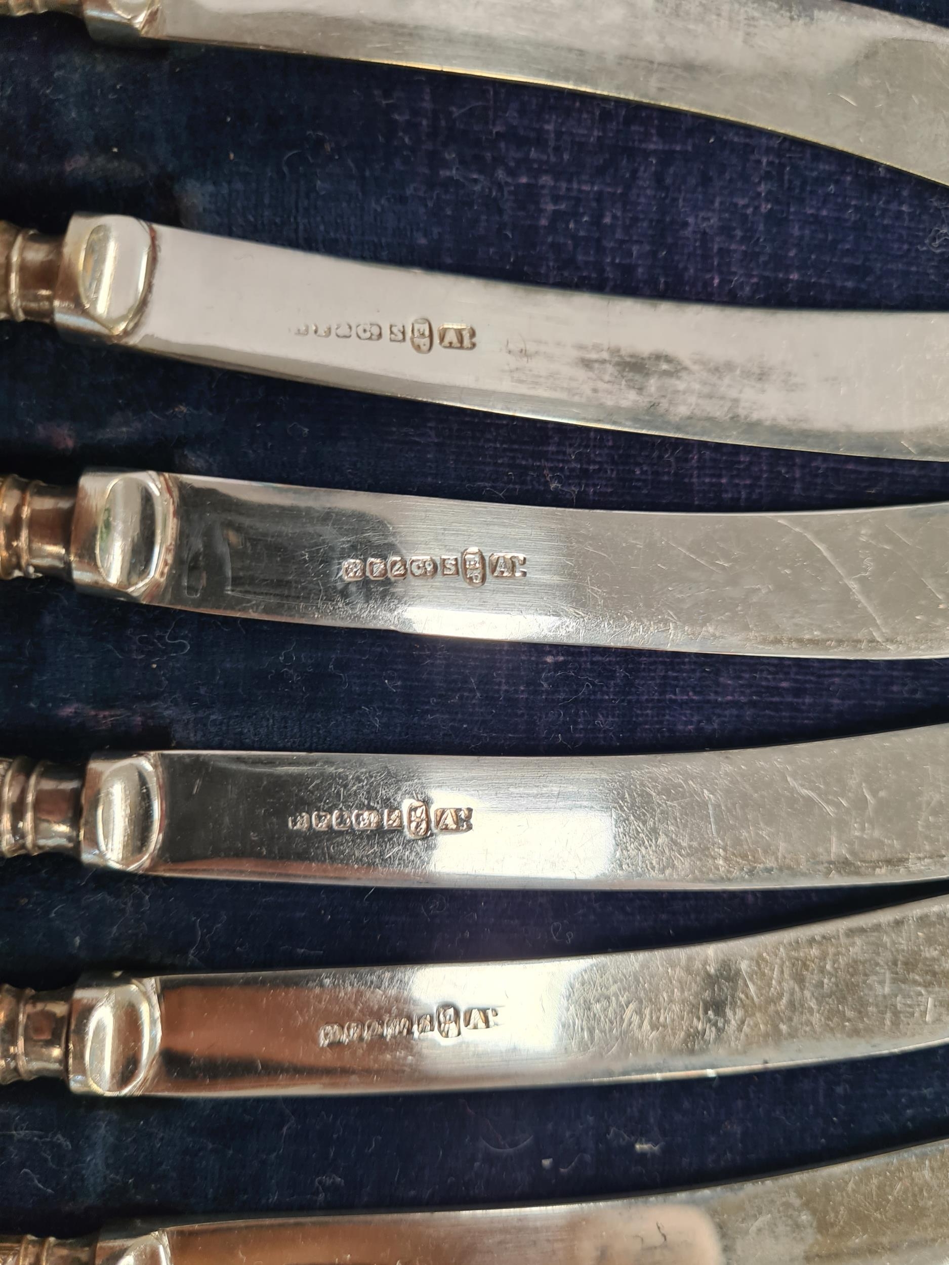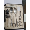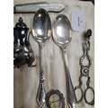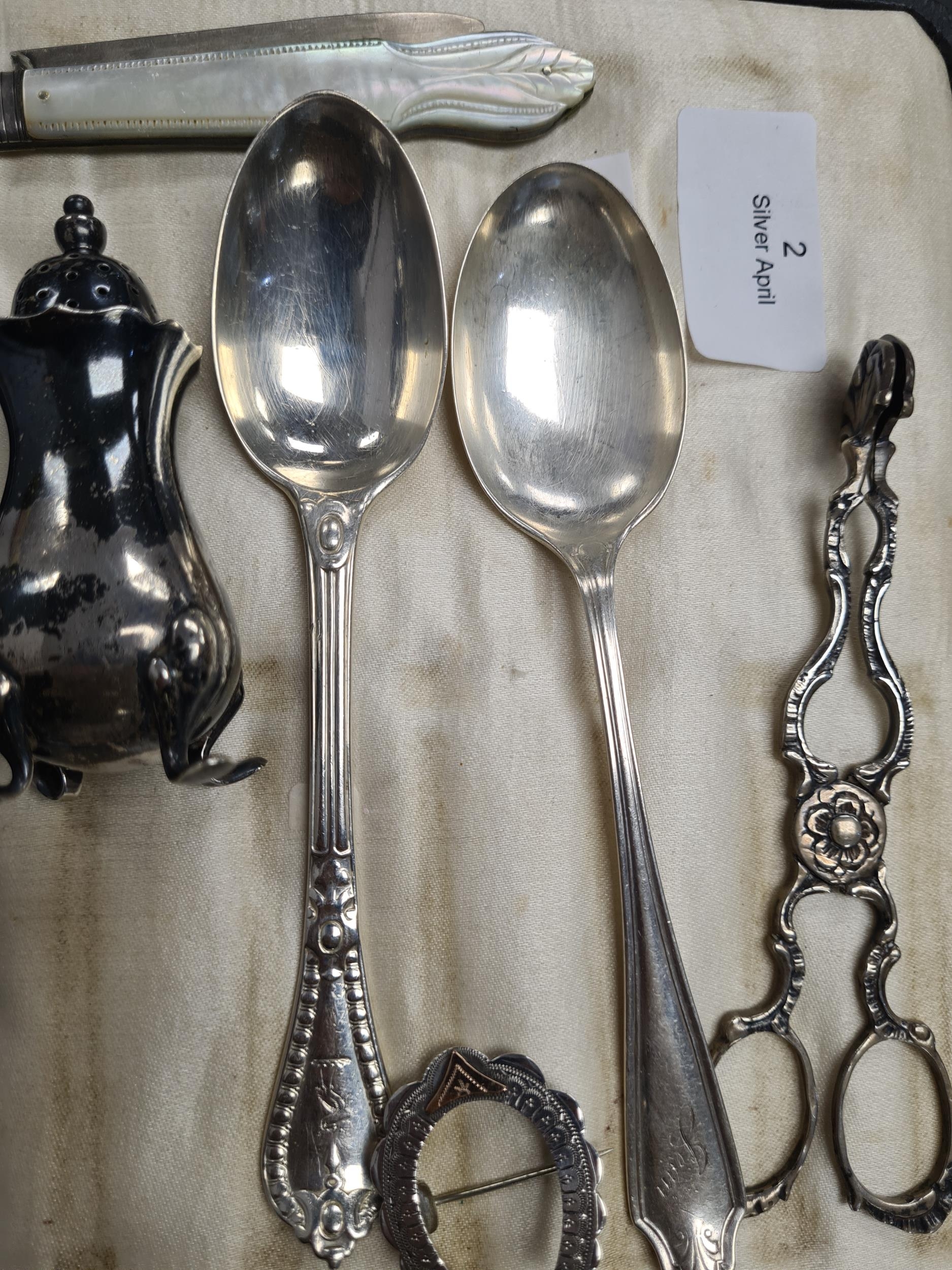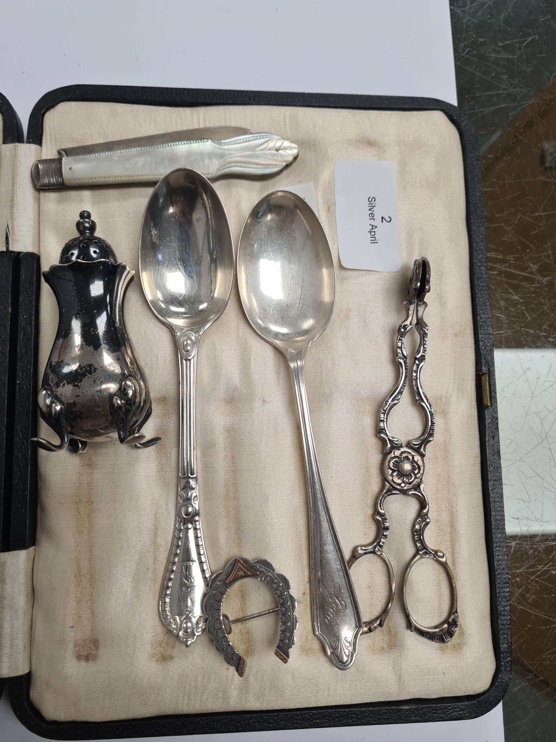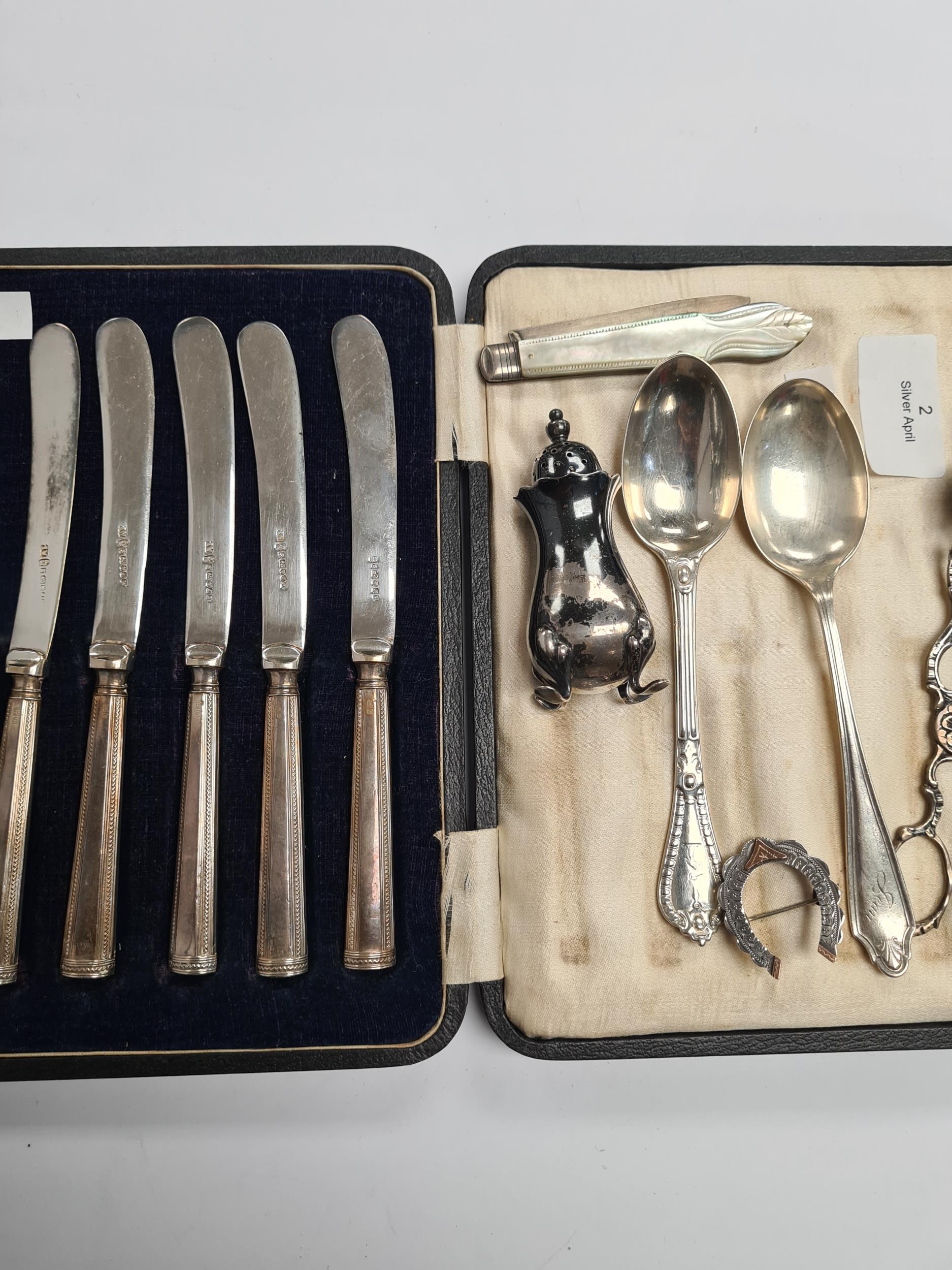 A cased set of silver handled knives by Harrison Fisher and Co. Also with a brooch, on silver and Mother of Pearl pen knife by John Yeomans Cowlishaw. A silver pepper, silver spoons, and decorative sugar tongs. Condition Report: Slight wear to items. Silver weight approx 4.01ozt, excluding knives