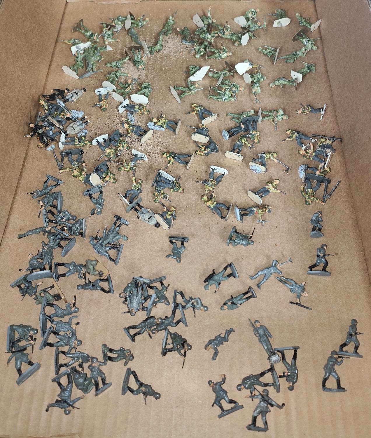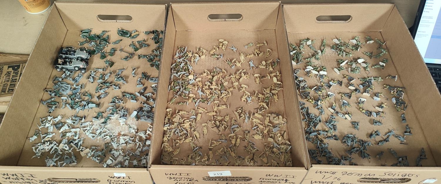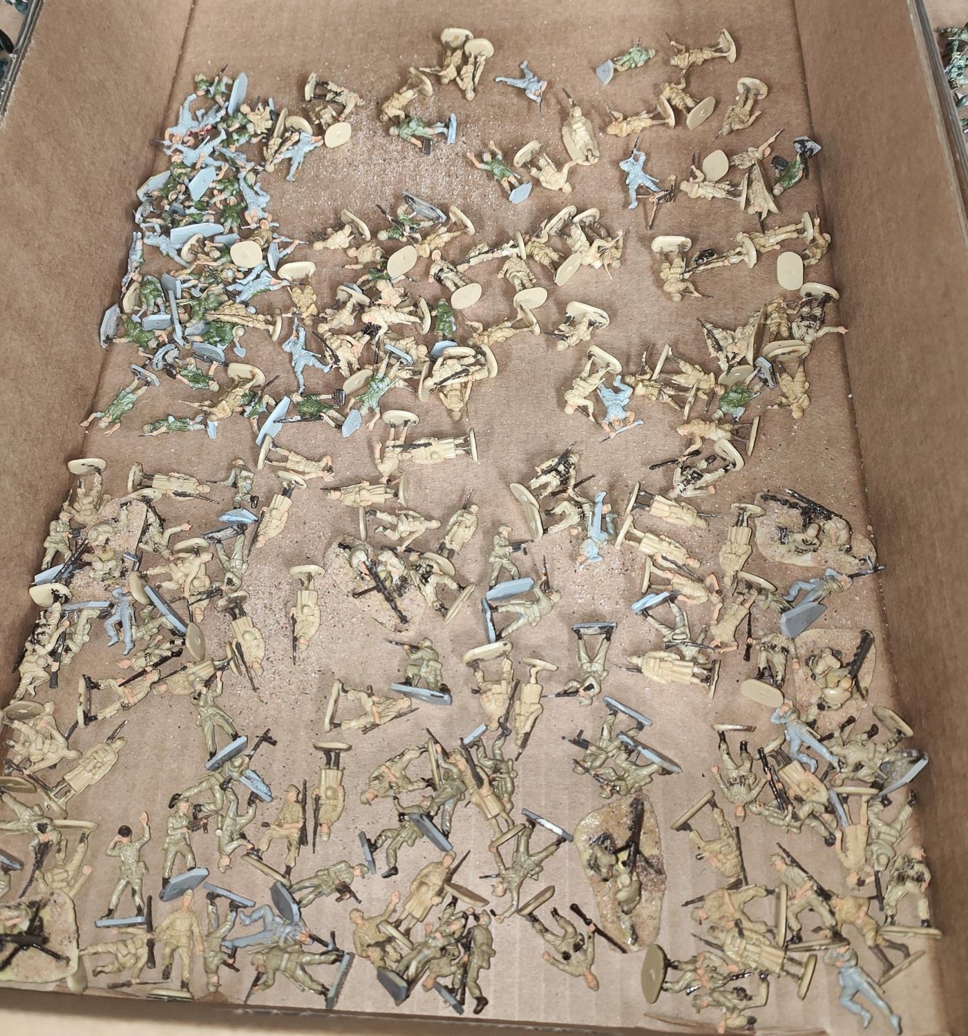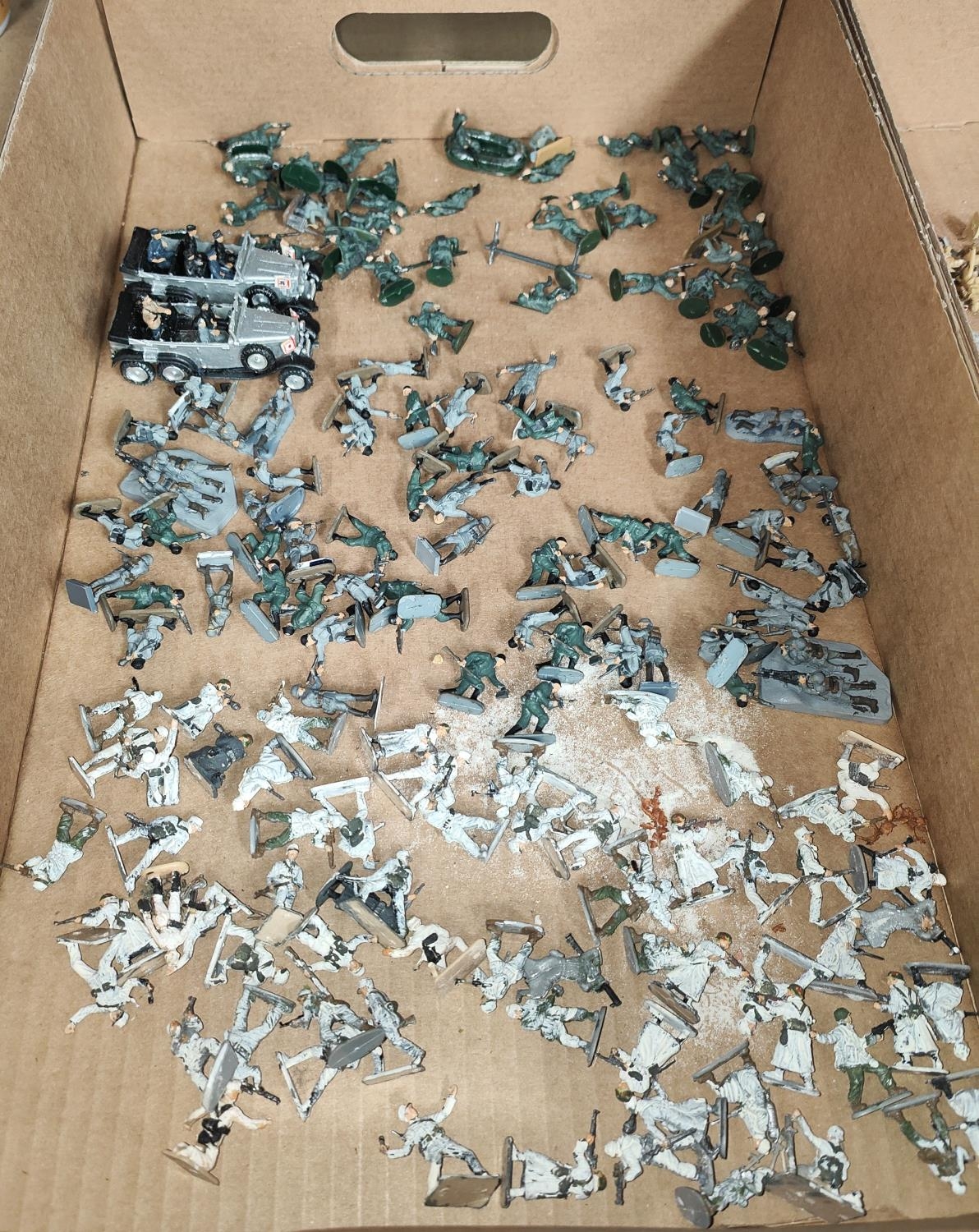 A large collection of painted plastic military table top miniatures, World War II, 1:72 20mm scale, including German troops, Waffen SS and Rommell Dessert Fox, Hitler Motorcade etc