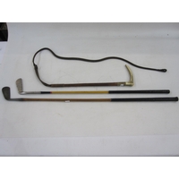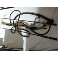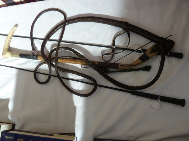 Hunting crop with horn handle with plaited whip, two other schooling whips and a leather plaited bull whip (4)