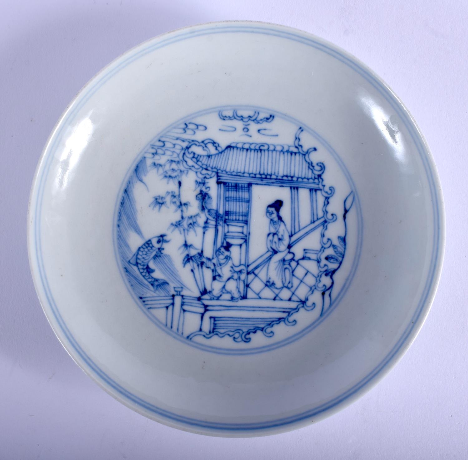 AN EARLY 20TH CENTURY CHINESE BLUE AND WHITE SAUCER 20th Century, bearing Yongzheng marks to base, painted with figures. 14.5 cm diameter.