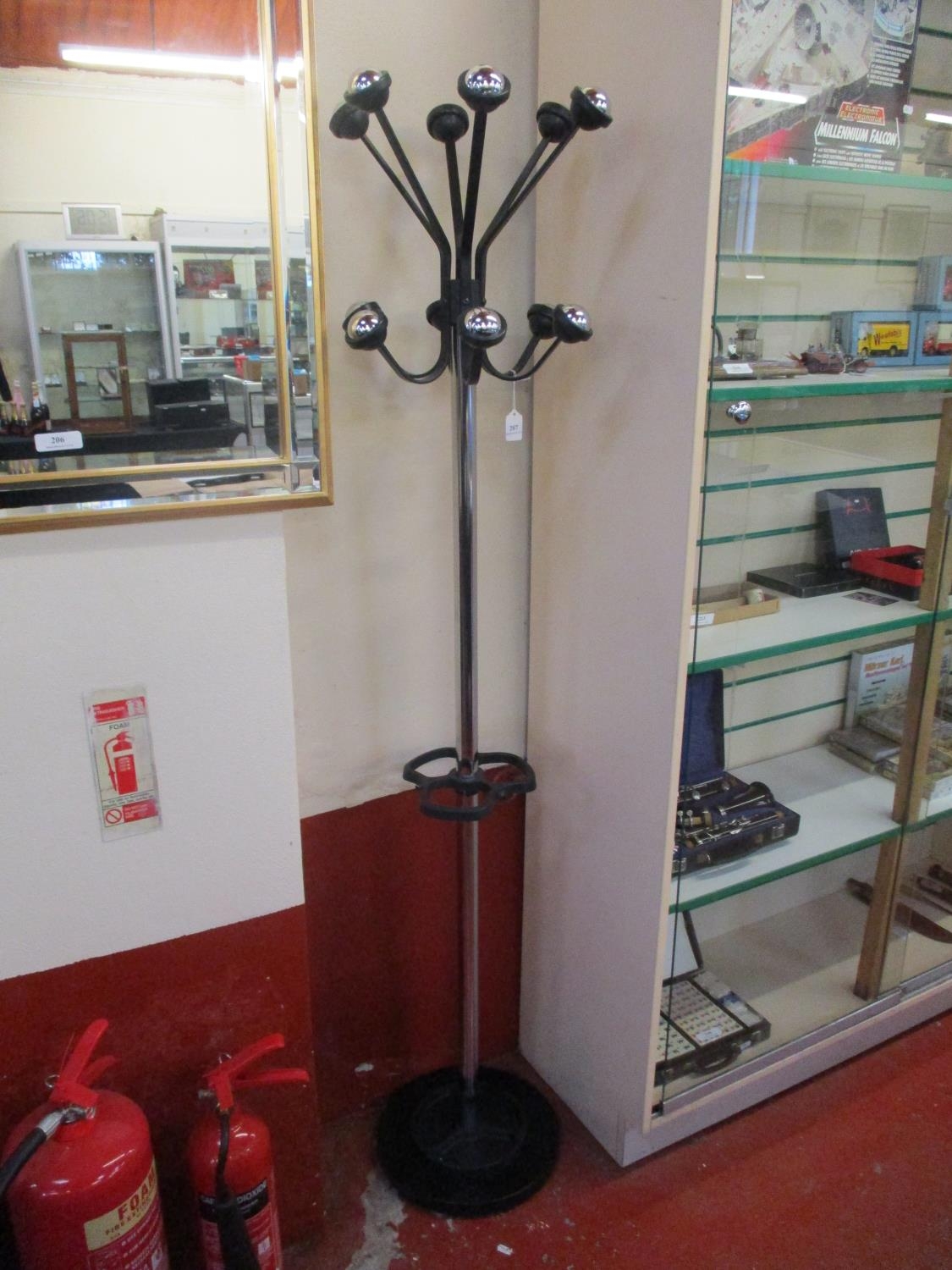 A contemporary chrome and black finished hat and coat stand