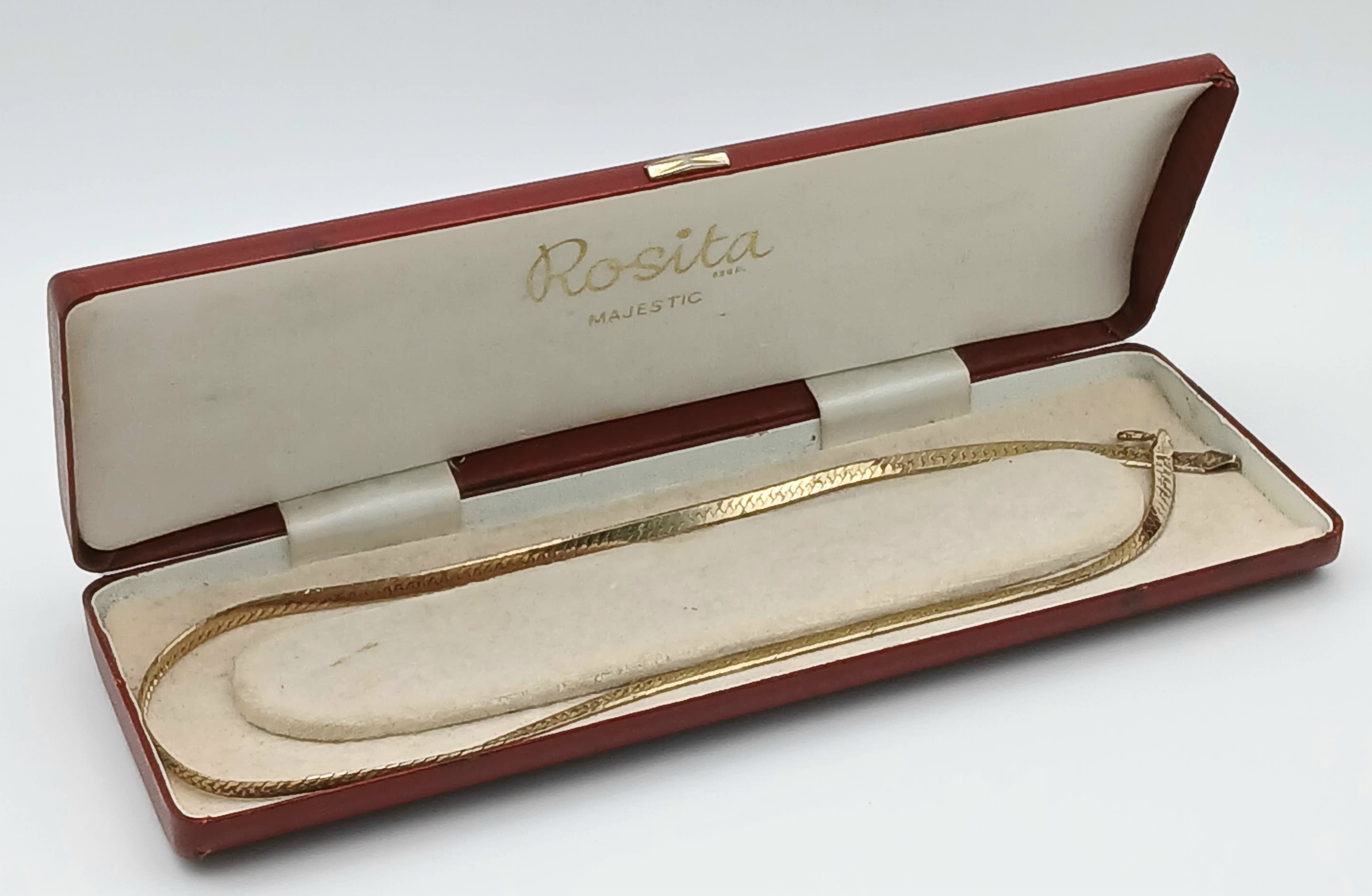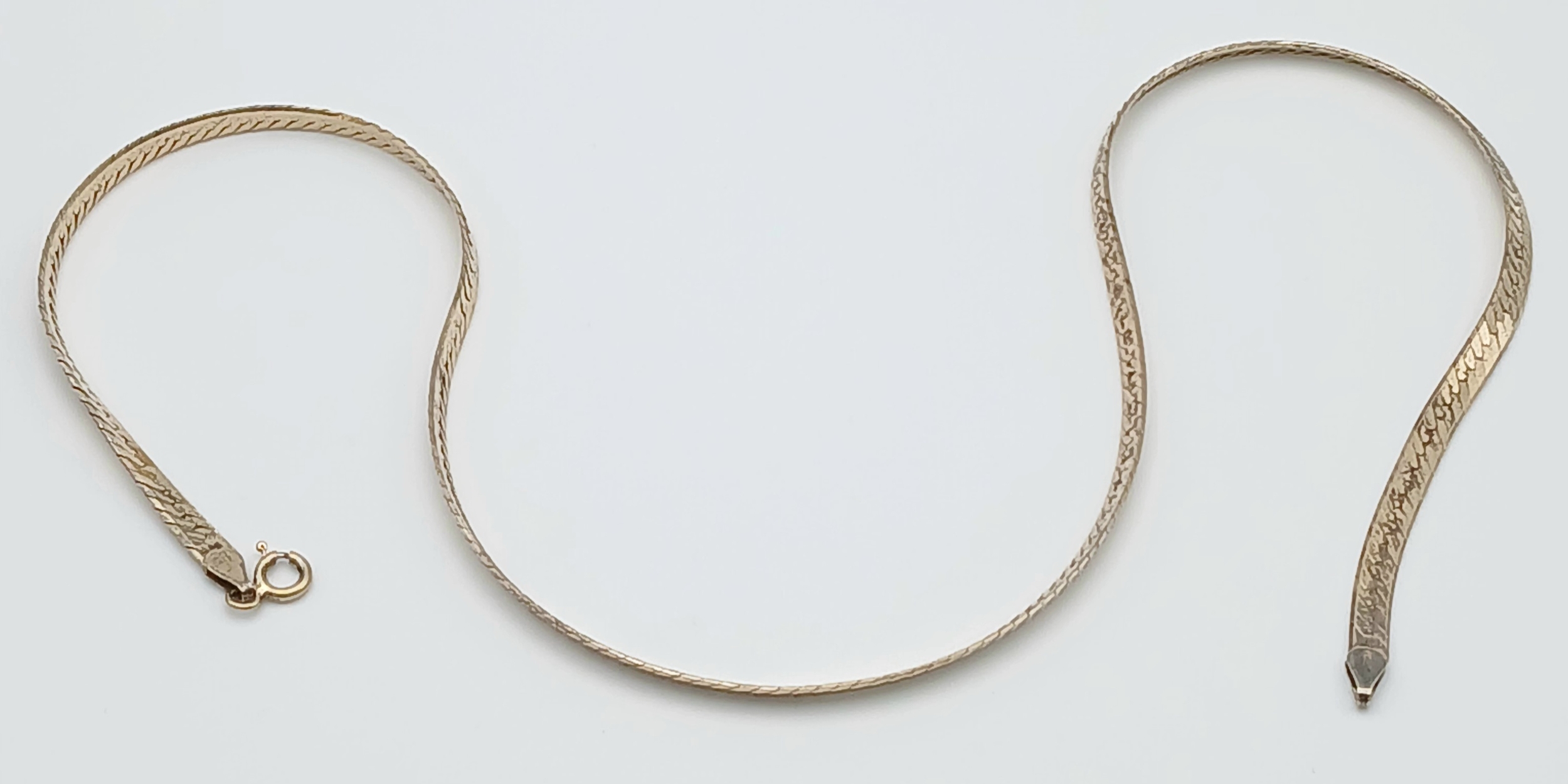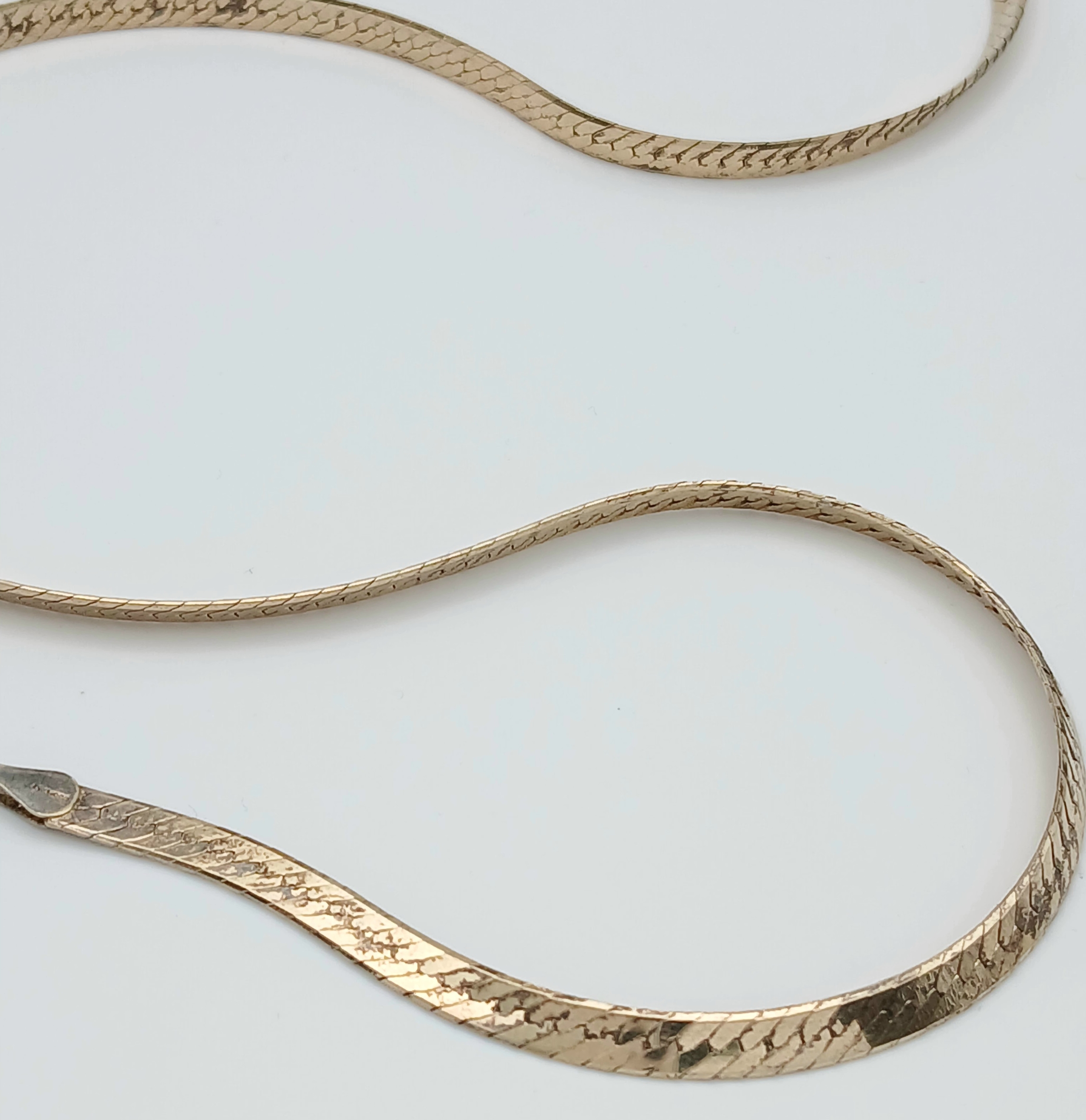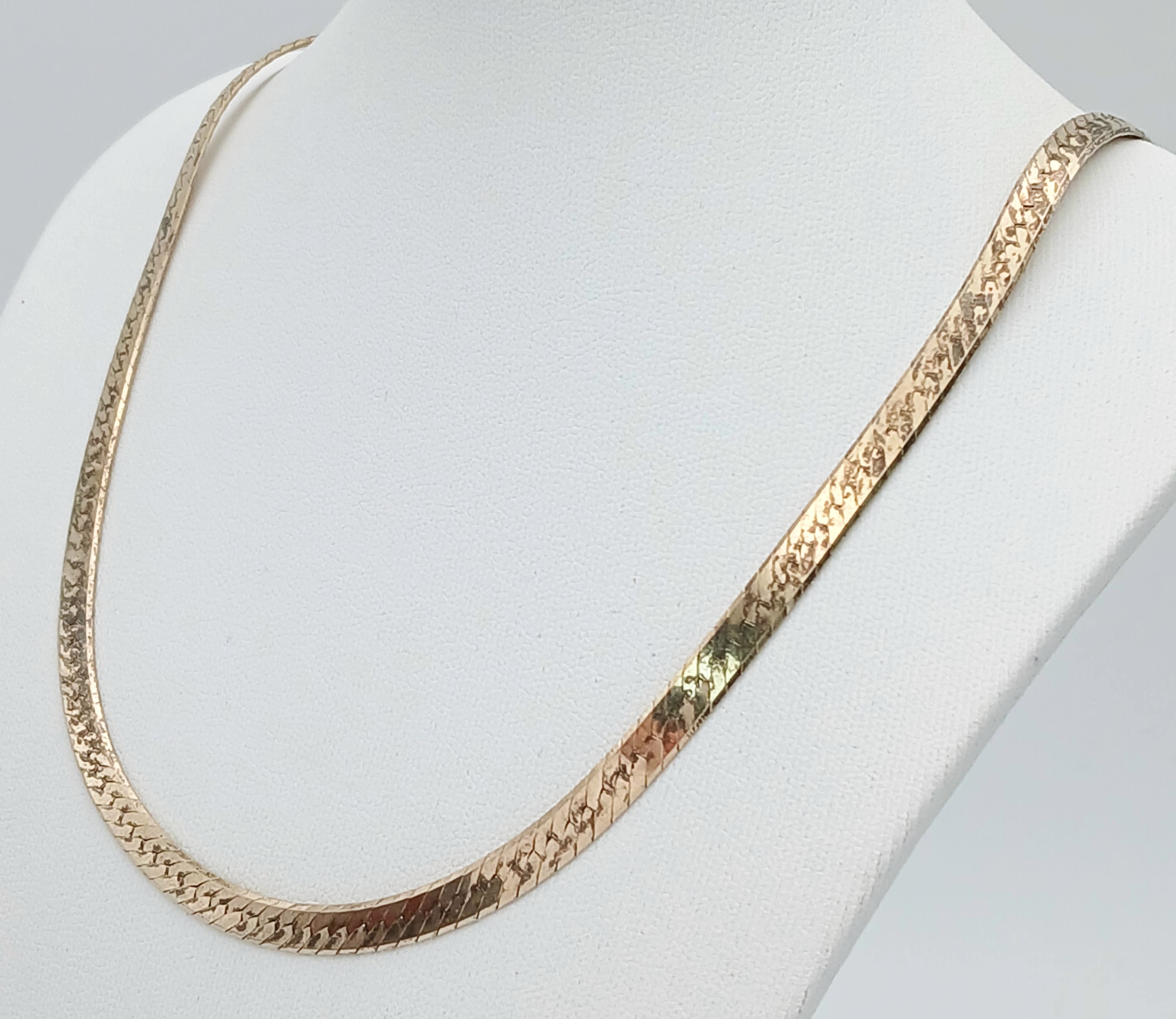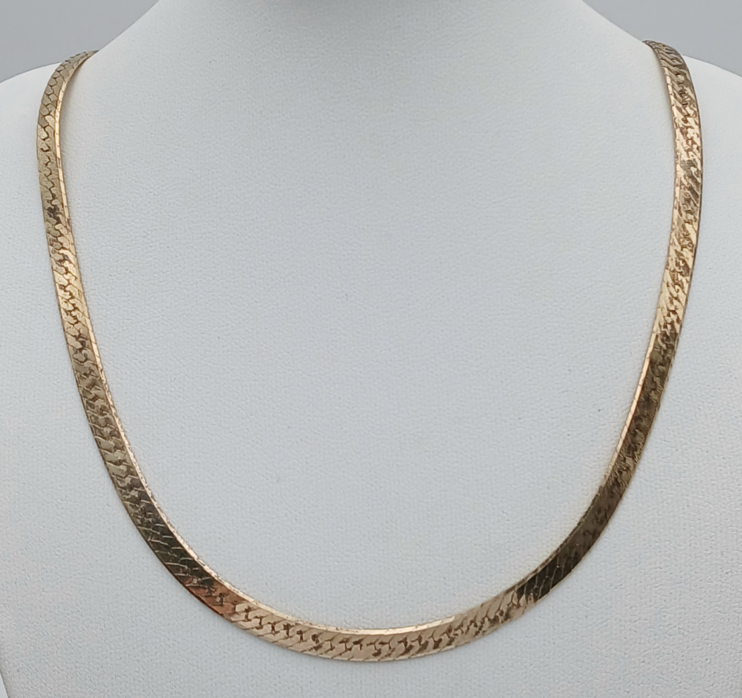 Comprising a flat herringbone style chain with textured finish and lobster clasp fastening. Comes with presentation box. Total weight: 16.54g. Please see photos for details.