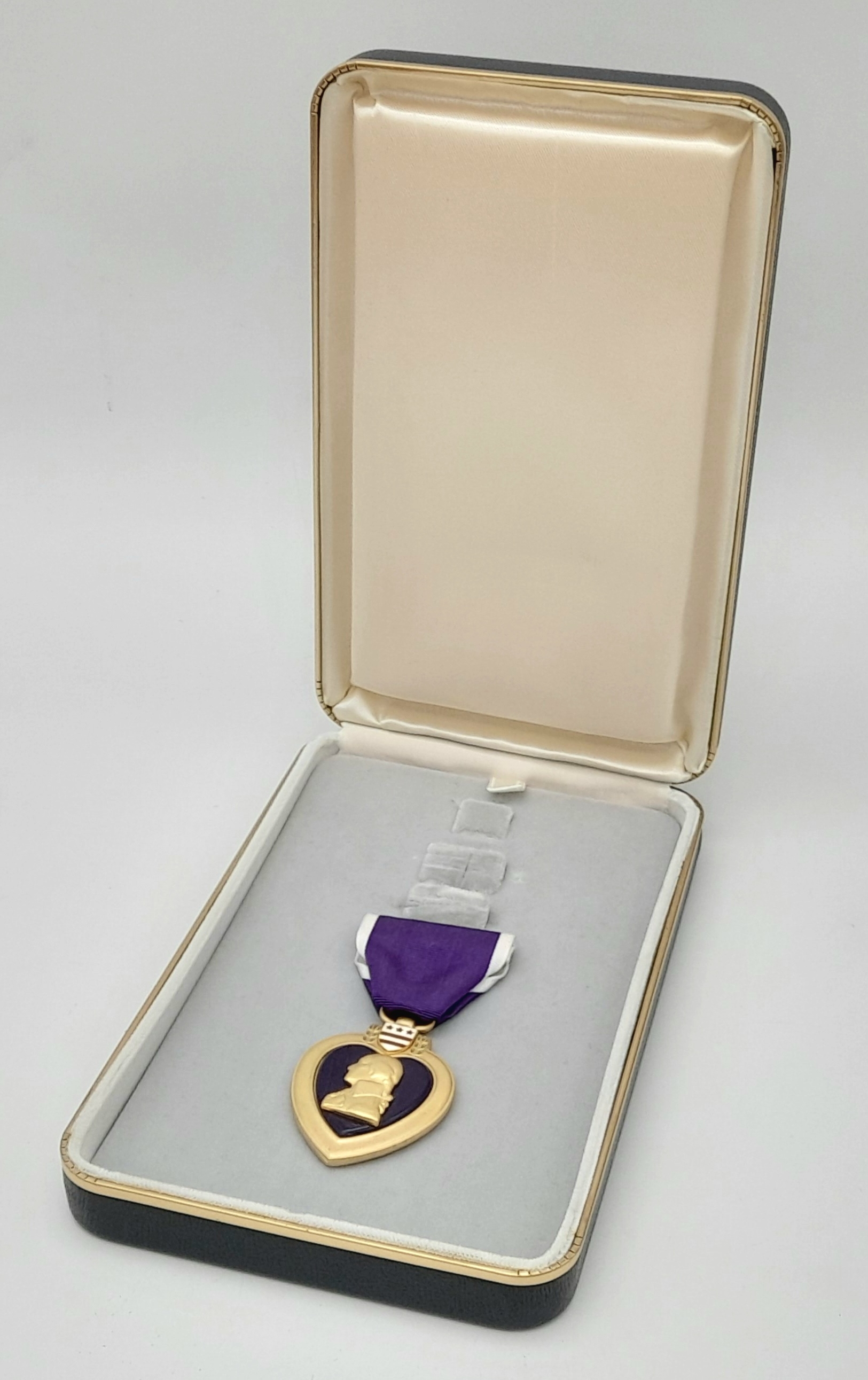 Vietnam War Era Purple Heart in original case. The ribbon bar is missing as it would have been on the soldier’s uniform.