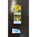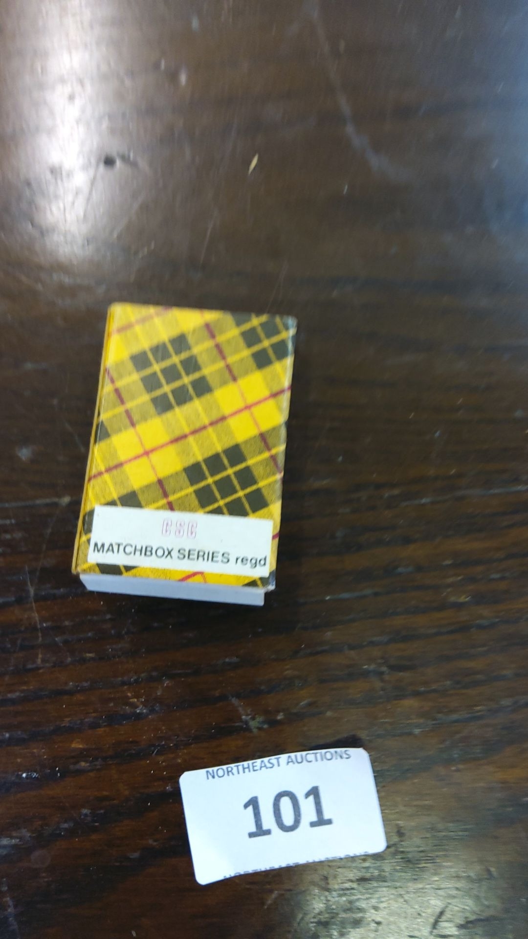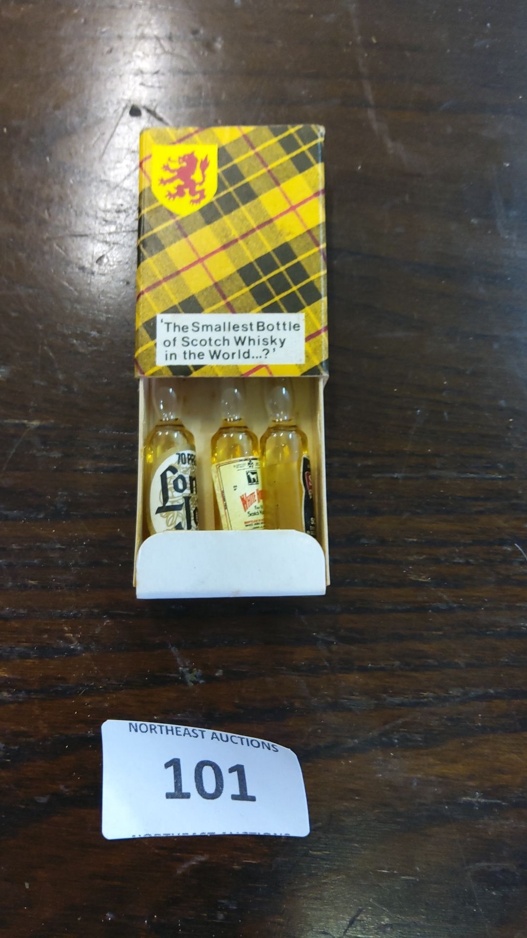 Matchbox Series featuring plaid design. Contains three small whisky bottles labeled as the smallest scotch in the world.