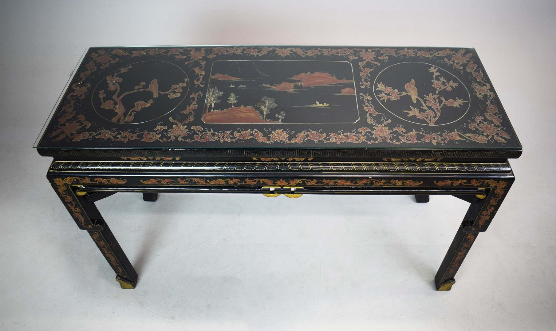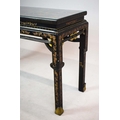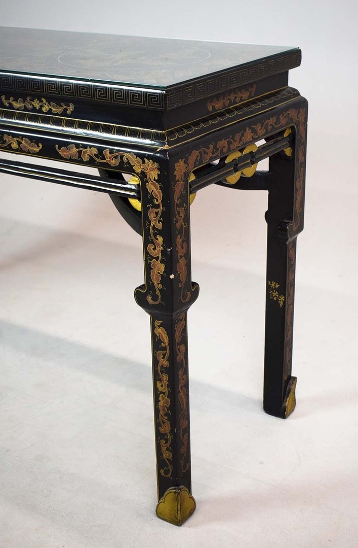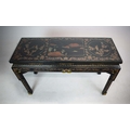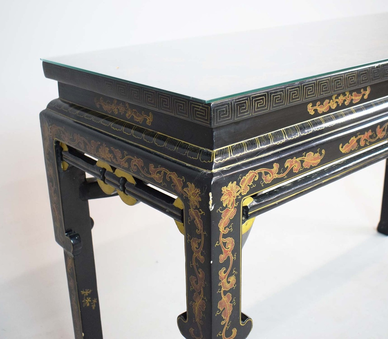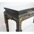 CHINESE CONSOLE TABLE. ebonised, scarlet and gilt Chinoiserie decorated, 81cm H x 129cm x 46cm.