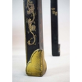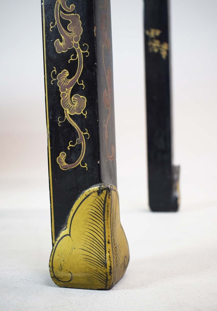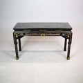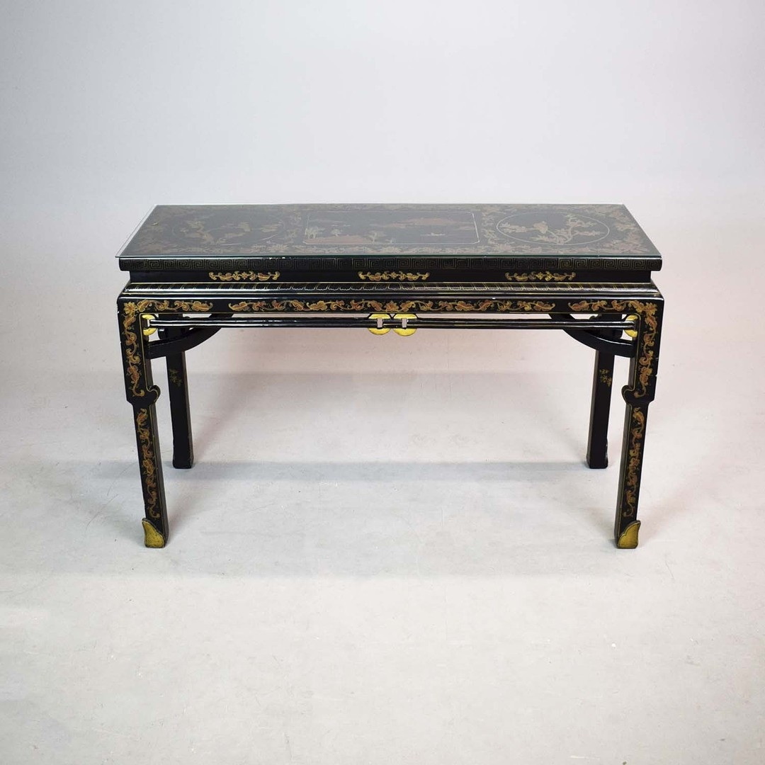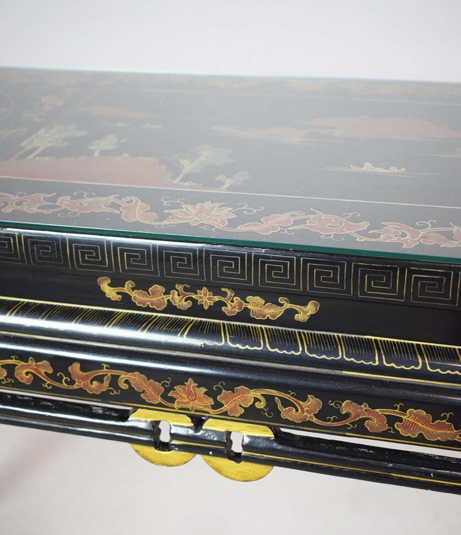 CHINESE CONSOLE TABLE. ebonised, scarlet and gilt Chinoiserie decorated, 81cm H x 129cm x 46cm.