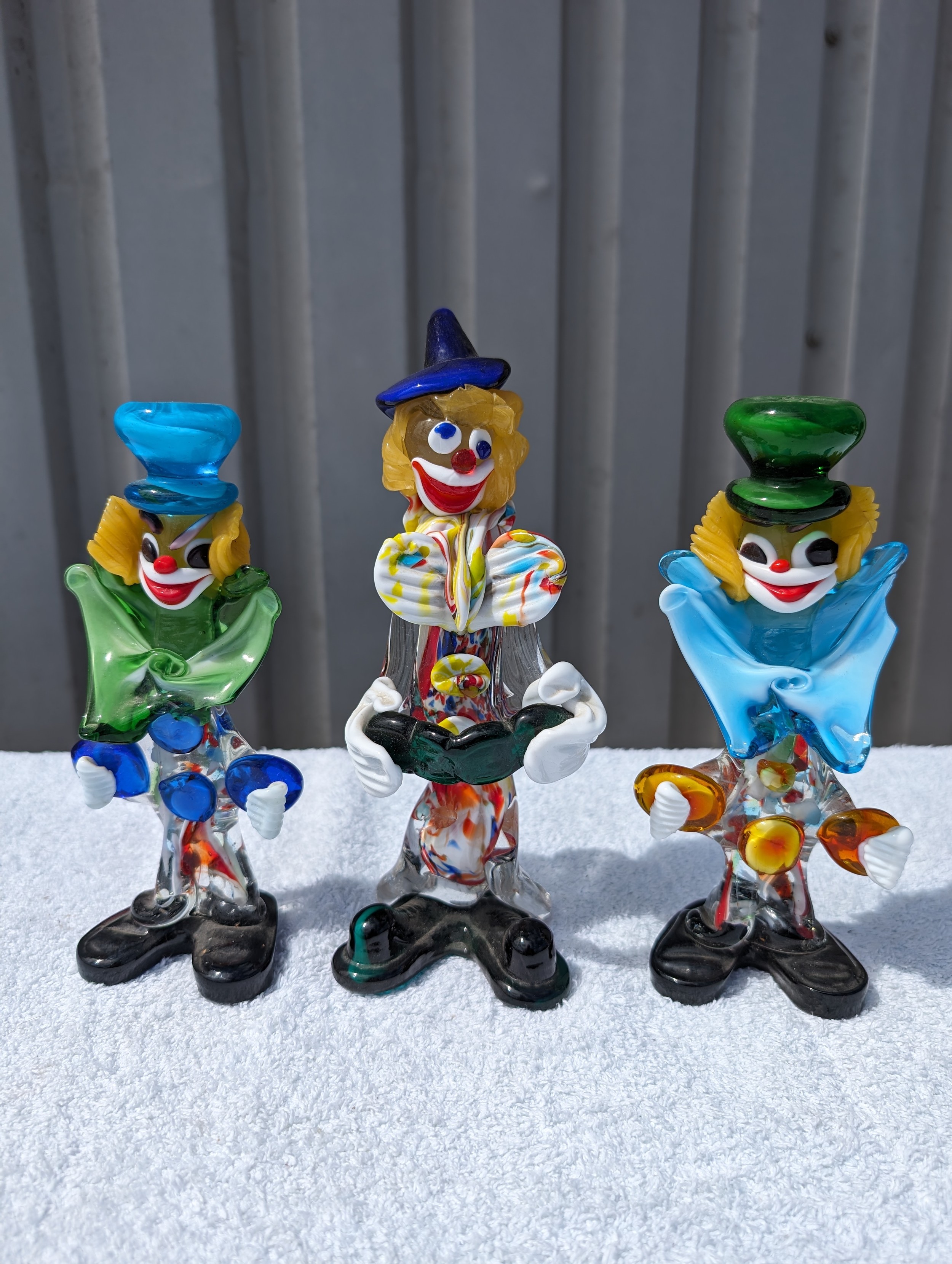 Vintage Bundle (3) Murano Style Glass Clowns 20cm - One Has Loss to Bow As Seen