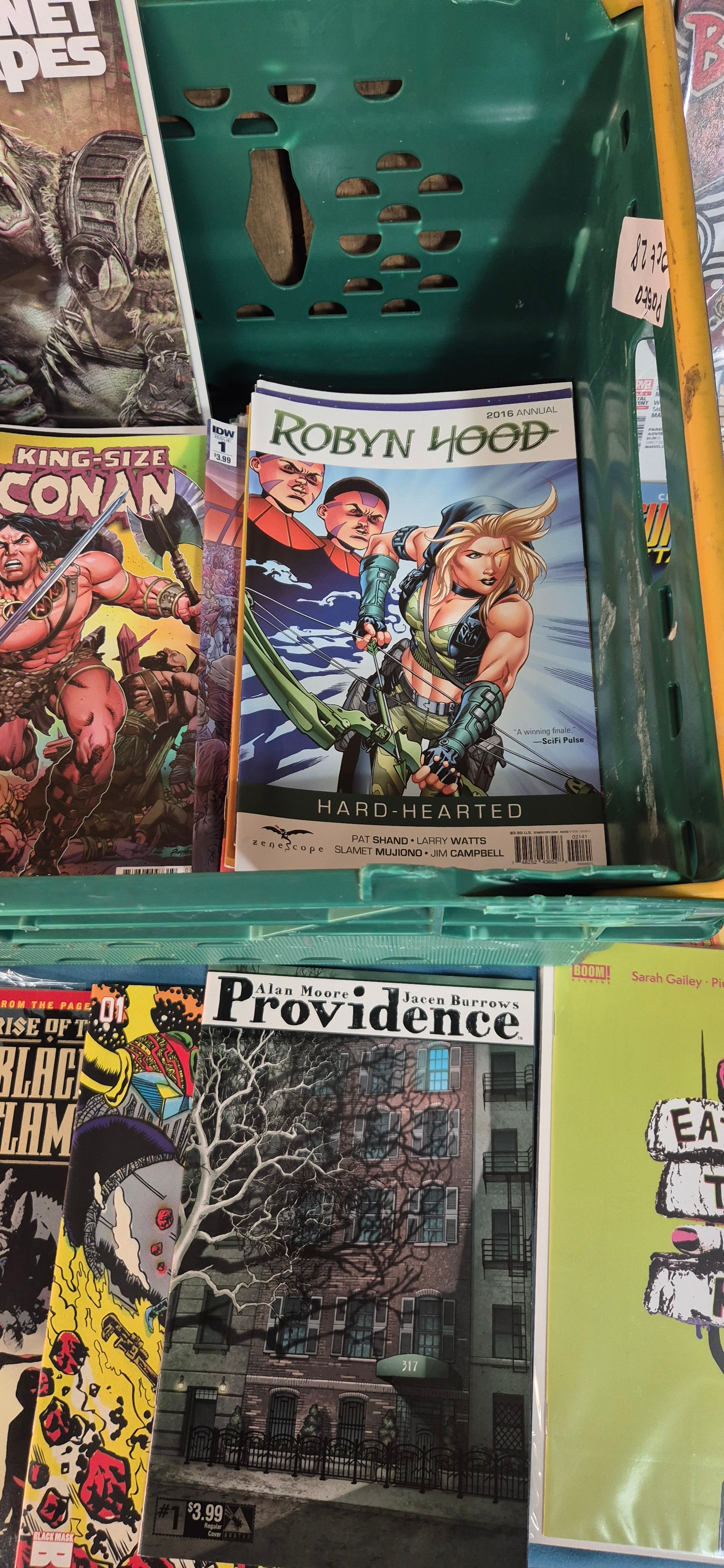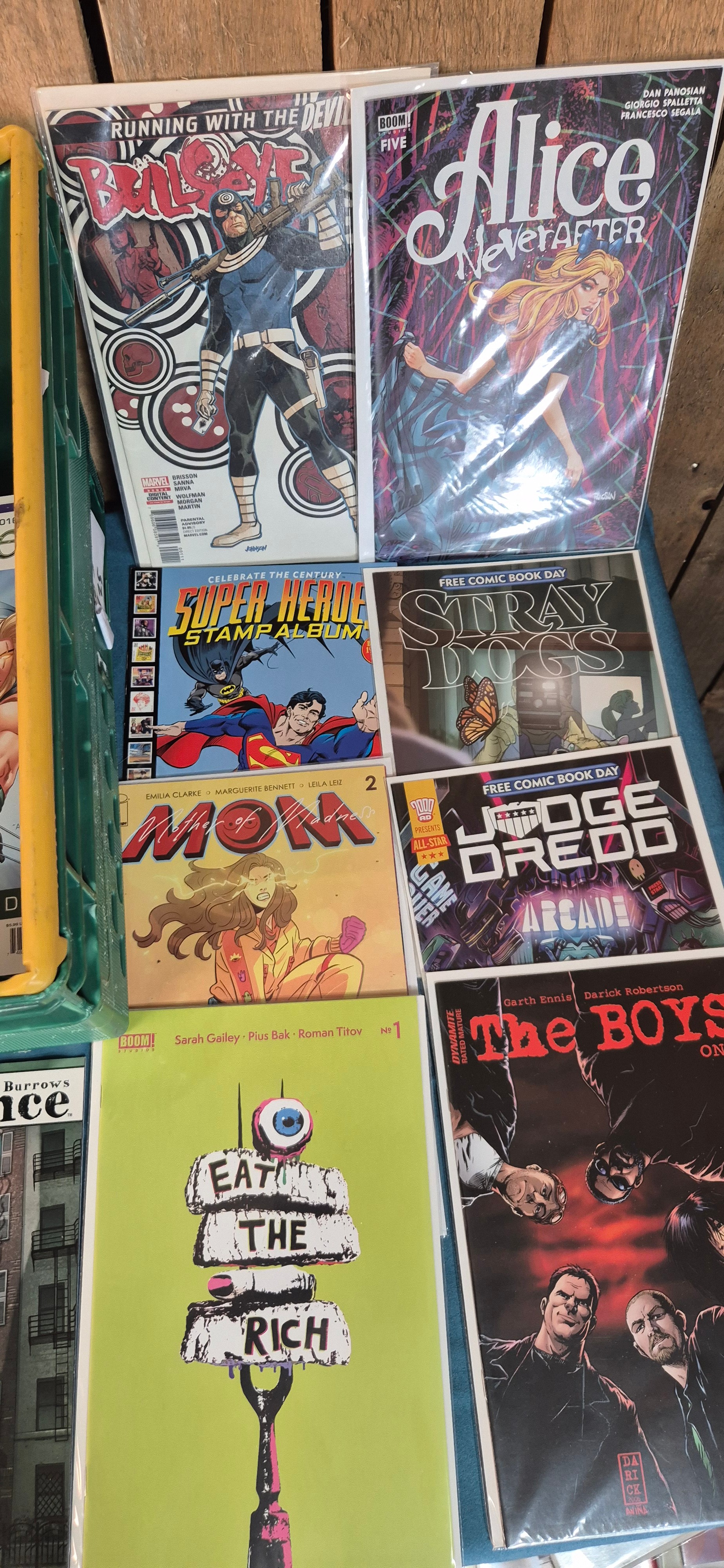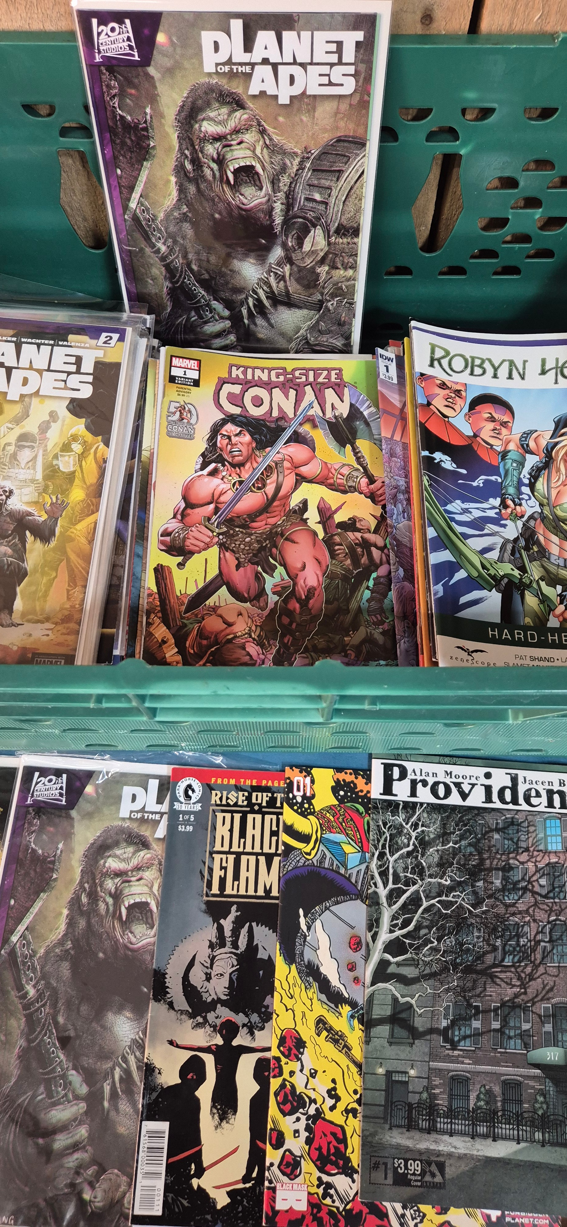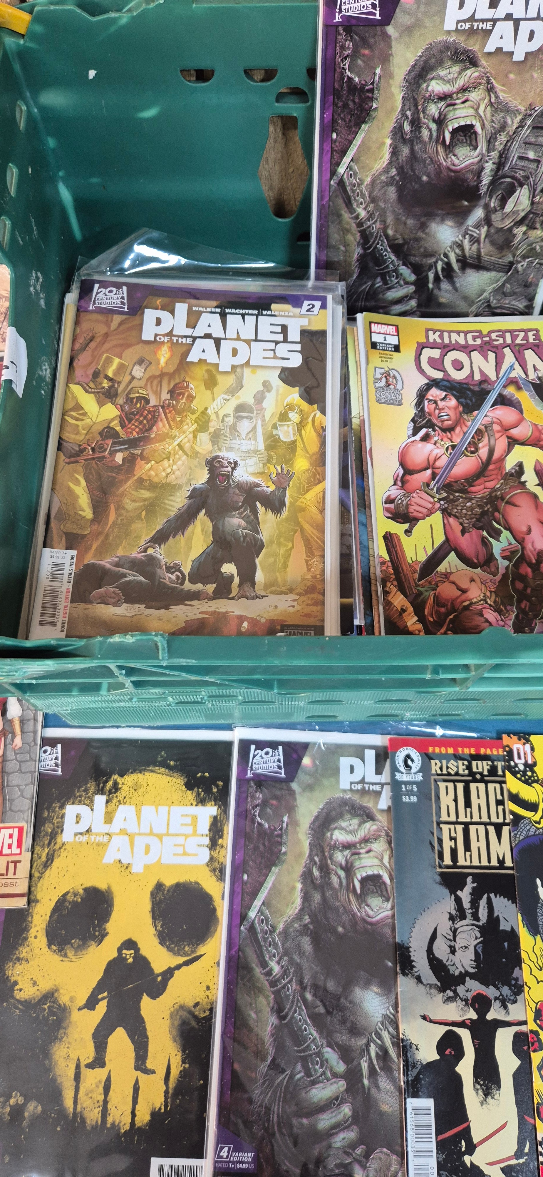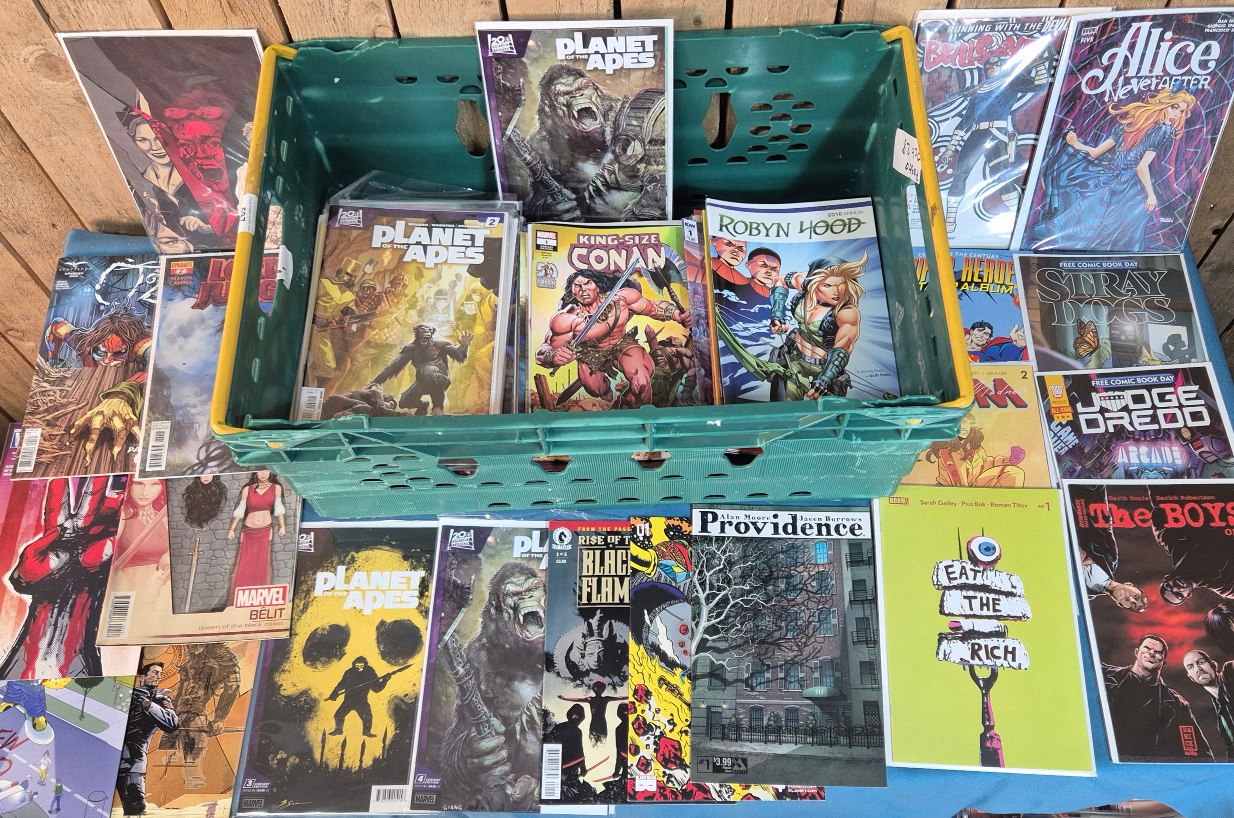 Crate of Mixed Comics; Conan, Planet Of The Apes, Jupiters Legacy, Rocketeer, Bullseye and #1 comics along with others.