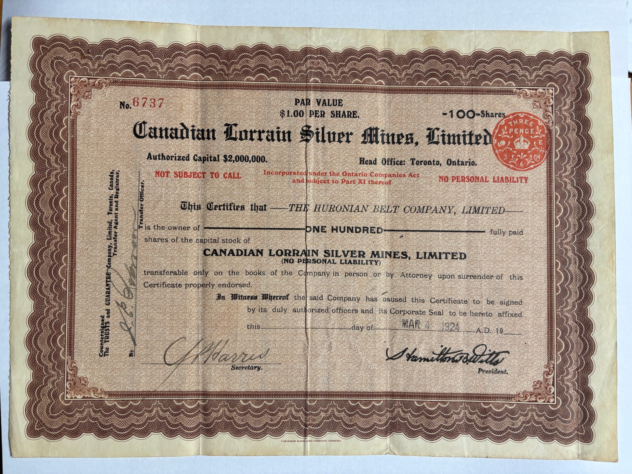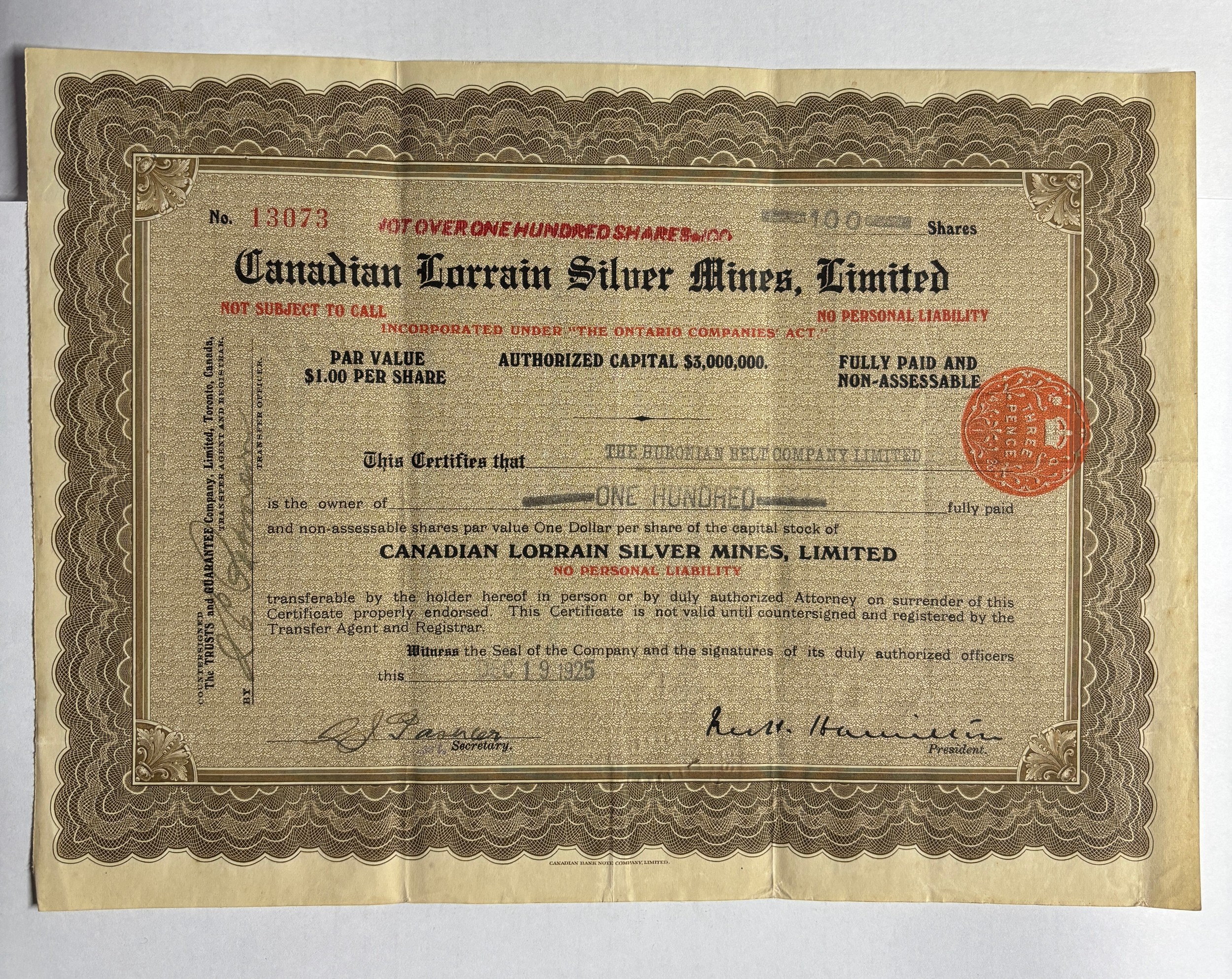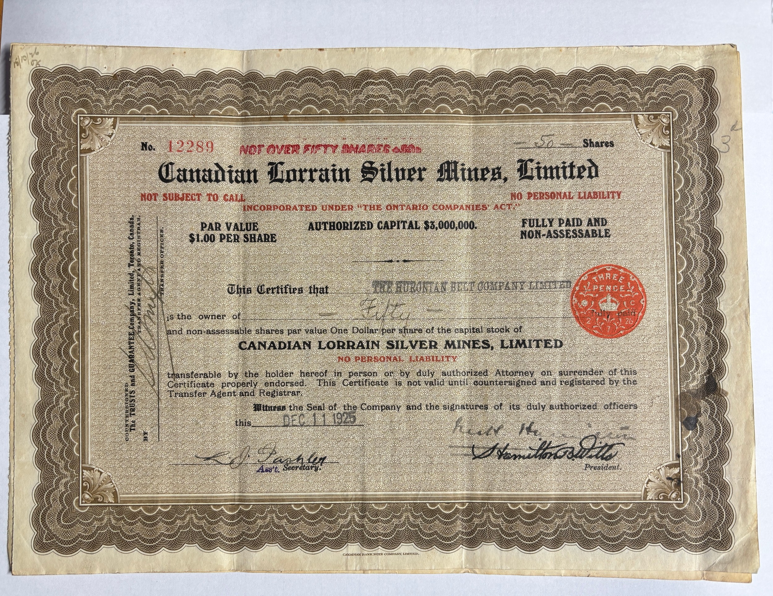 FOLDER OF CANADIAN LORRAINE SILVER MINE LIMITED SHARE CERTIFICATES 1924 AND 1925