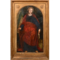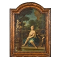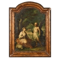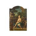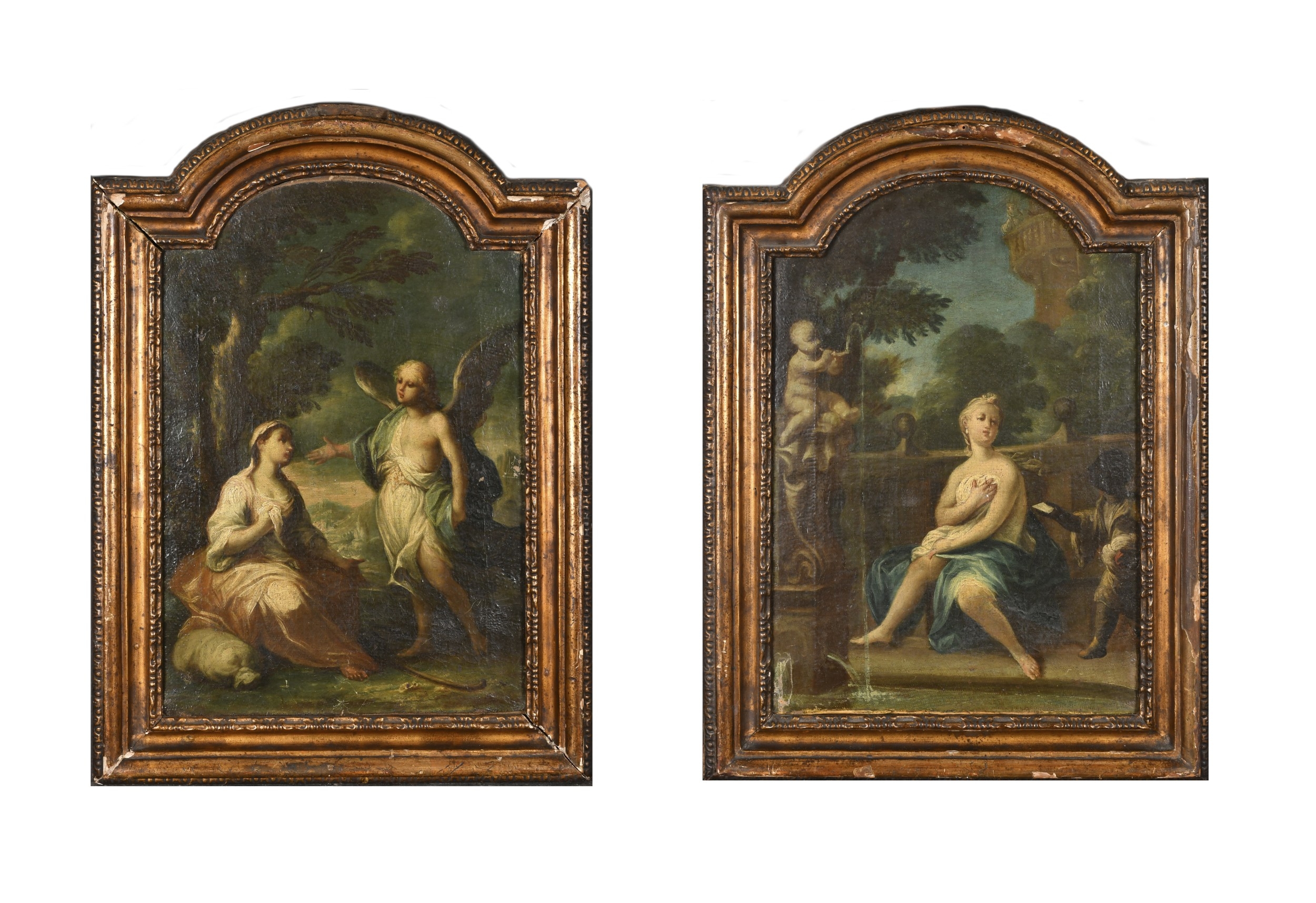 Circle of Giovanni Gioseffo dal Sole (1654-1719) Italian. An Angel appearing to a Shepherdess, Oil on canvas, Shaped 18.75" x 12.75" (47.6 x 32.4cm) and a companion piece, a pair (2)