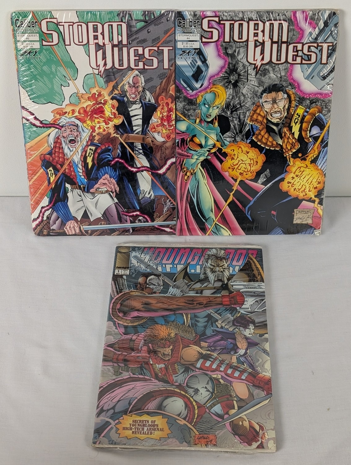 Storm Quest comic book set featuring issues #1-6 by Caliber Press, sealed in blister. Together with 4 comic sealed blister pack including Youngblood Battlezone #1 and Darker Image #1 by Image Comics.