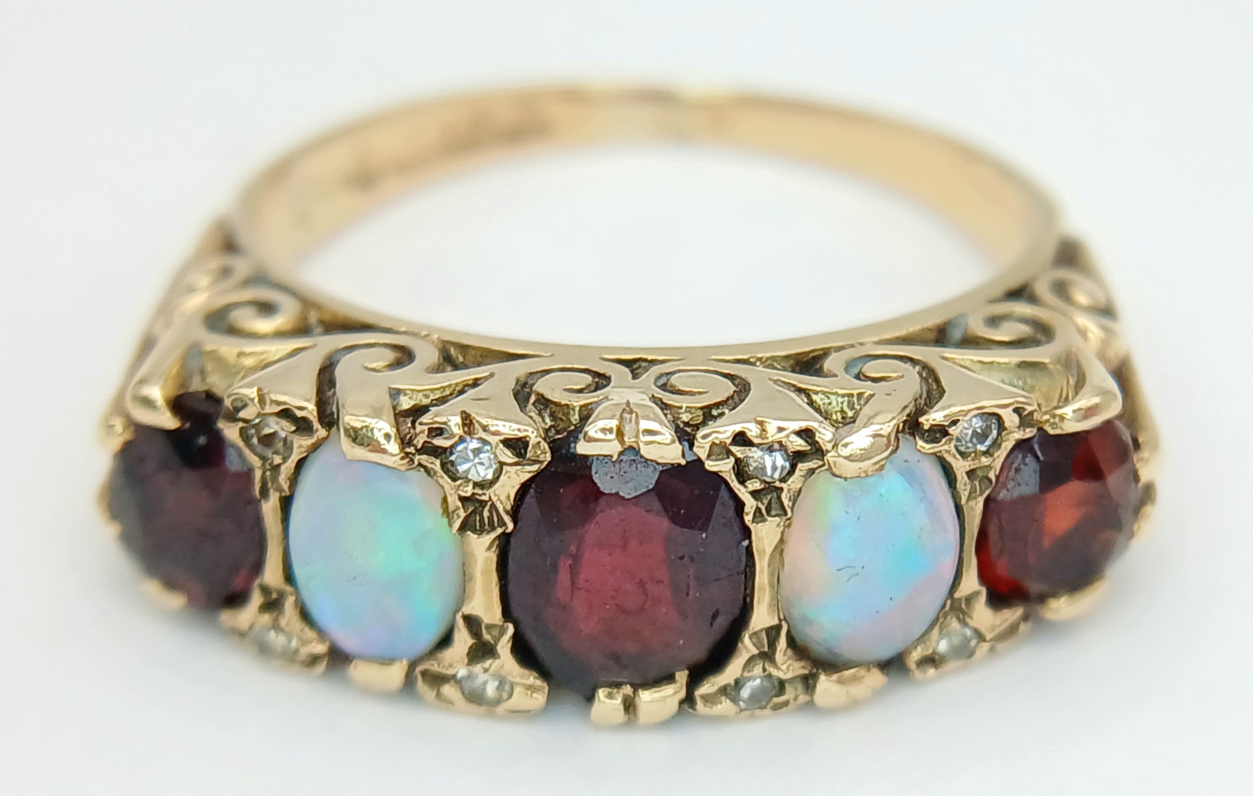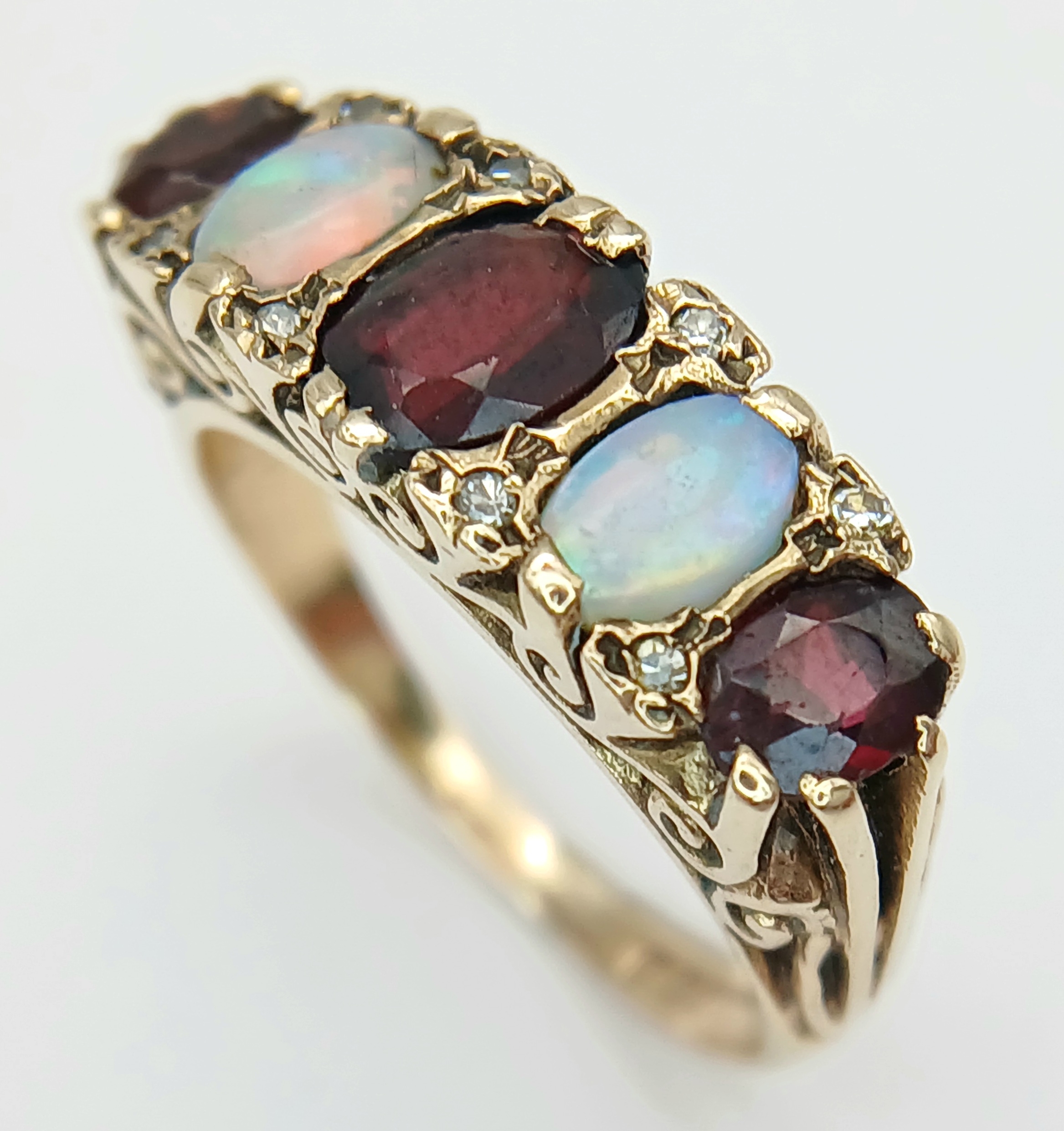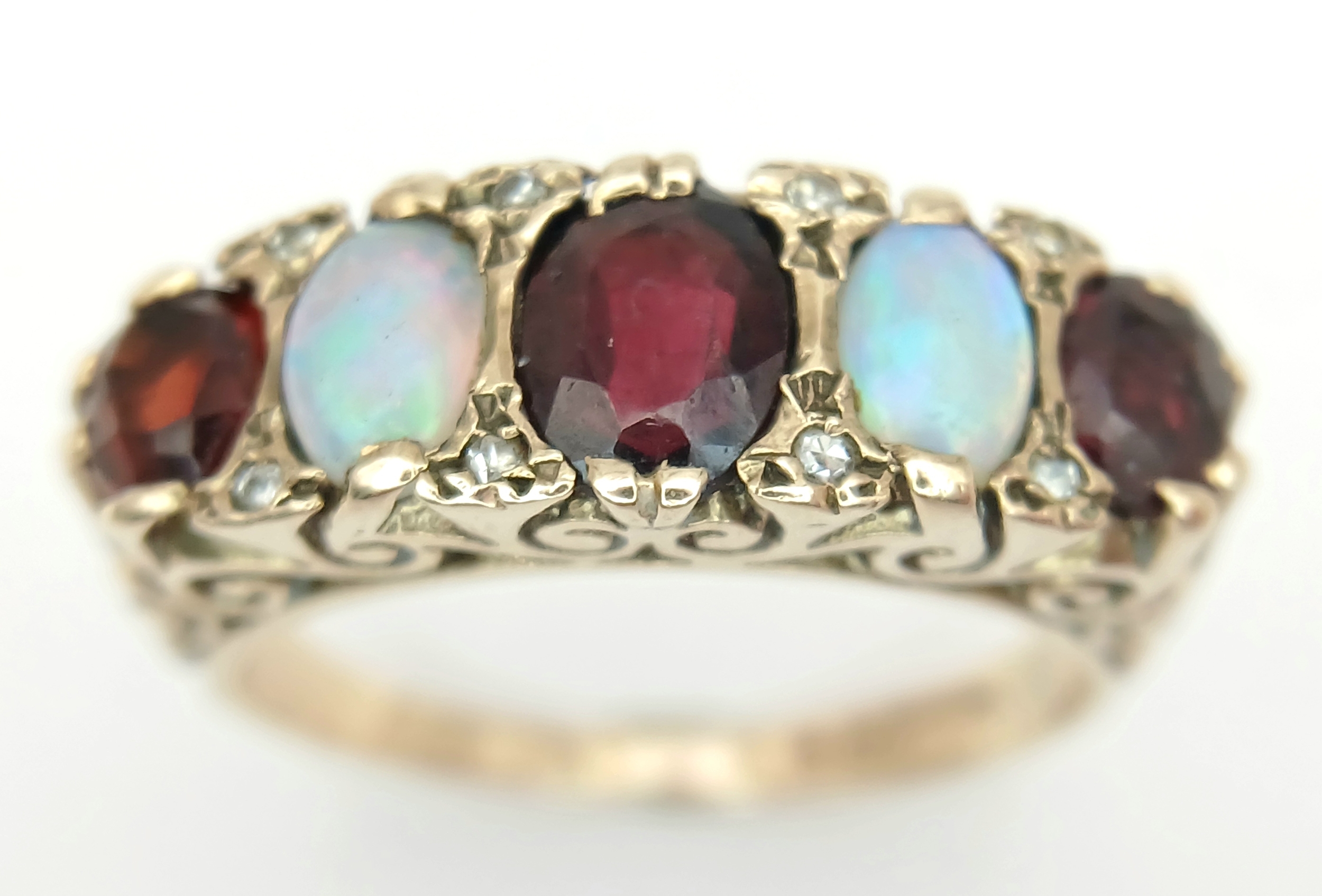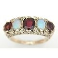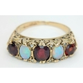 A Beautiful Antique 9K Yellow Gold, Opal and Garnet Ring. Two wonderful colour-play opals and three rich red garnets.