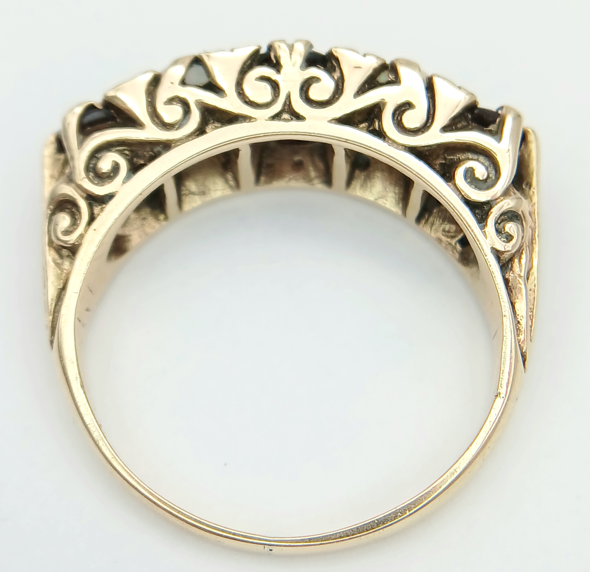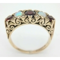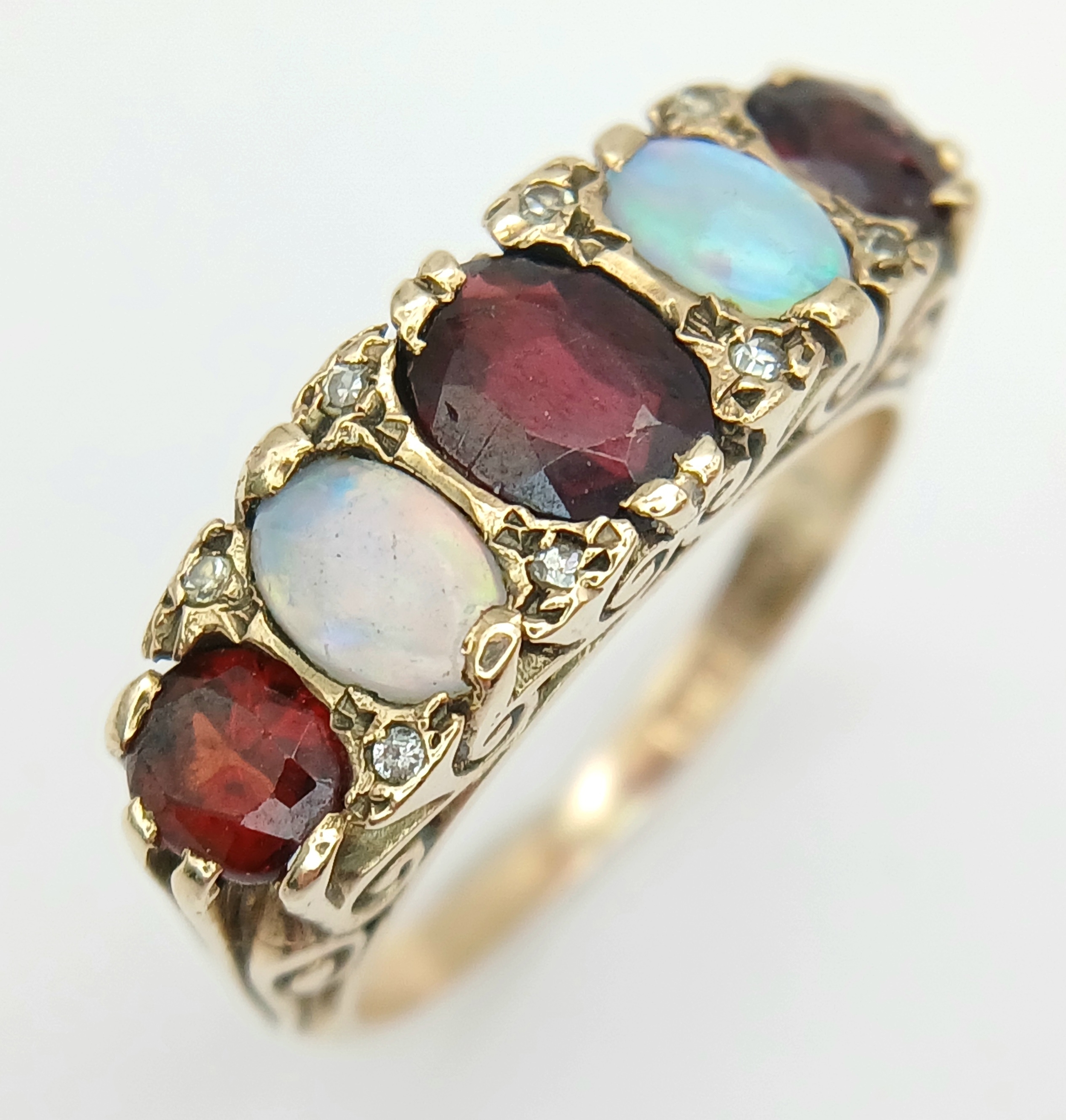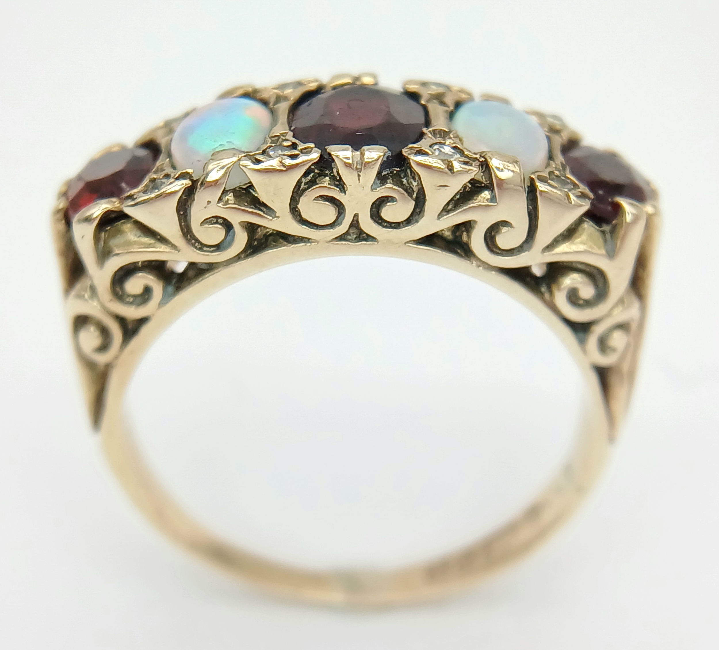 A Beautiful Antique 9K Yellow Gold, Opal and Garnet Ring. Two wonderful colour-play opals and three rich red garnets.