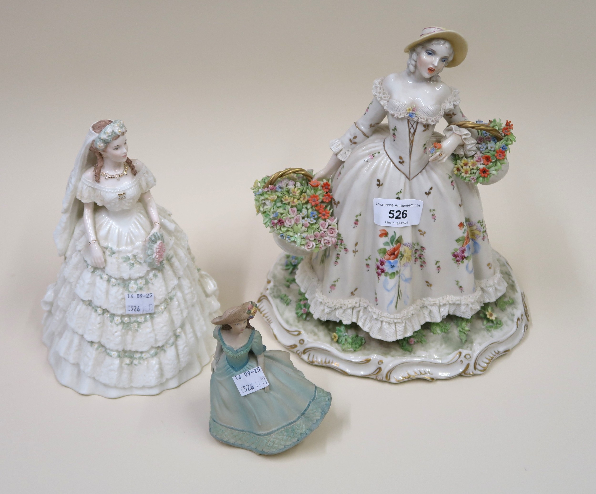 Large Italian porcelain figure of girl flower seller, together with two other similar