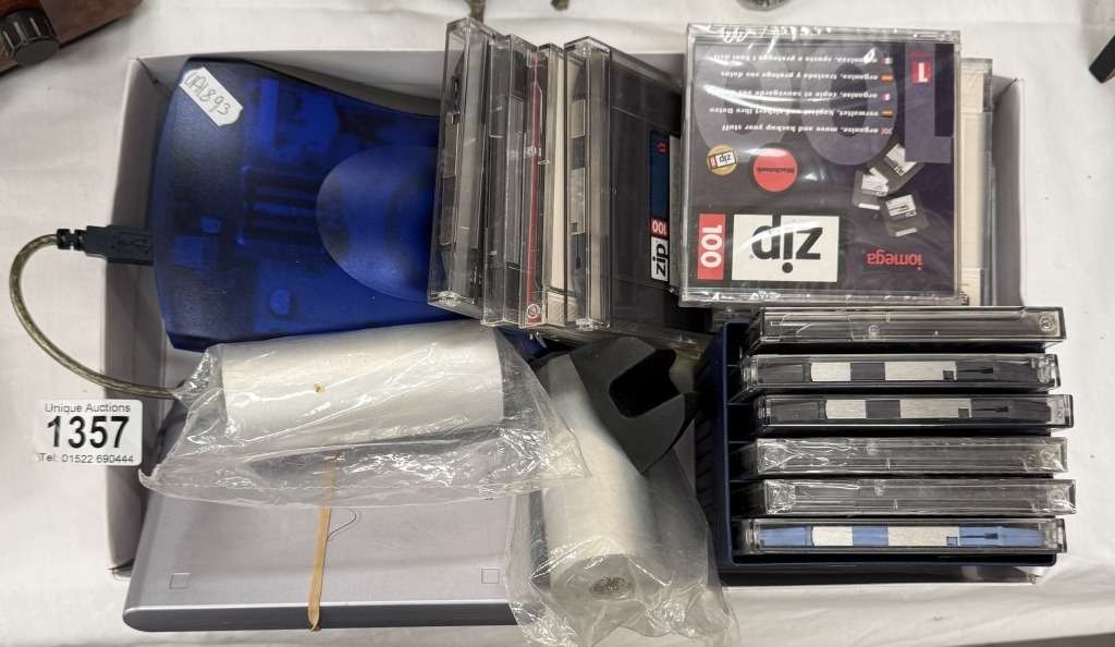 An Iomega zip 250 drive, A Sony VAIO USB floppy disc drive, Many zip disks & 2 rolls of spectrum printer paper