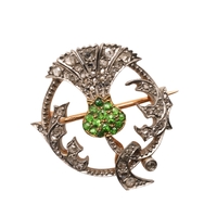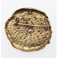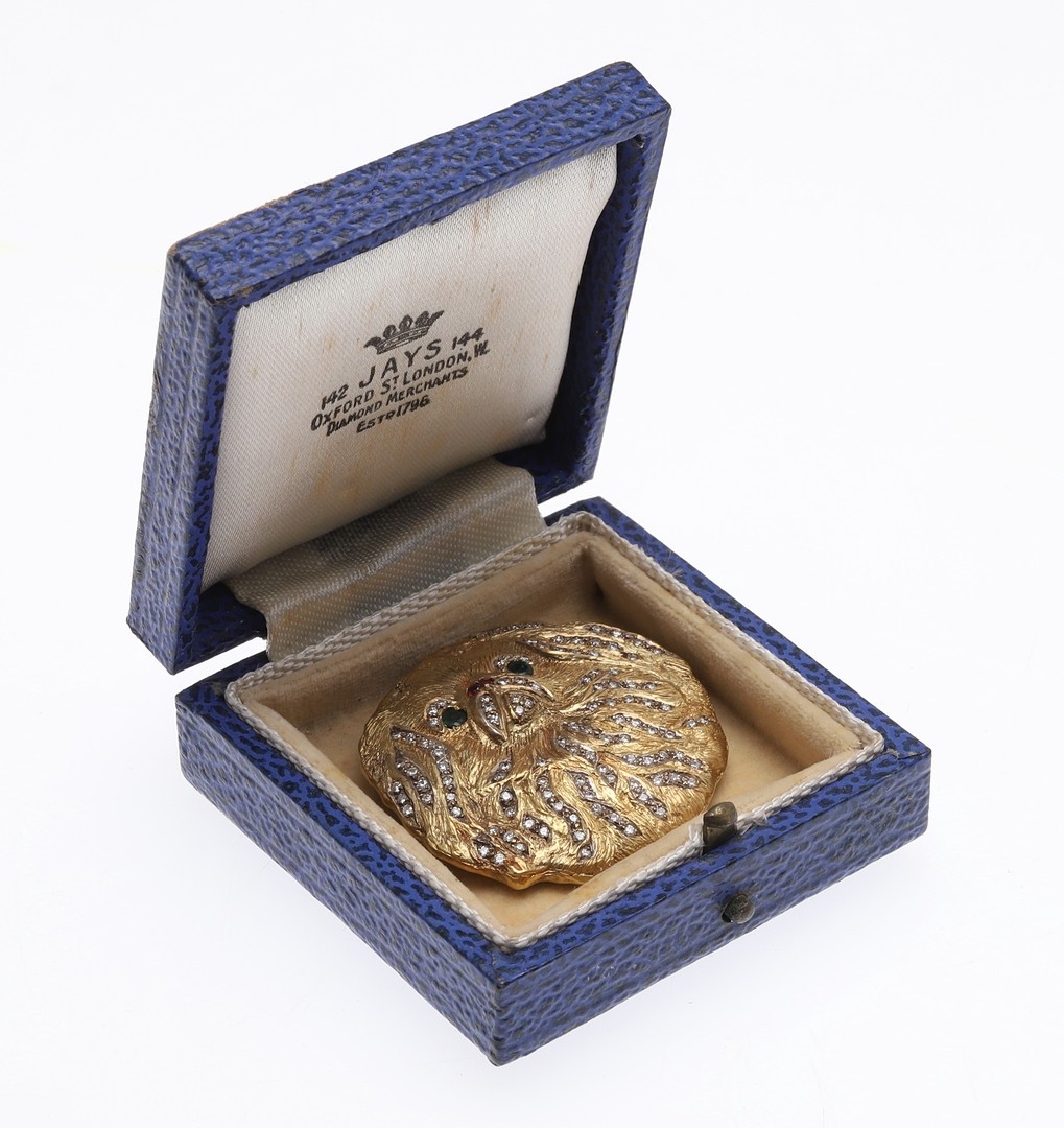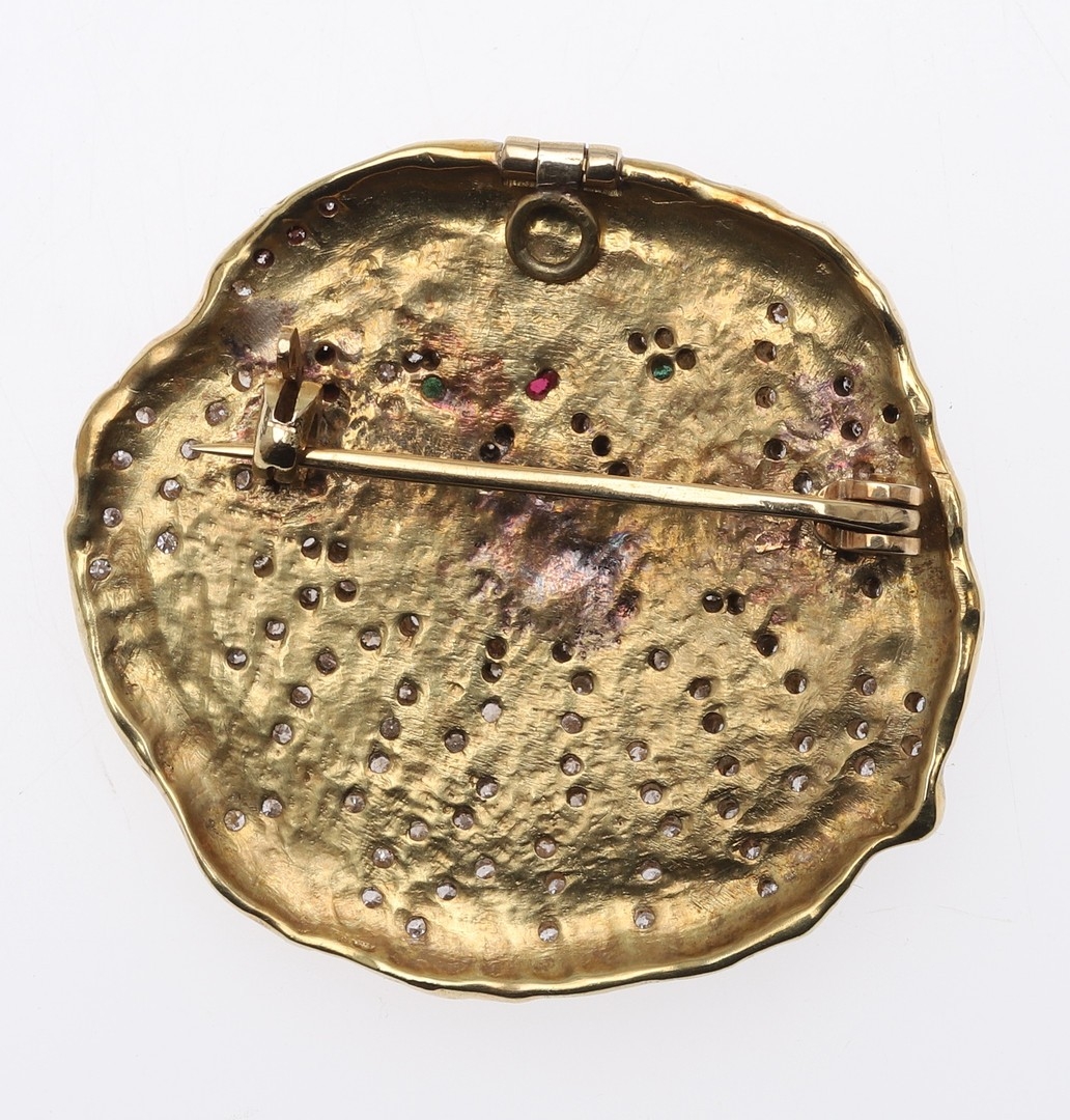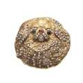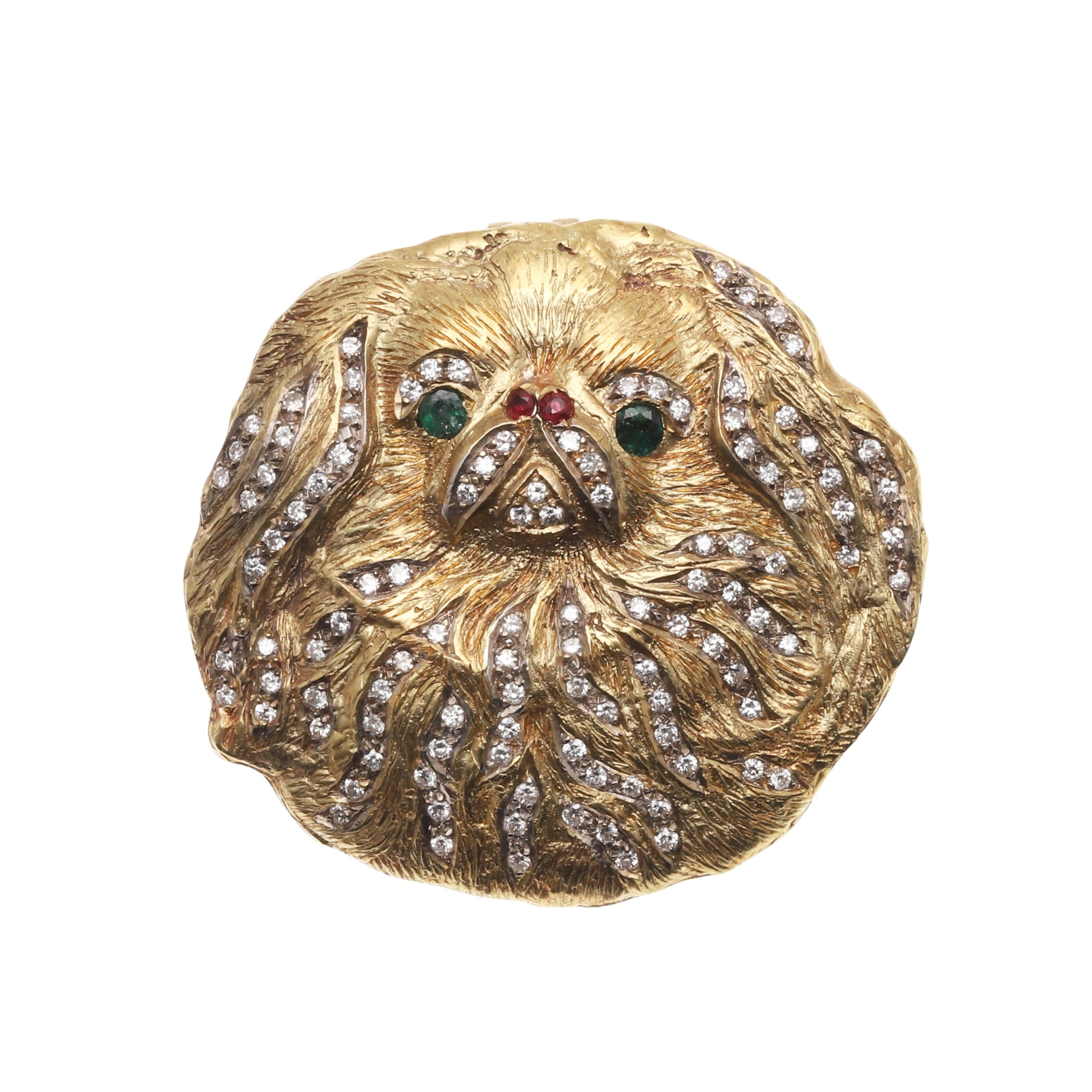 A GOLD, DIAMOND AND GEM SET PEKINGESE BROOCH. set overall with circular-cut diamonds, with green tourmaline eyes and rubies set to the nose, 4cm dia., 43.6 grams.