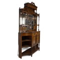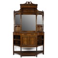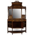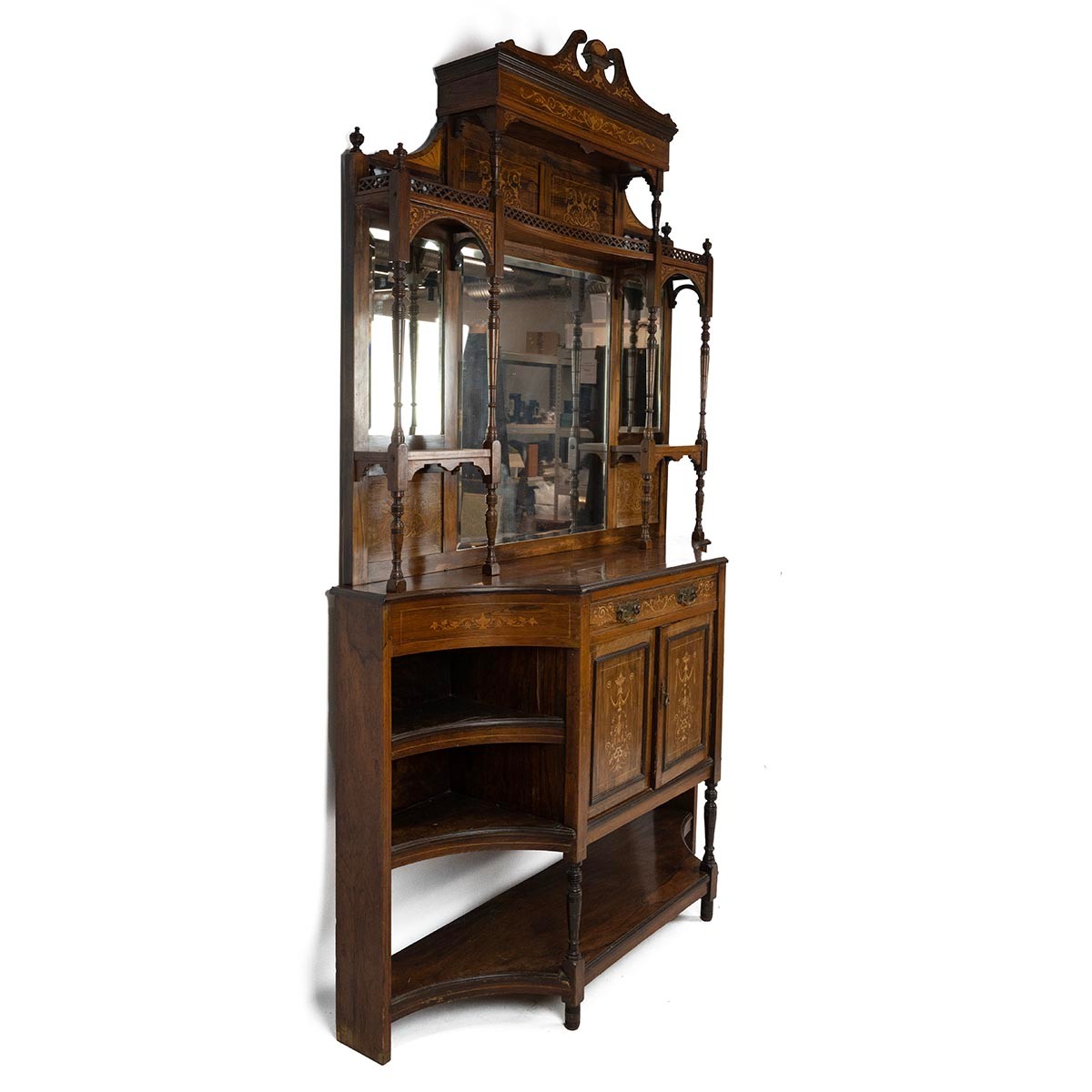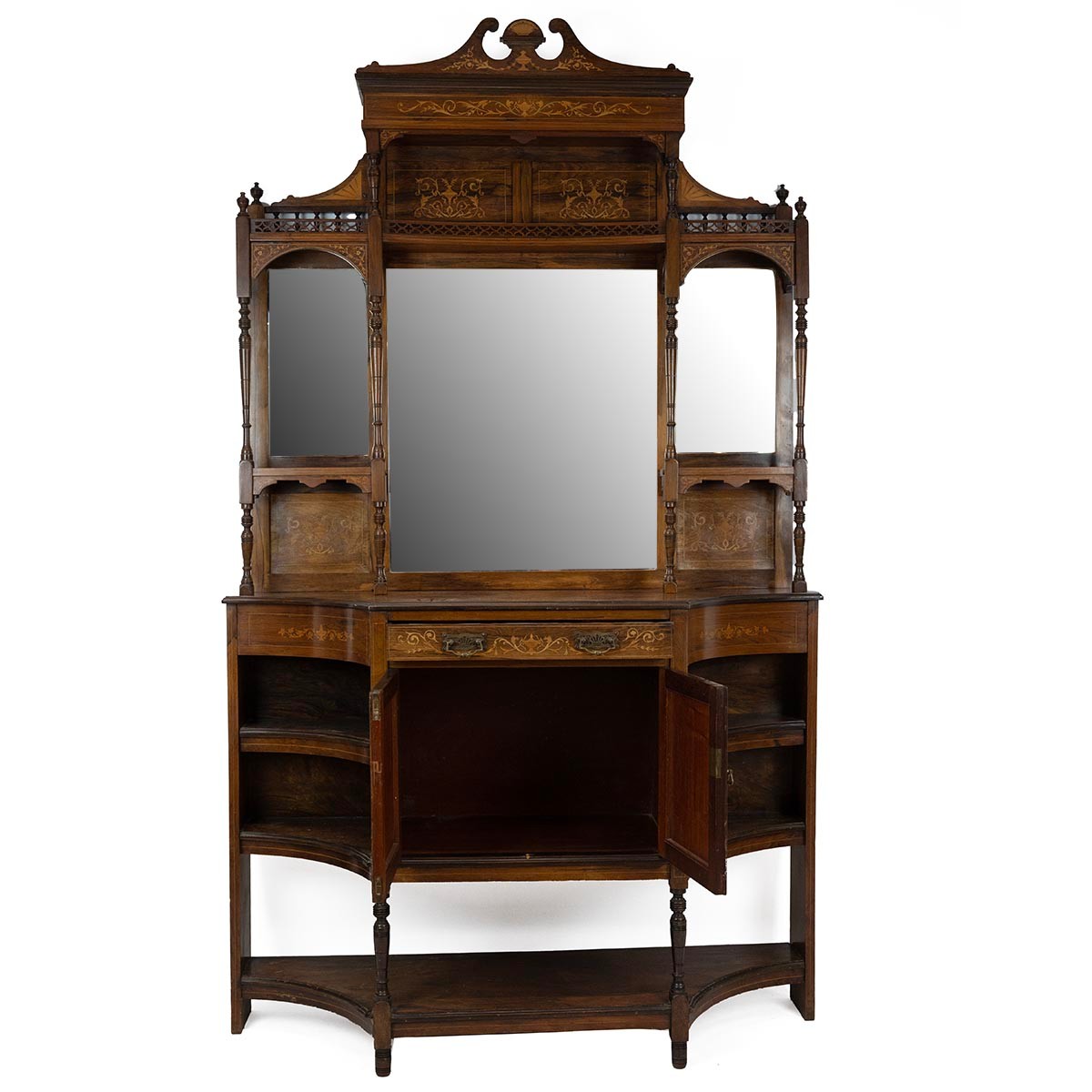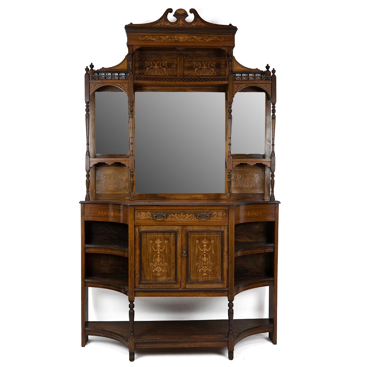 An Edwardian inlaid Sheraton Revival Rosewood Chiffonier. With open swan deck pediment above a gallery rail and pierced gallery shelf and mirrored back, flanked by two candle shelves with turned supports. The base with central single drawer and a two door cupboard flanked by concave shelves and an under tier raised on turned supports. H235cm.