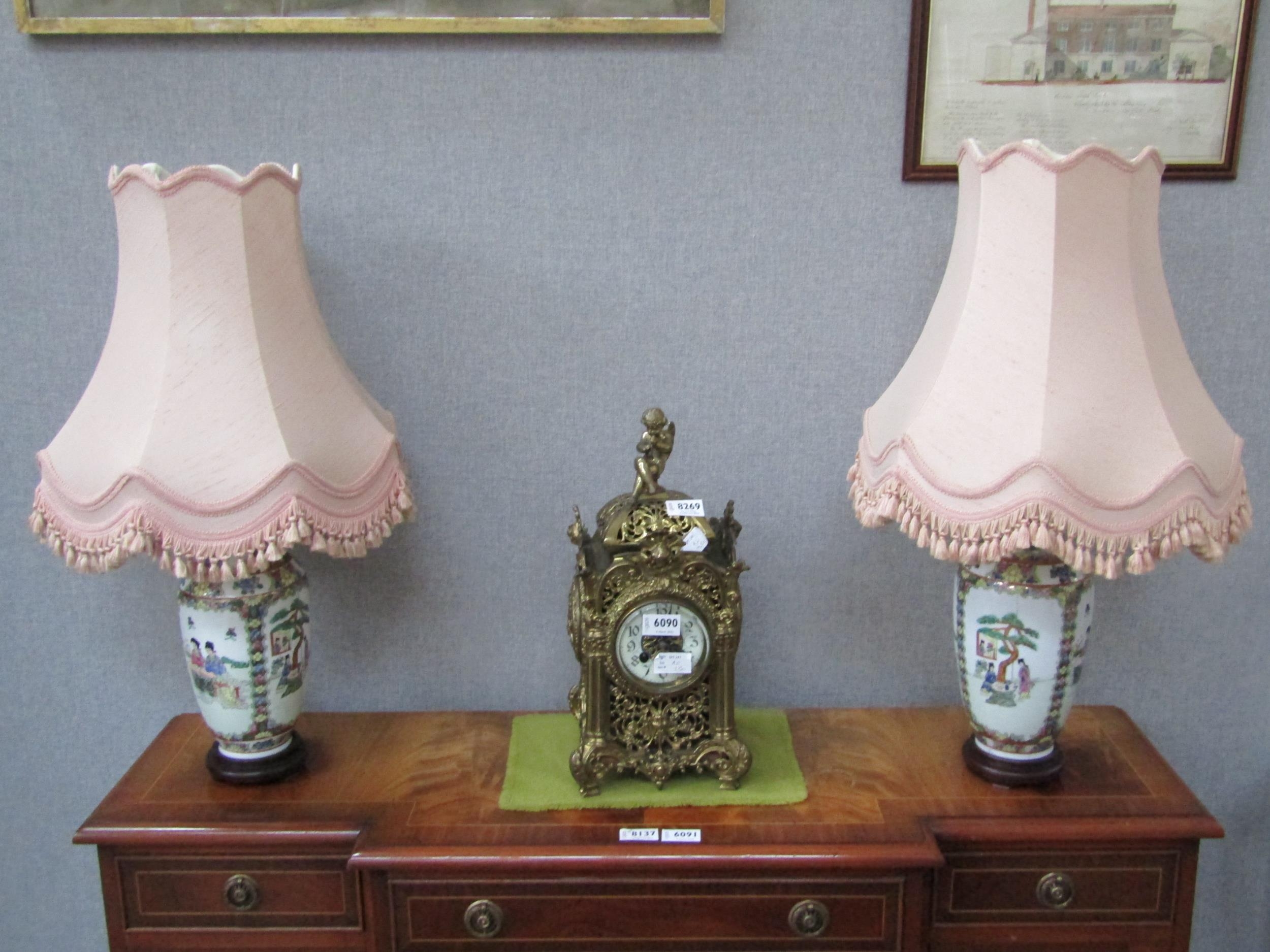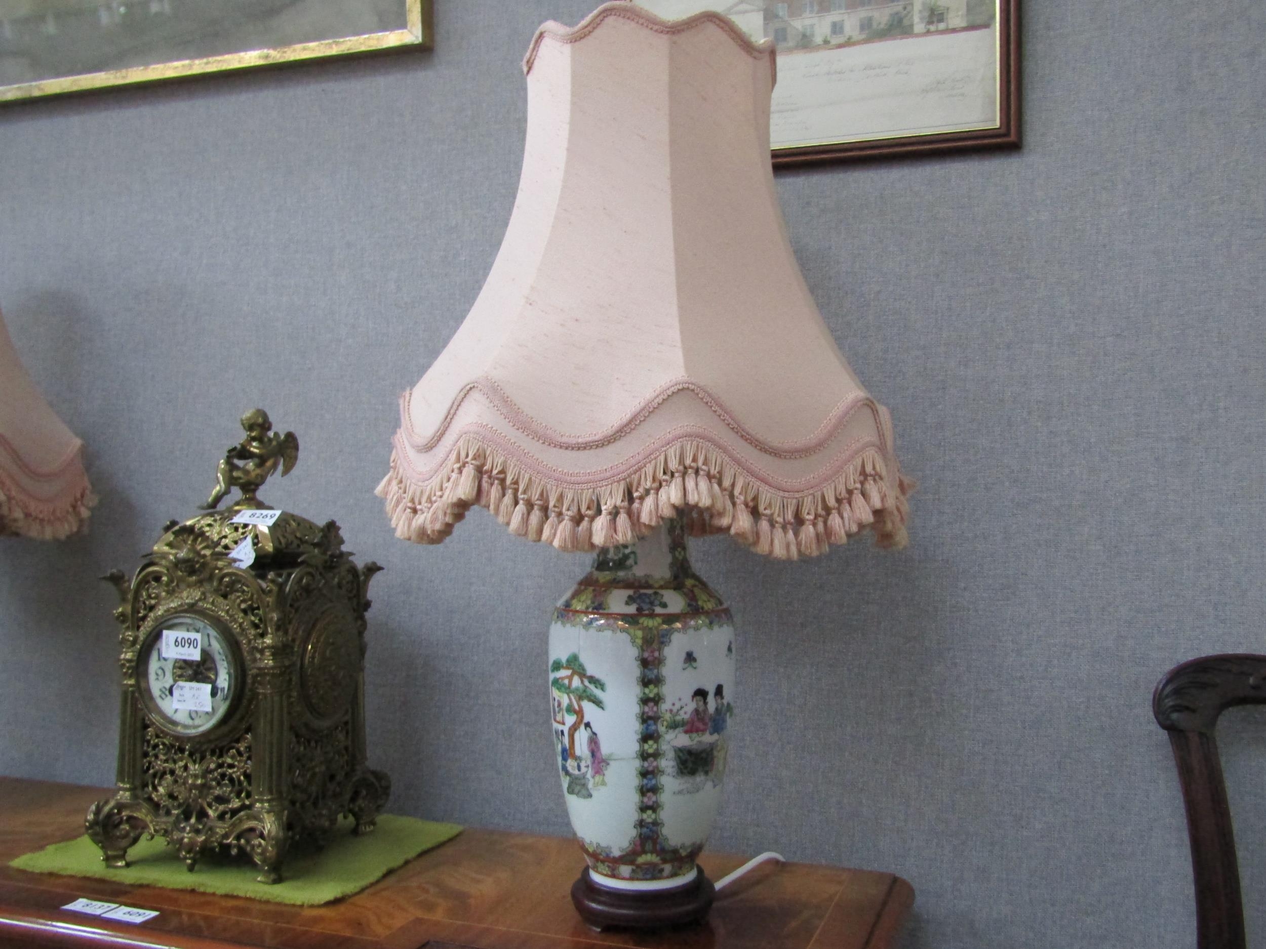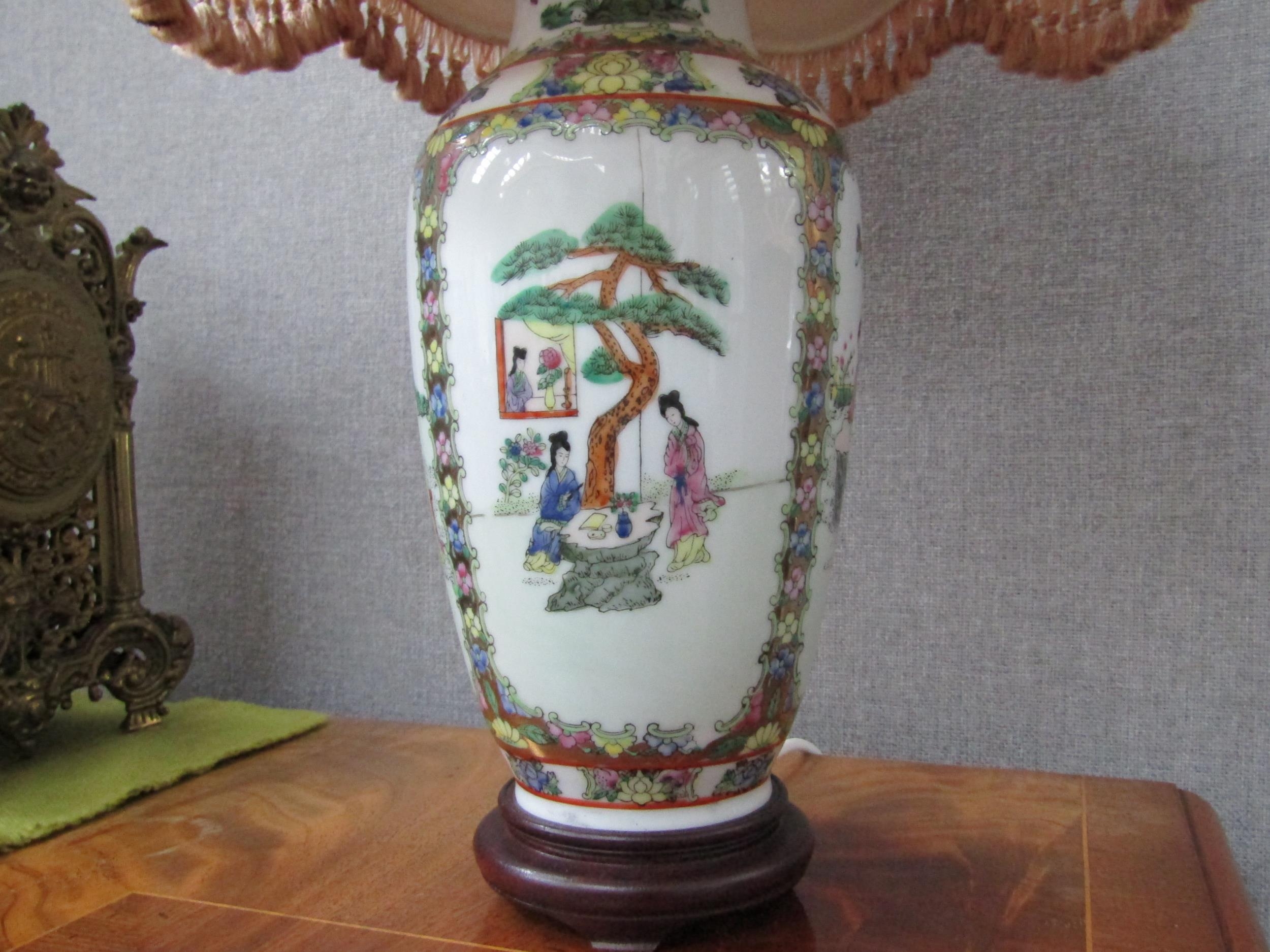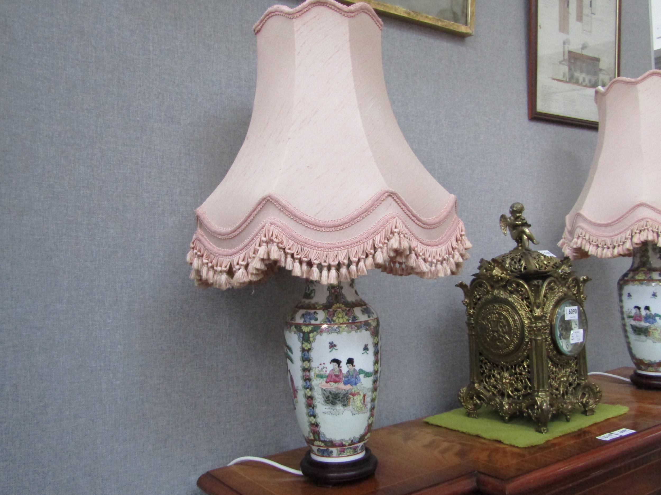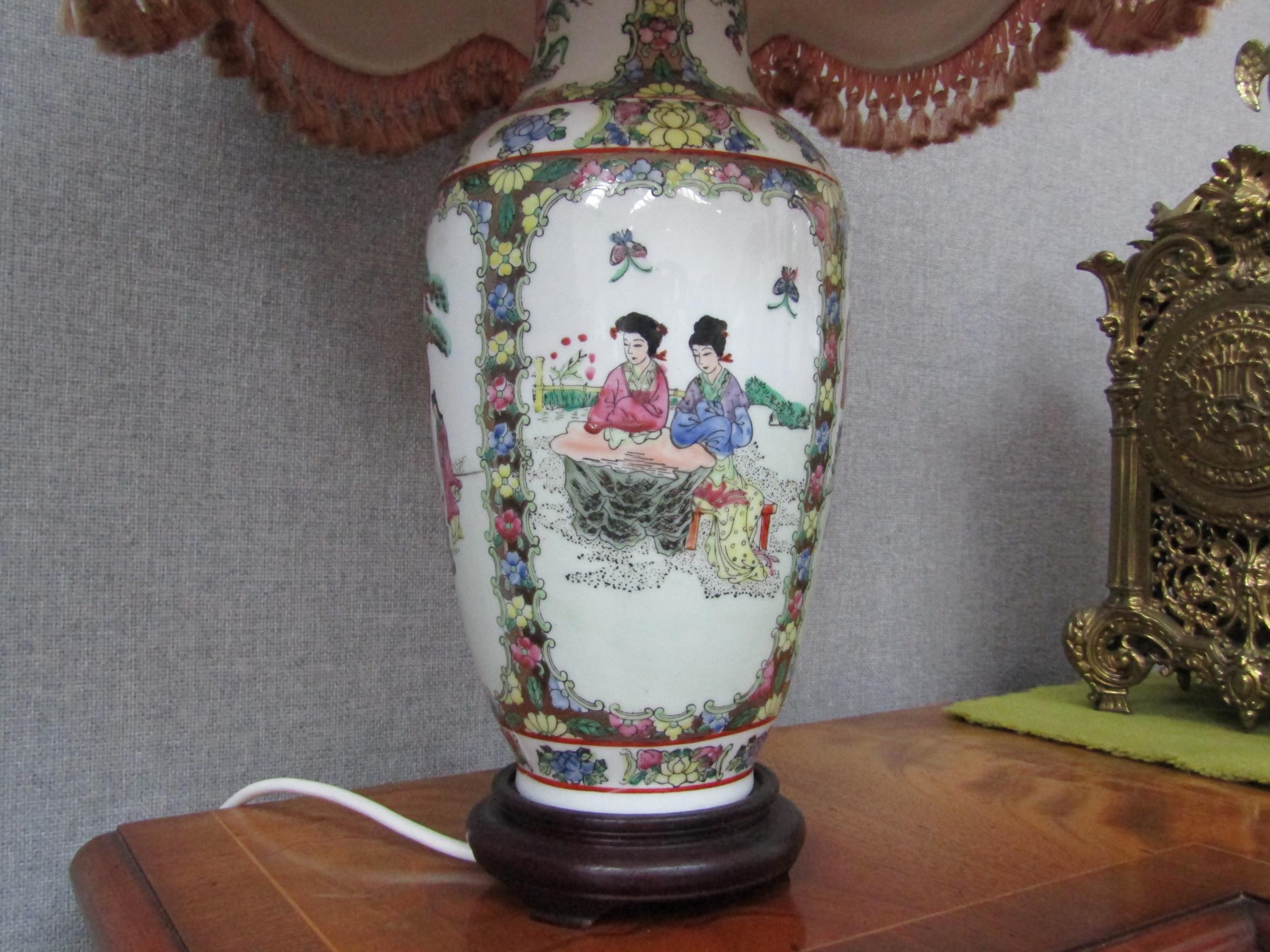 A pair of modern Oriental vase form table lamps with frilled shades, 64cm tall, Collectors Electrical Item, see Information Pages (E) 30-50
