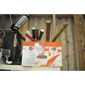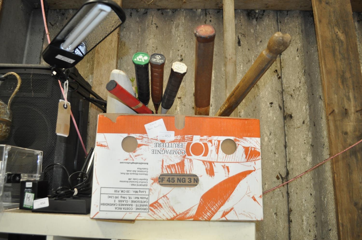 A BOX CONTAINING A NUMBER OF VINTAGE SPORTING ITEMS INCLUDING TENNIS RACKETS, CHILD'S CRICKET BAT, BADMINTON RACKETS ETC.