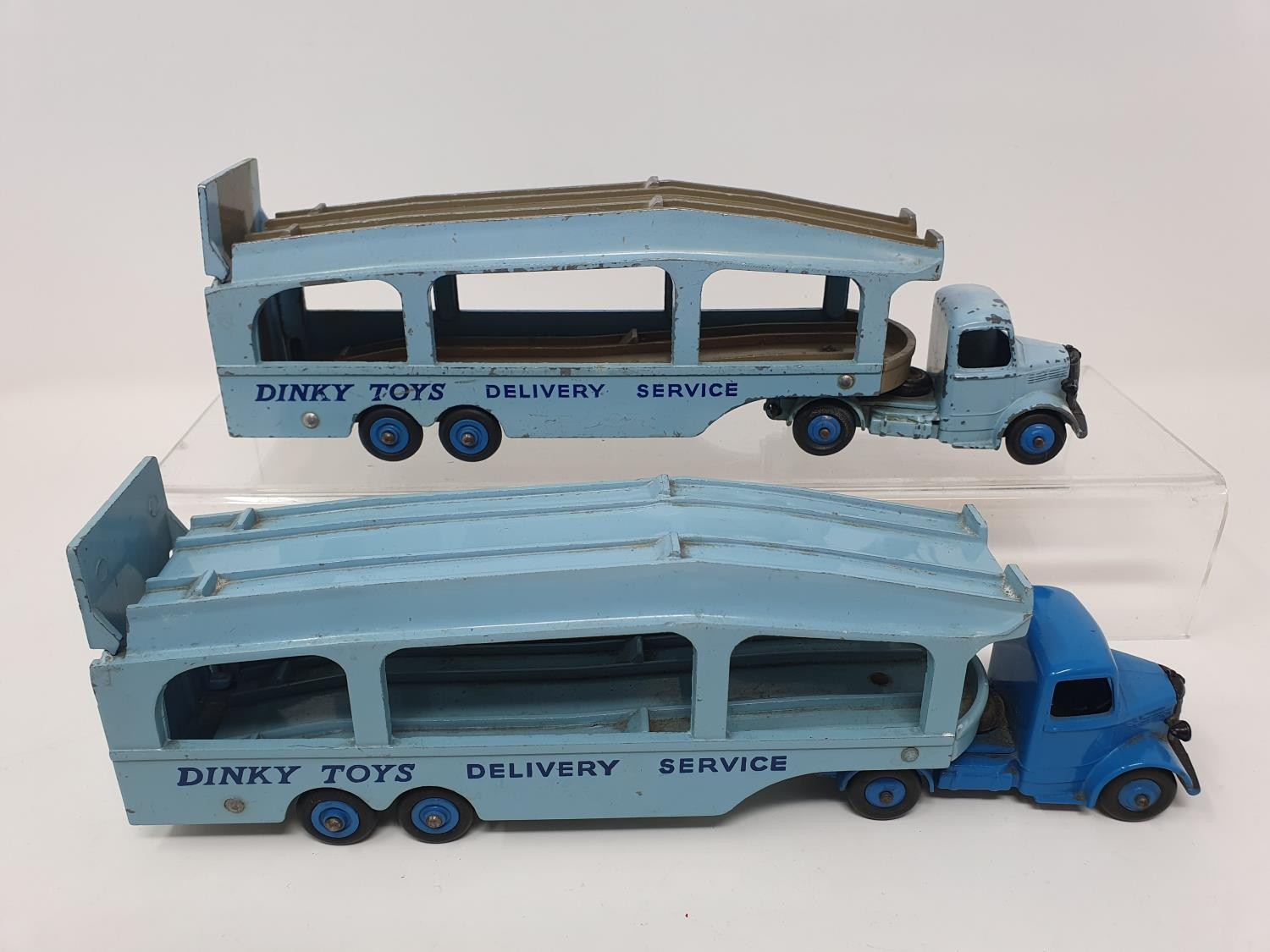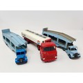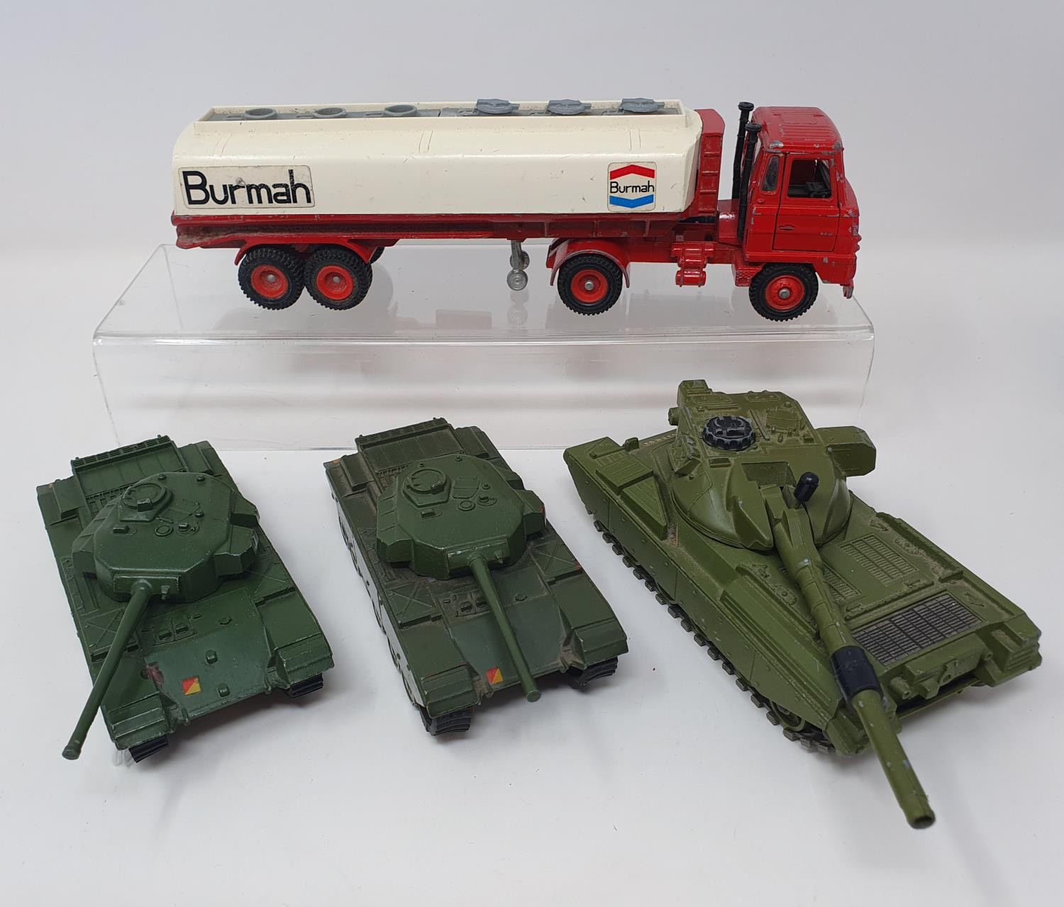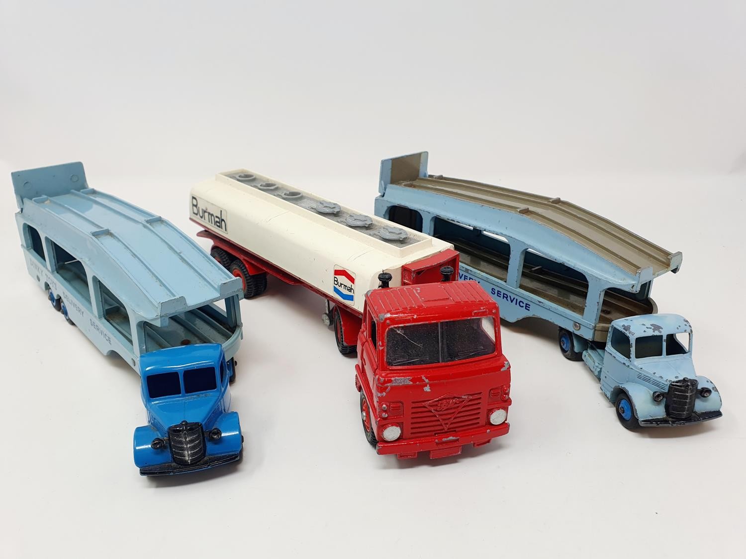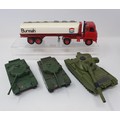 Two Dinky Toys Pullmore car transporters, a Foden Burmah petrol tanker, and three tanks
