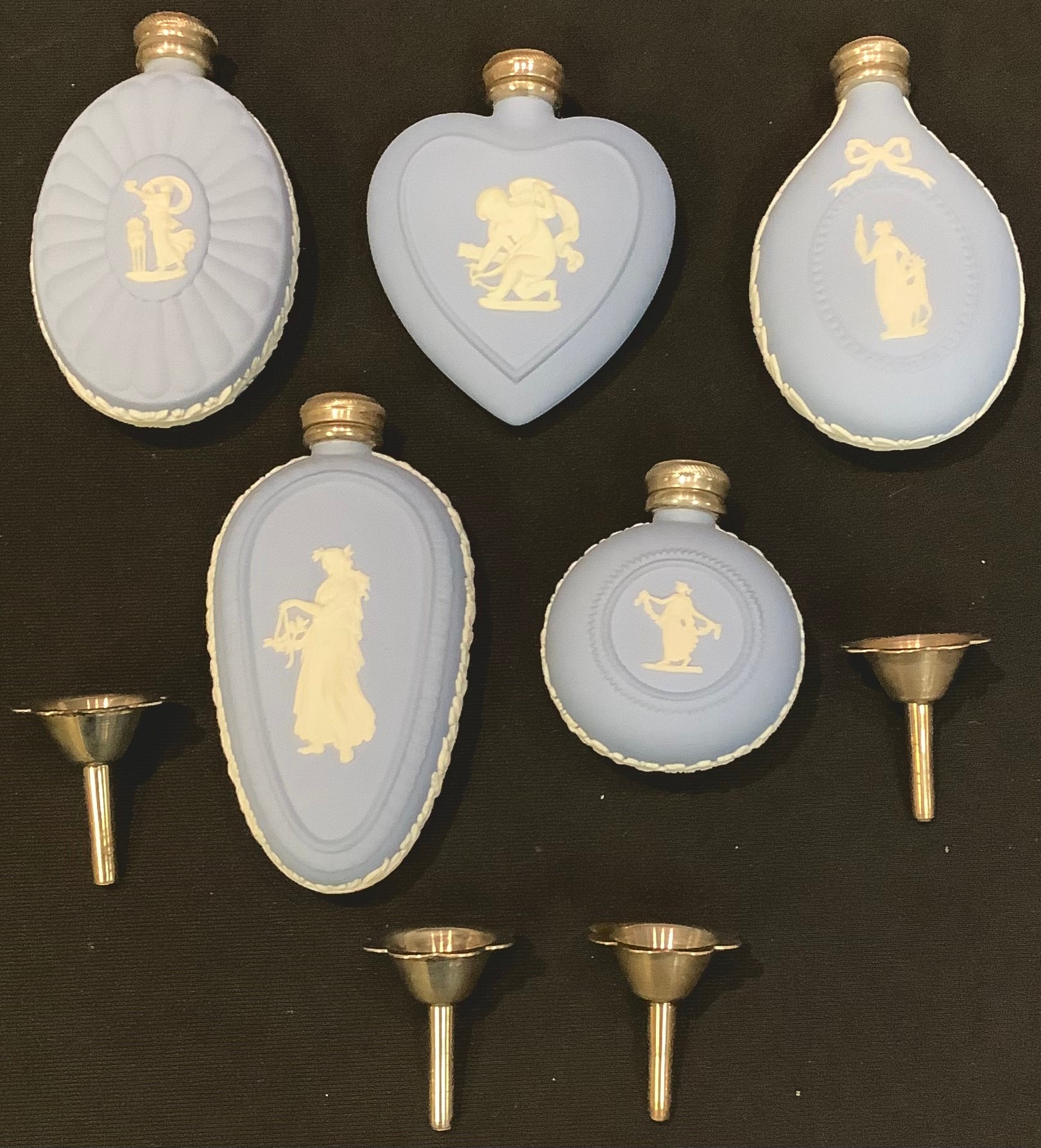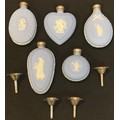 A set of five Wedgwood Jasperware scent flasks, comprising Athena, Cupid, Penelope, Pandora and Diana, silver screw covers, Birmingham 1994/1995, the longest 8cm, four silver plated funnels