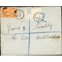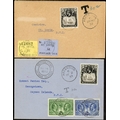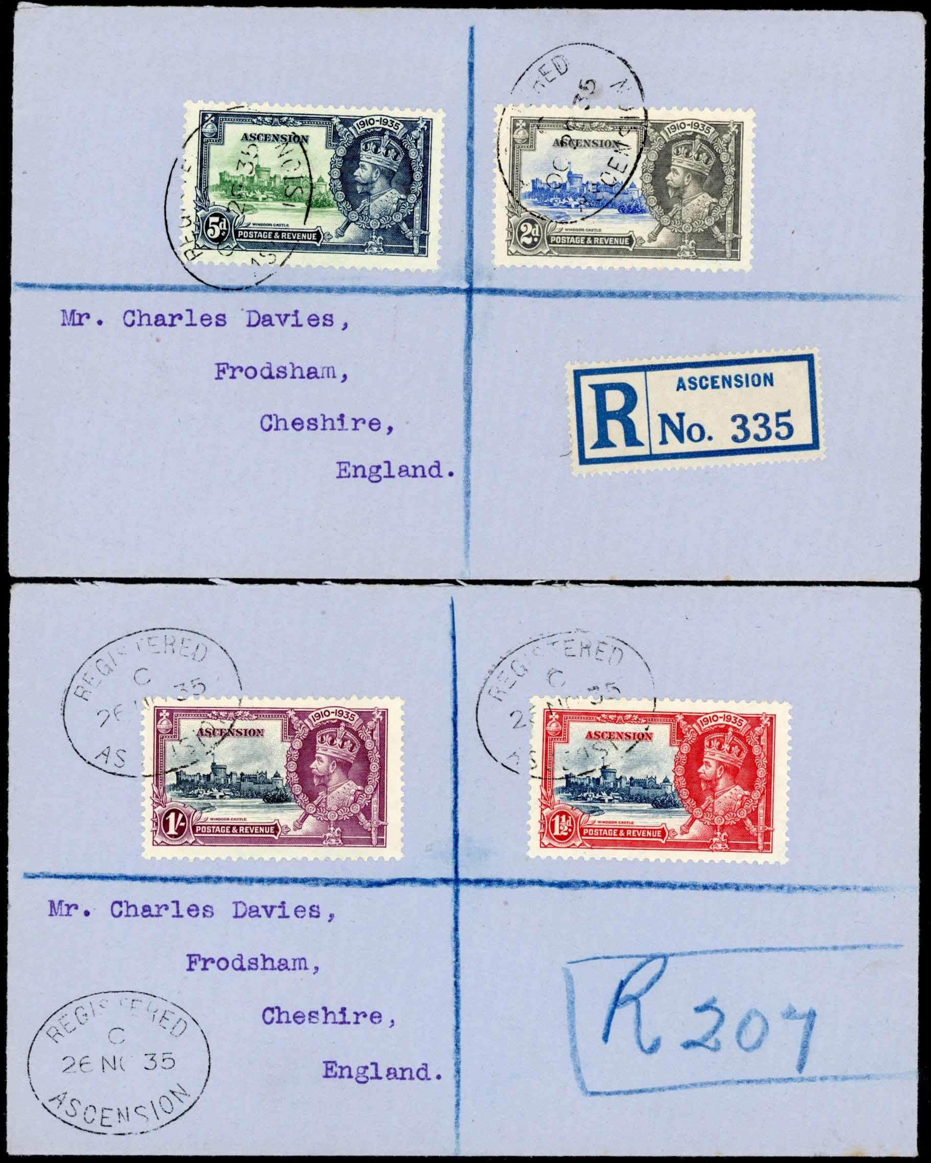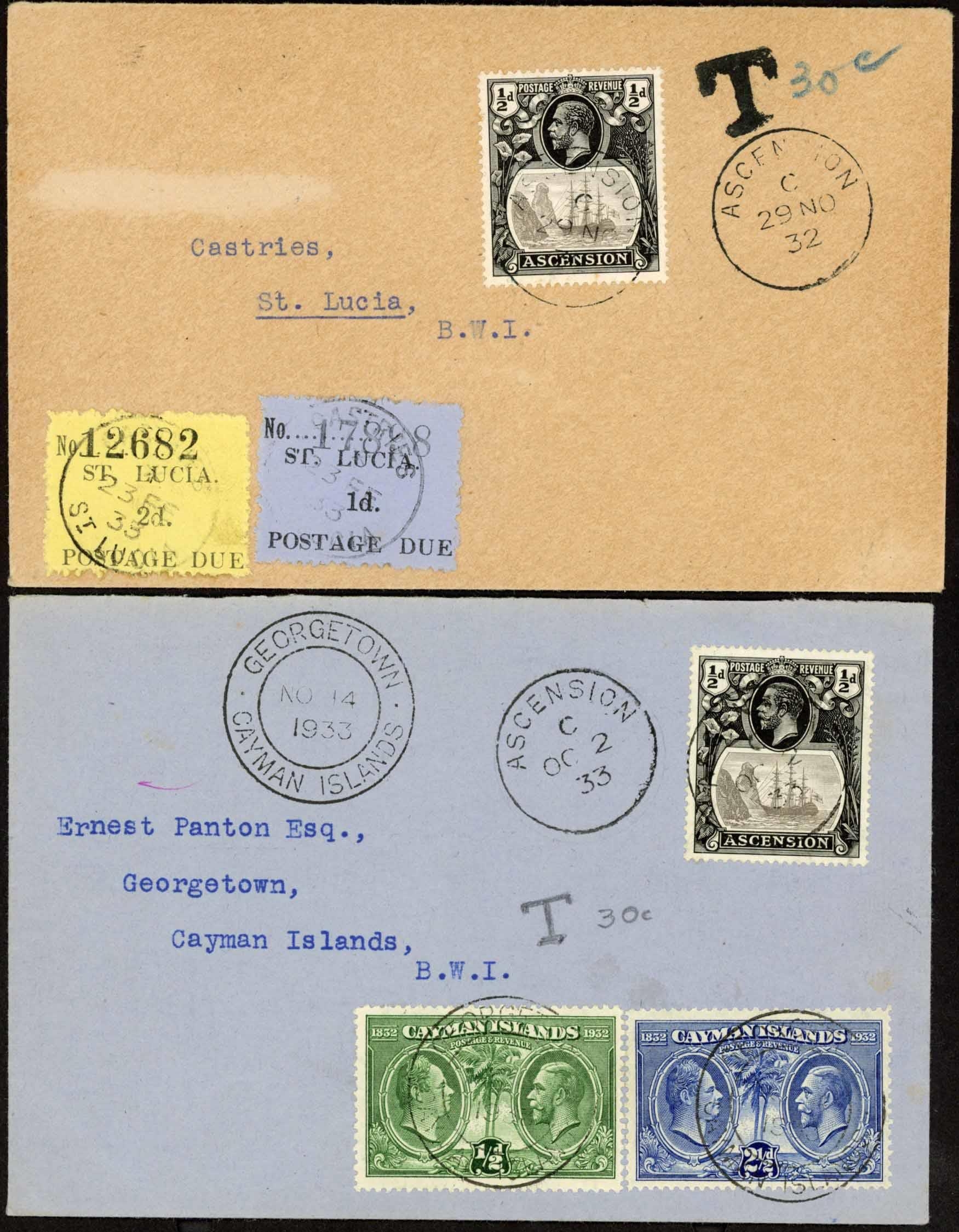 ATTRACTIVE KGV COVER TRIO INC. POSTAGE DUES: Includes 29 Nov. 1932 cover to St. Lucia bearing ½d grey-black & black."T" mark and m/s "30c" accompany St. Lucia 1d blue & 2d yellow Dues. Very attractive. Also 2 Oct cover to Cayman Islands with single ½d franking as previous cover, "T" mark in pencil and additionally Cayman ½d & 2½d adhesives paying the postage due. Also 2 Oct. 1935 Regd. cover to GB bearing 1935 SJ 2d & 5d values. (3 covers)Cross Reference: POSTAGE DUE STAMPS & COVERS, ST. LUCIA
