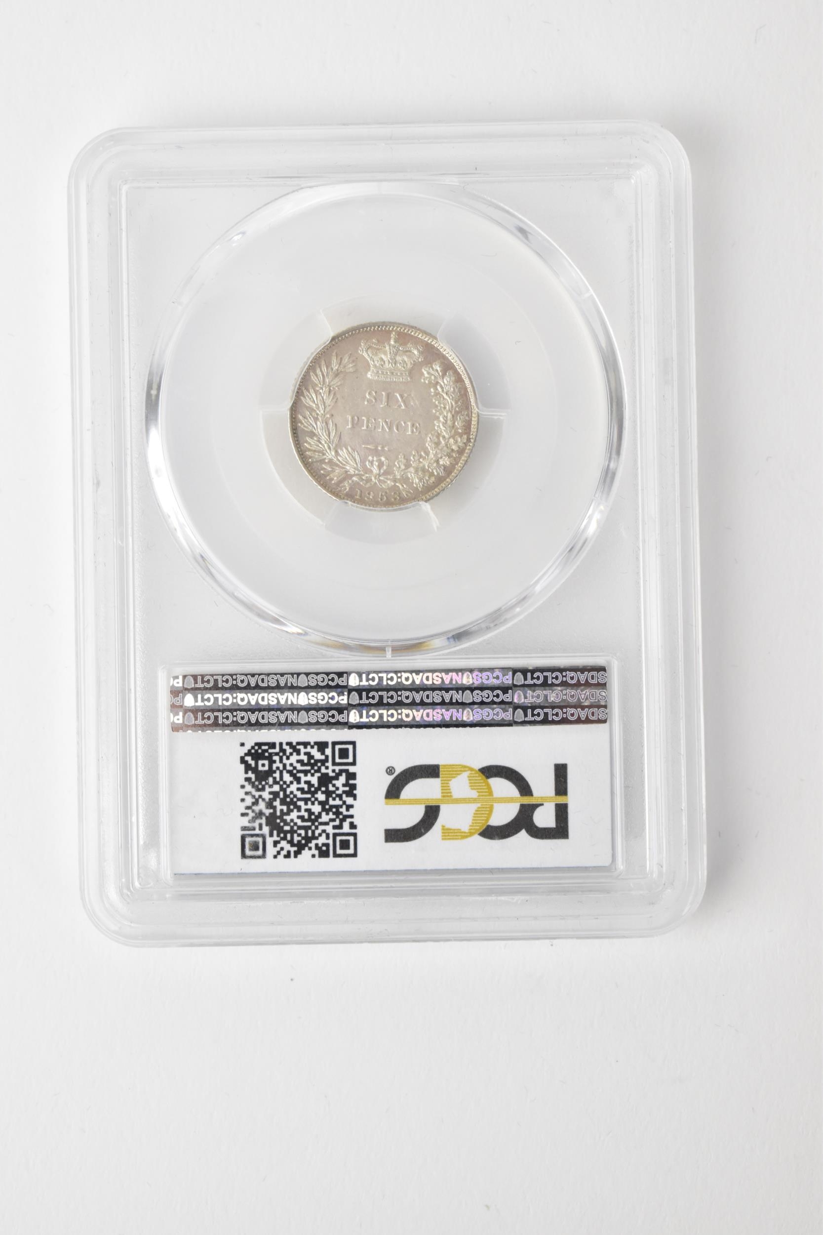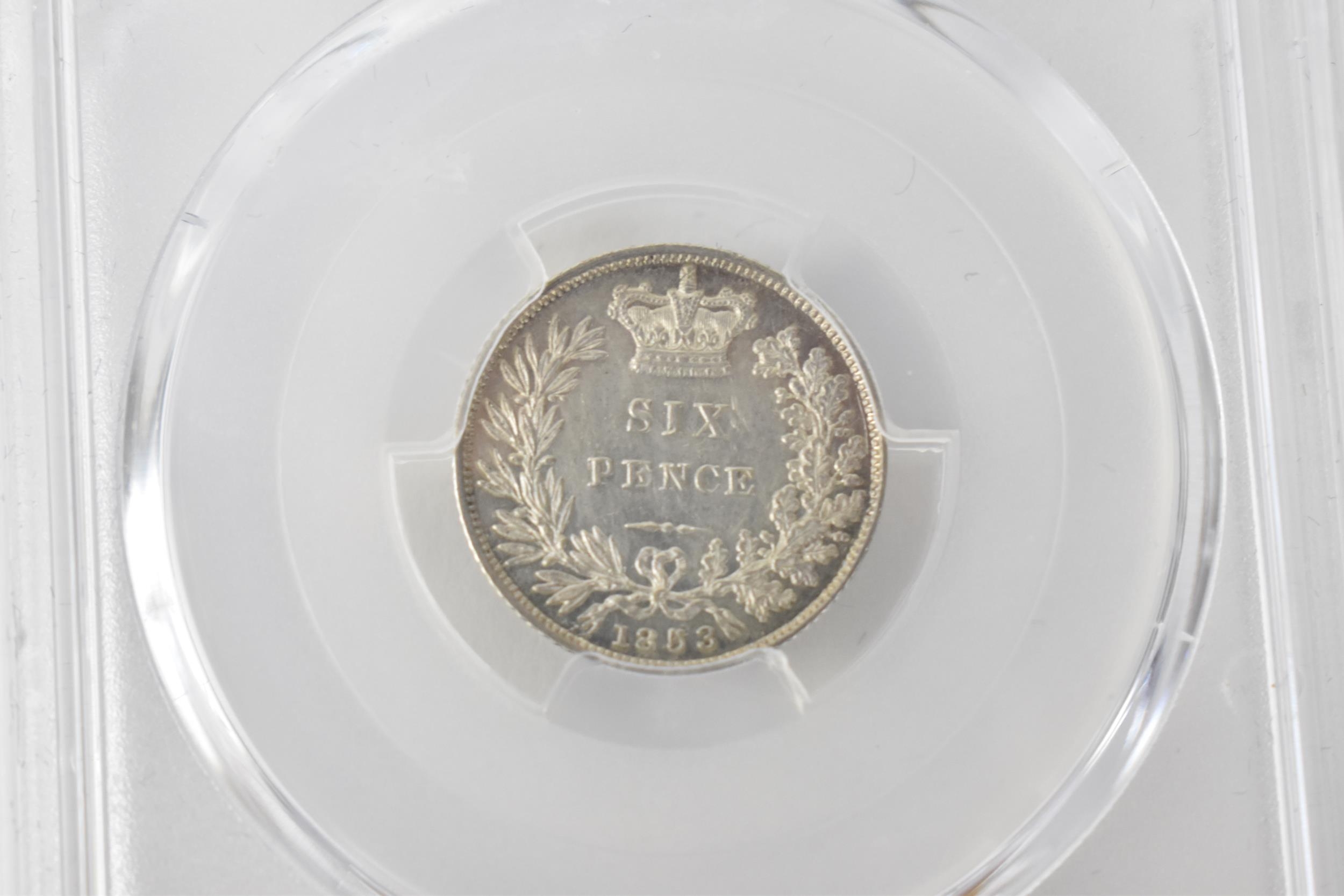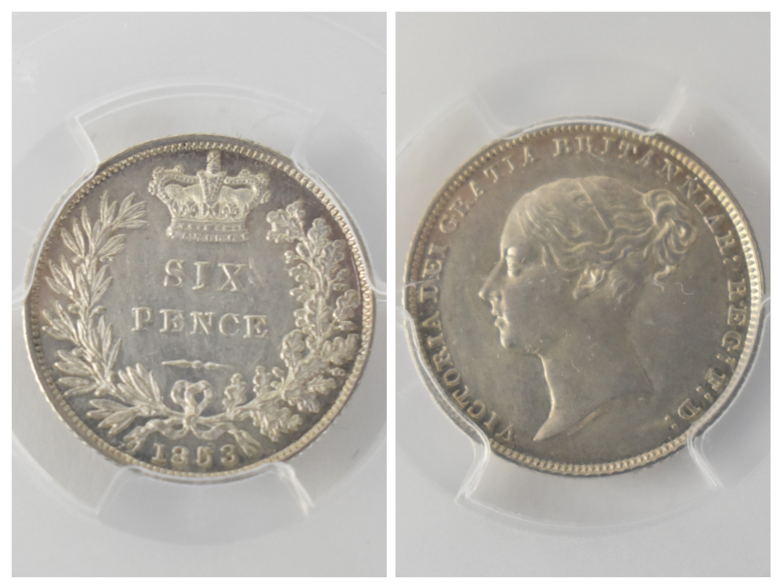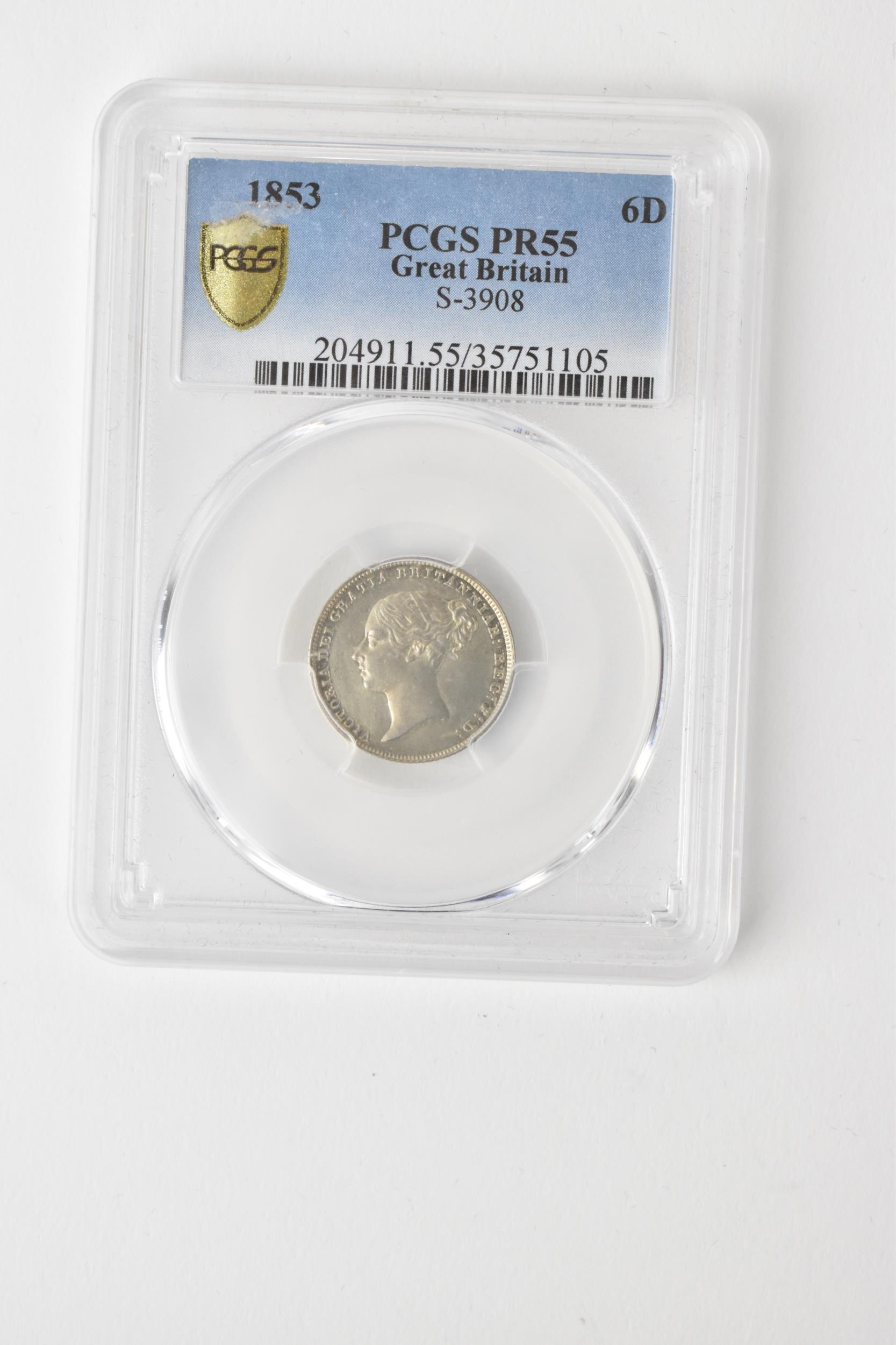 United Kingdom - Victoria (1837-1901) Six Pence, dated 1853, 1st Type, young crowned portrait 'Young Head', Queen Victoria, left, VICTORIA DEI GRATIA BRITANNIAR:REG:F:D:/. crowned denomination withing wreath, SIX PENCE 1853, in secure plastic holder, graded PCGS PR55, certification number 35751105