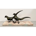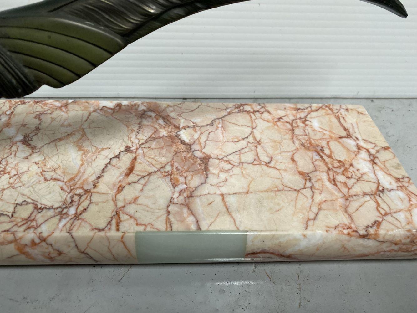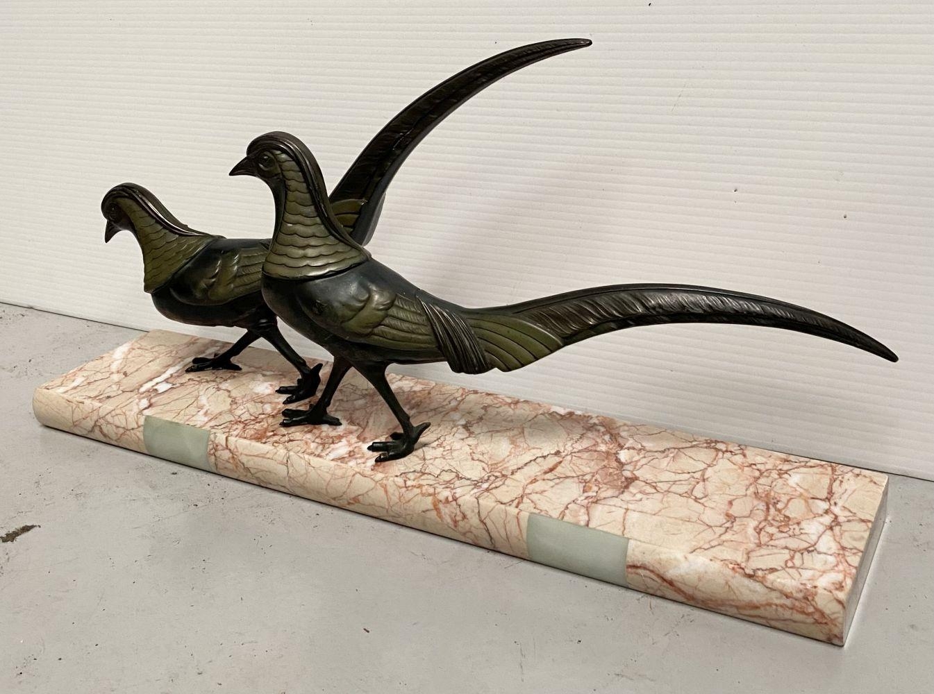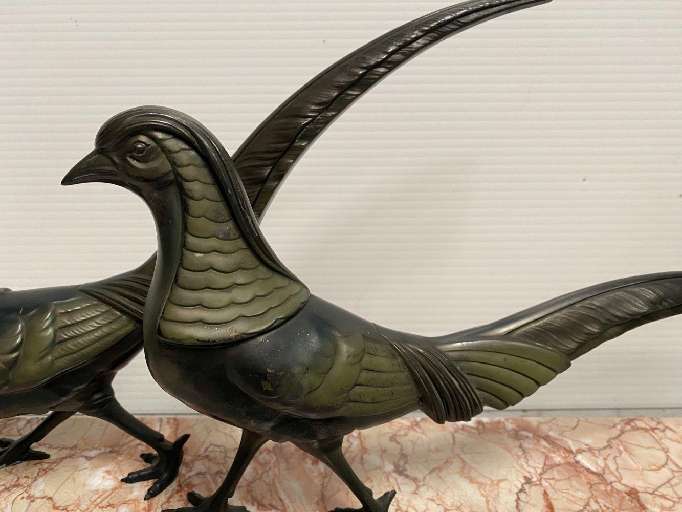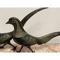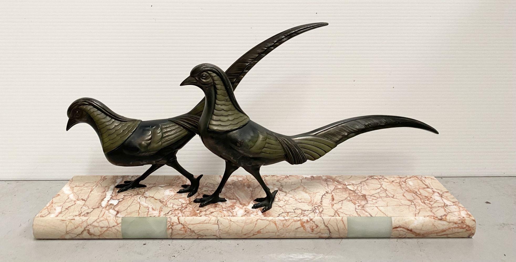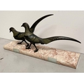 A BRONZE SCULPTURE ON MARBLE BASE, in the form of two pheasants, on mottled rectangular marble base. Dimensions: 55cm wide x 12cm deep x 23cm high including base