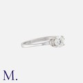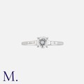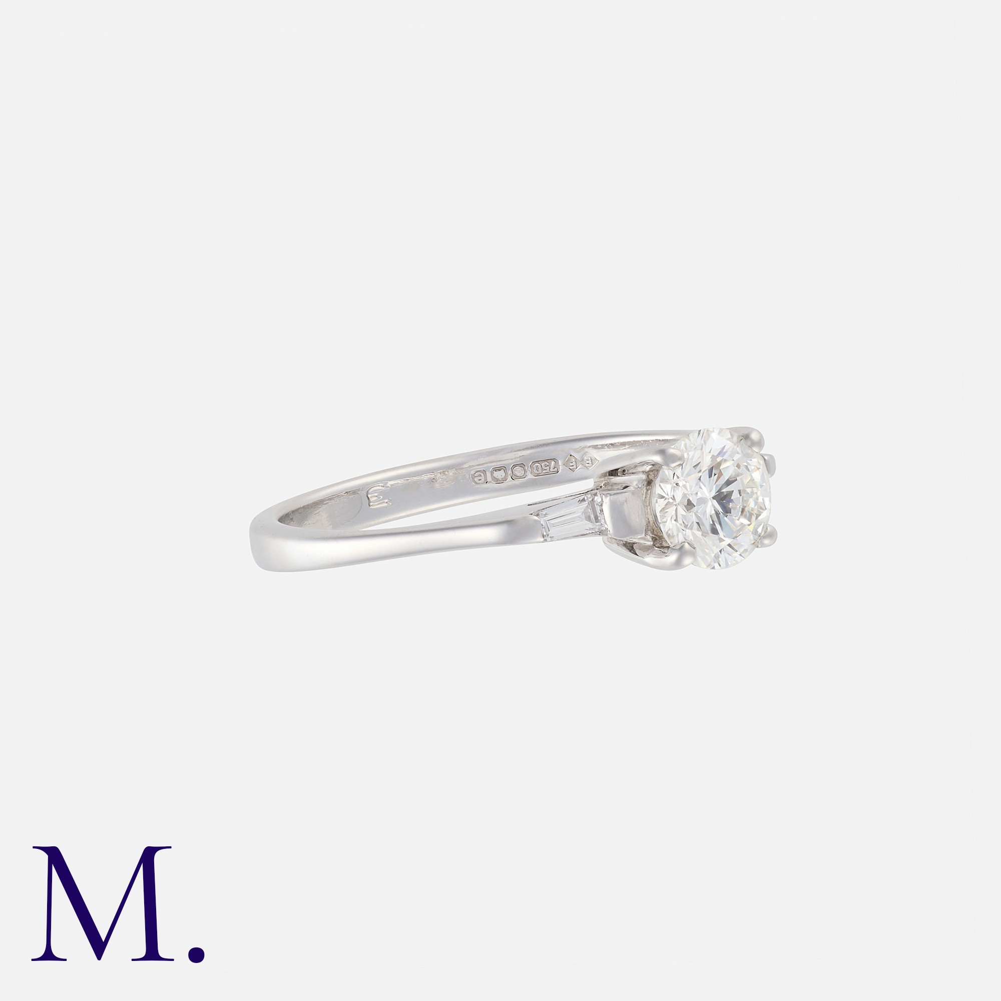 A Diamond Engagement Ring in 18k white gold, set with a principal round cut diamond of approximately 0.60cts, flanked either side by a tapered baguette cut diamond. Hallmarks for 18 carat gold.