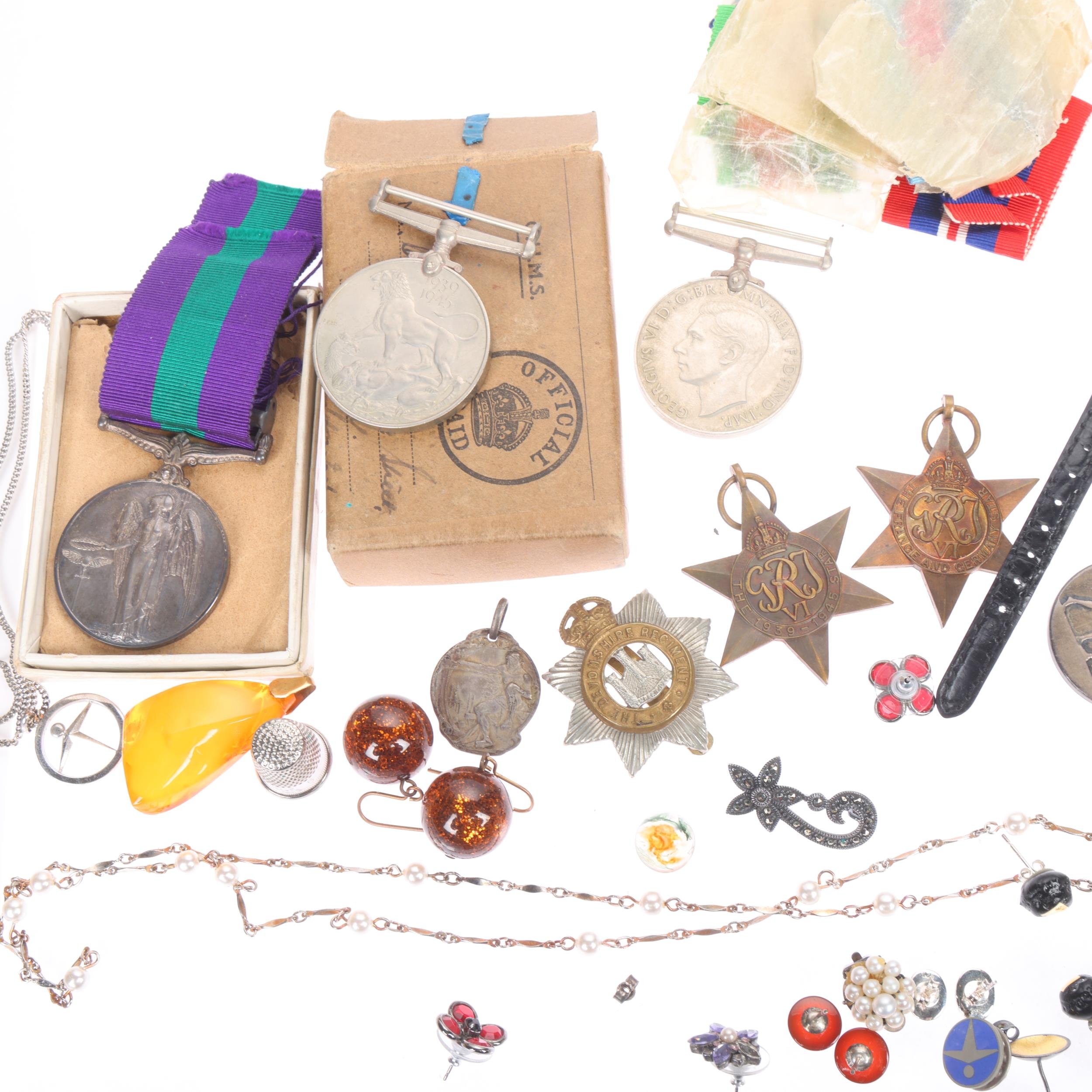 Various jewellery and collectables, including group of 5 Second World War medals, including George VI General Service medal with Palestine 1945 - 48 bar to 19098966 Trooper R Gilding 15th/19th The King's Royal Hussars