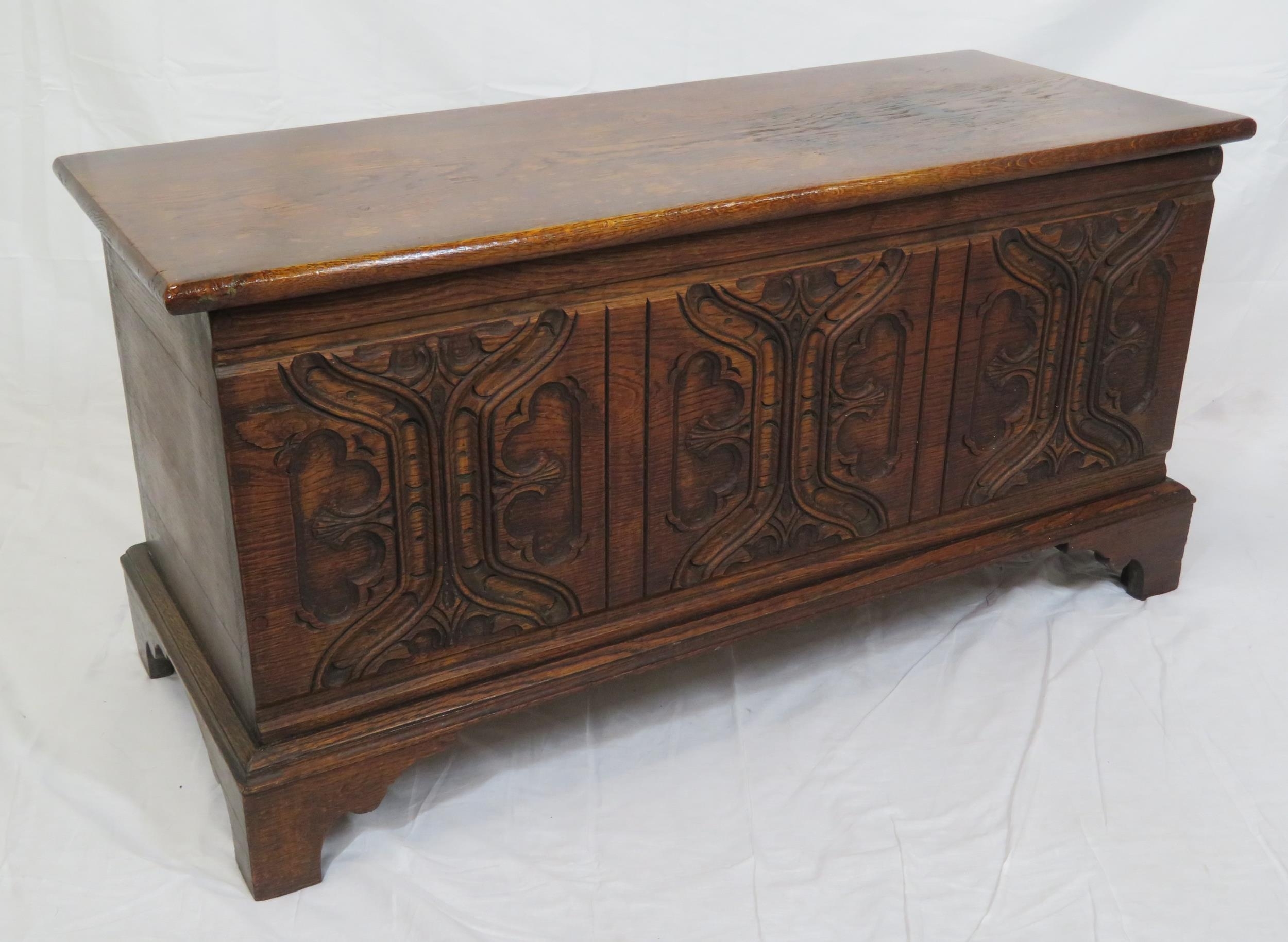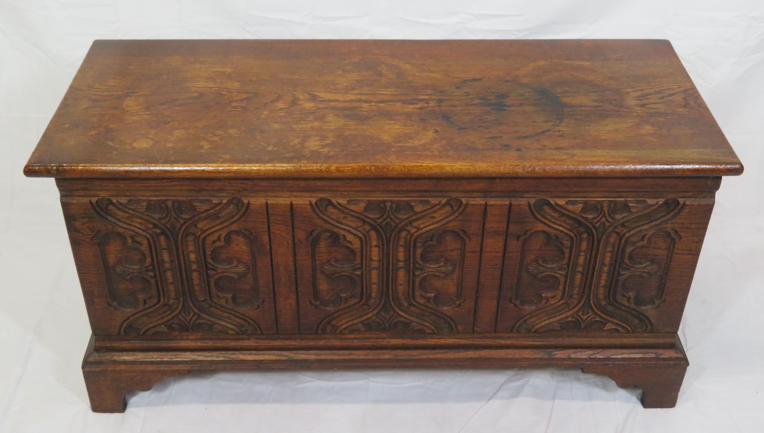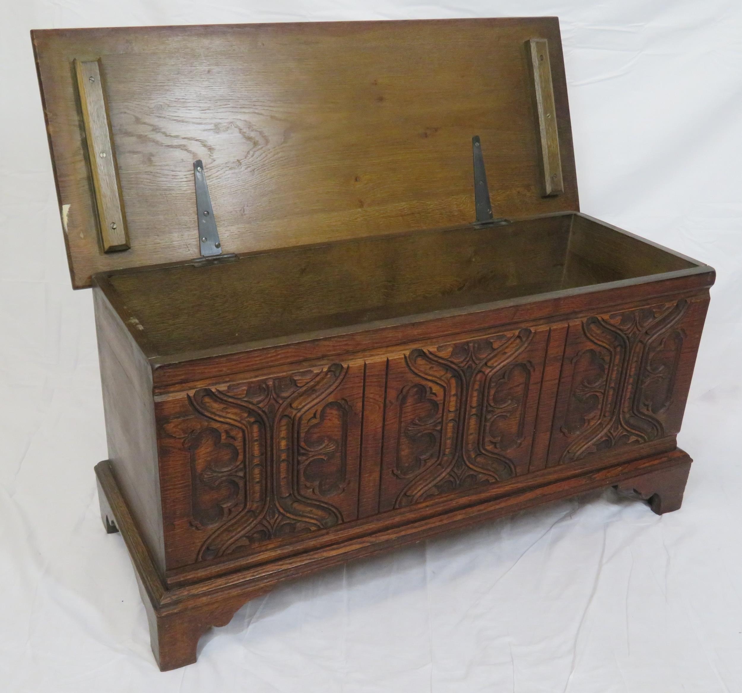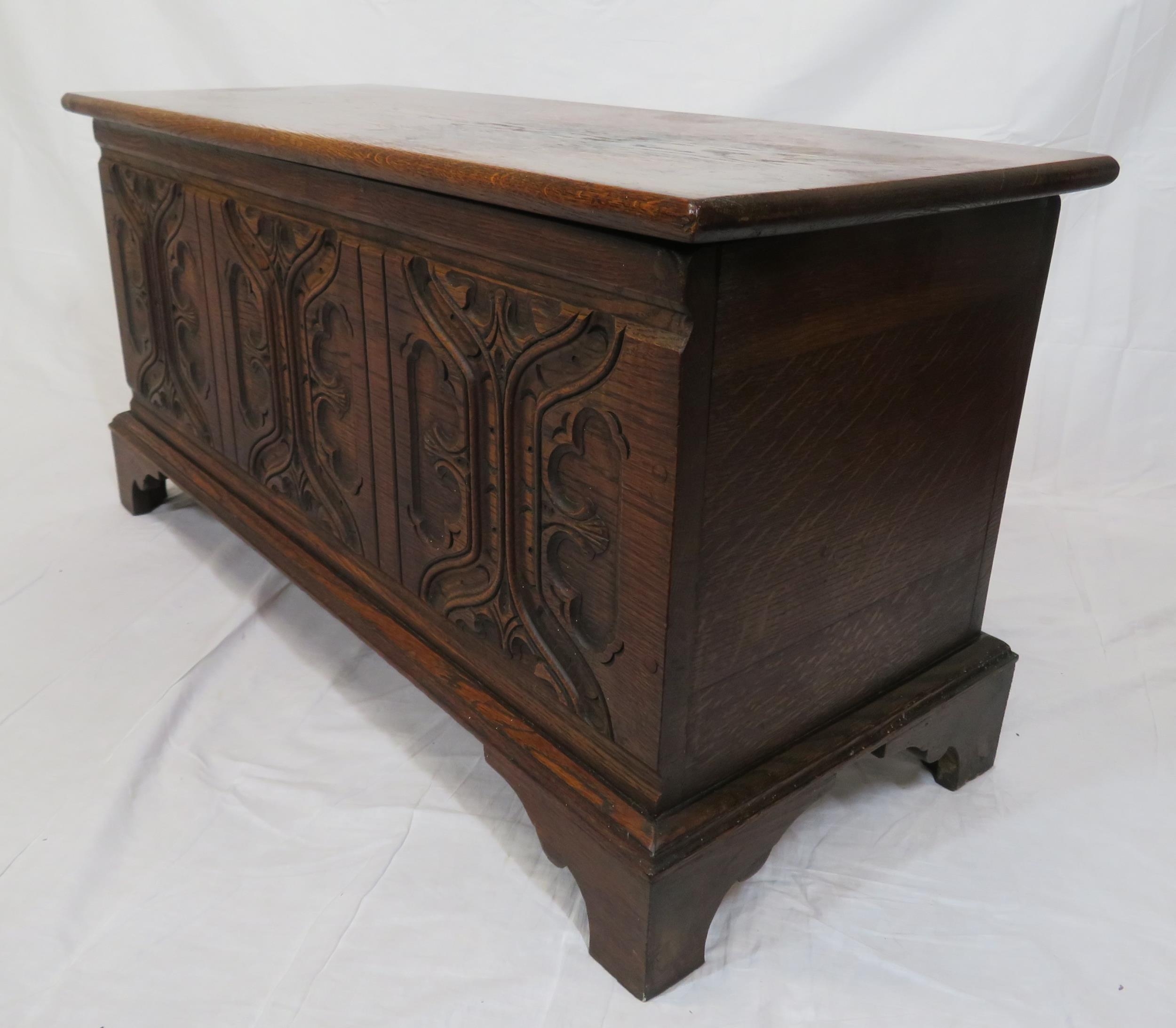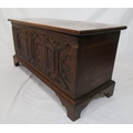 Arts & Crafts style oak coffer with carved panelled sides & bracket feet