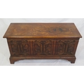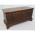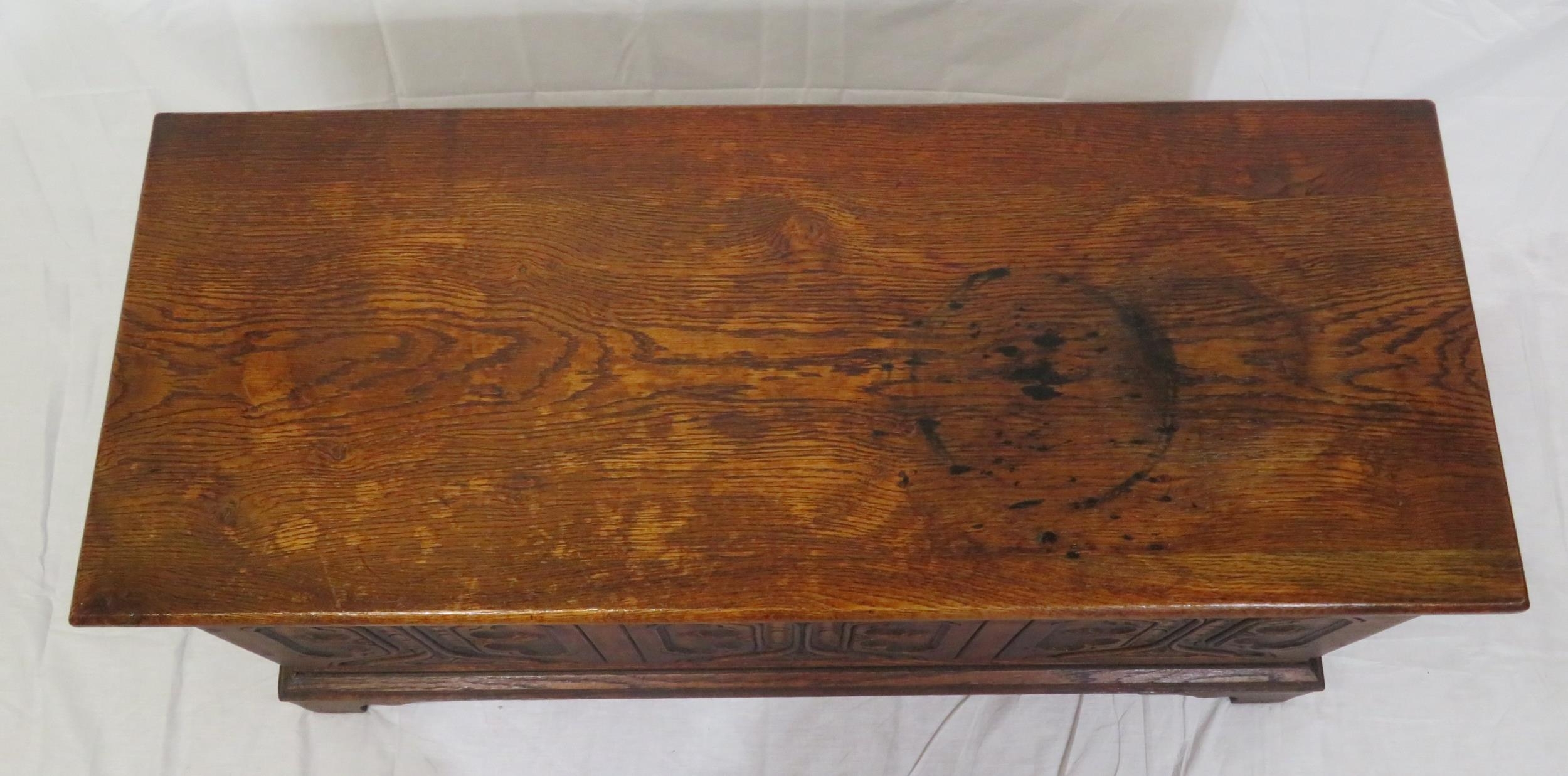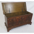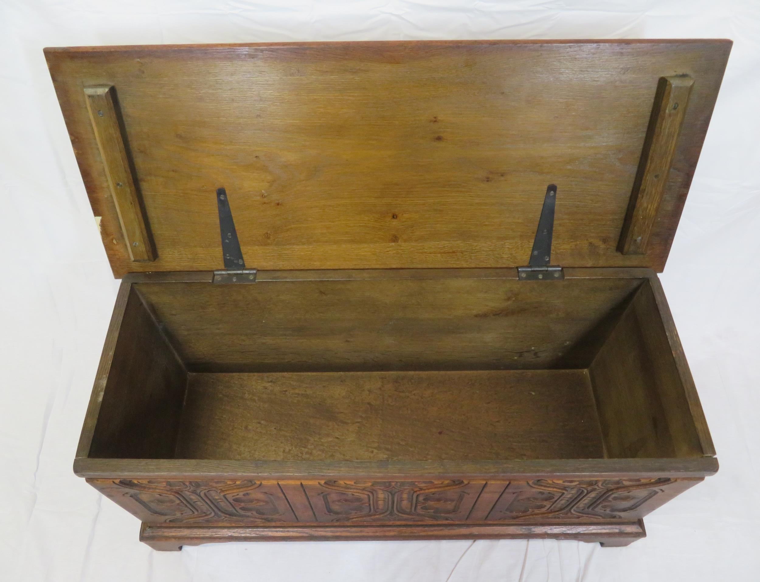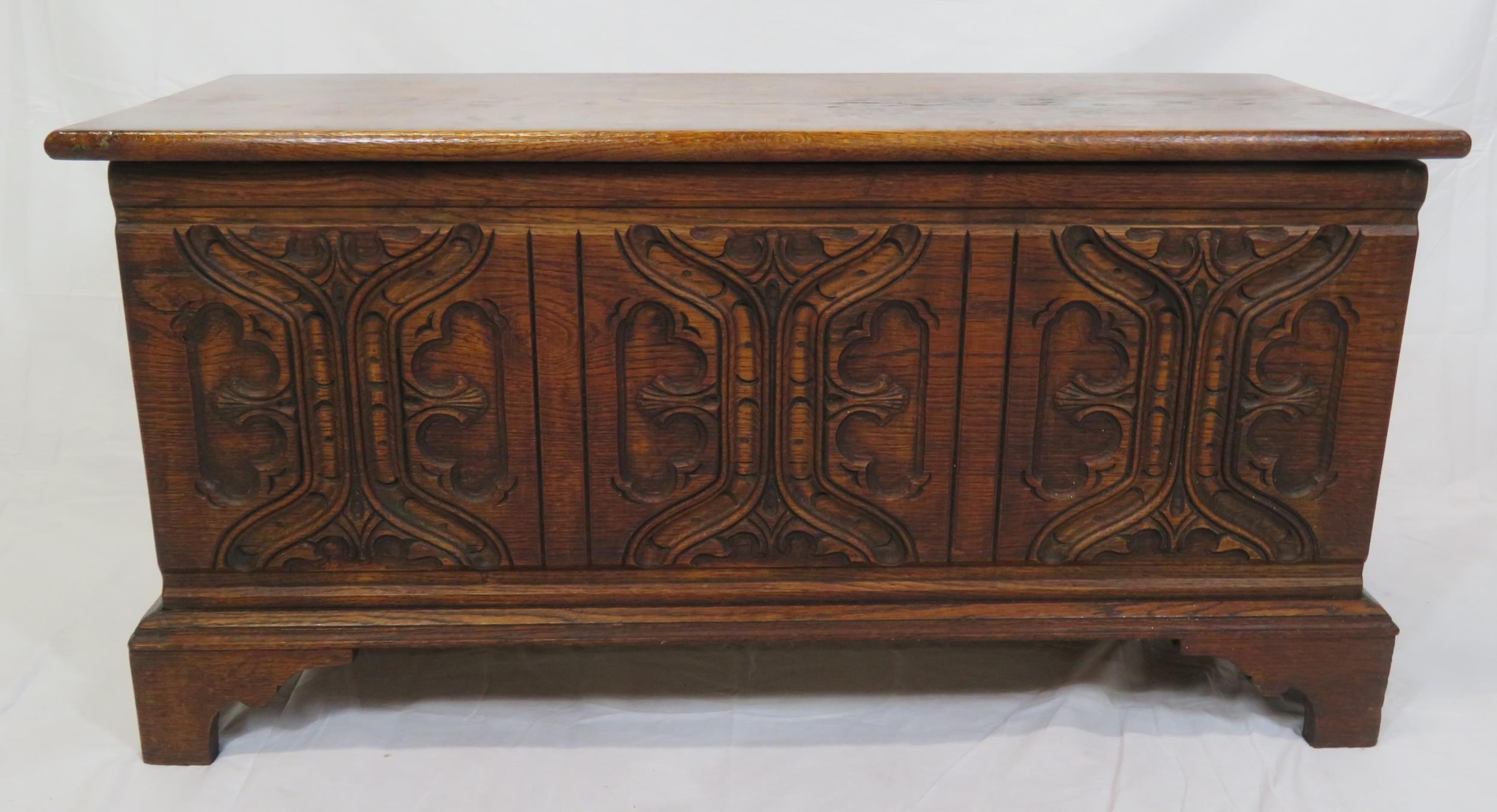 Arts & Crafts style oak coffer with carved panelled sides & bracket feet