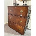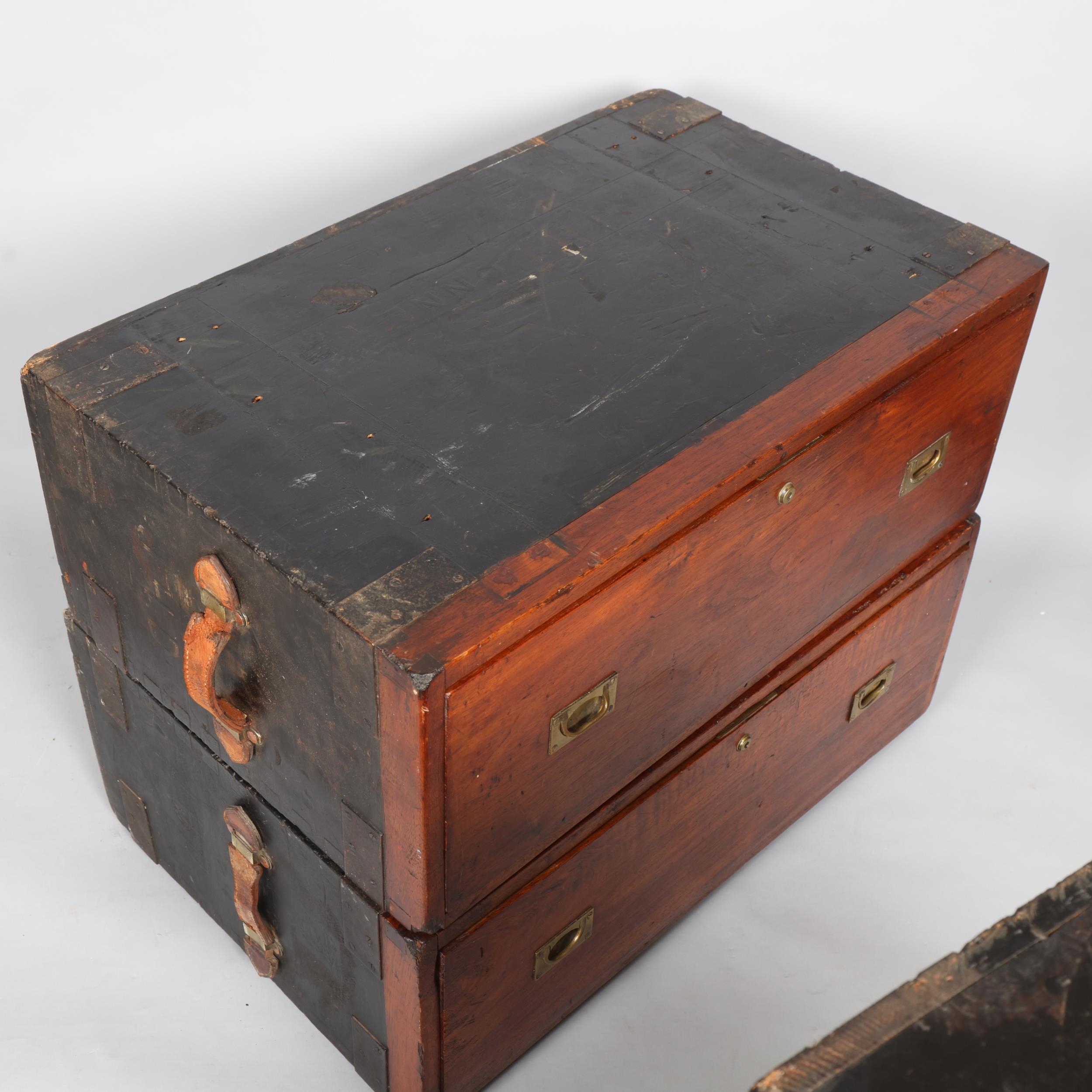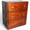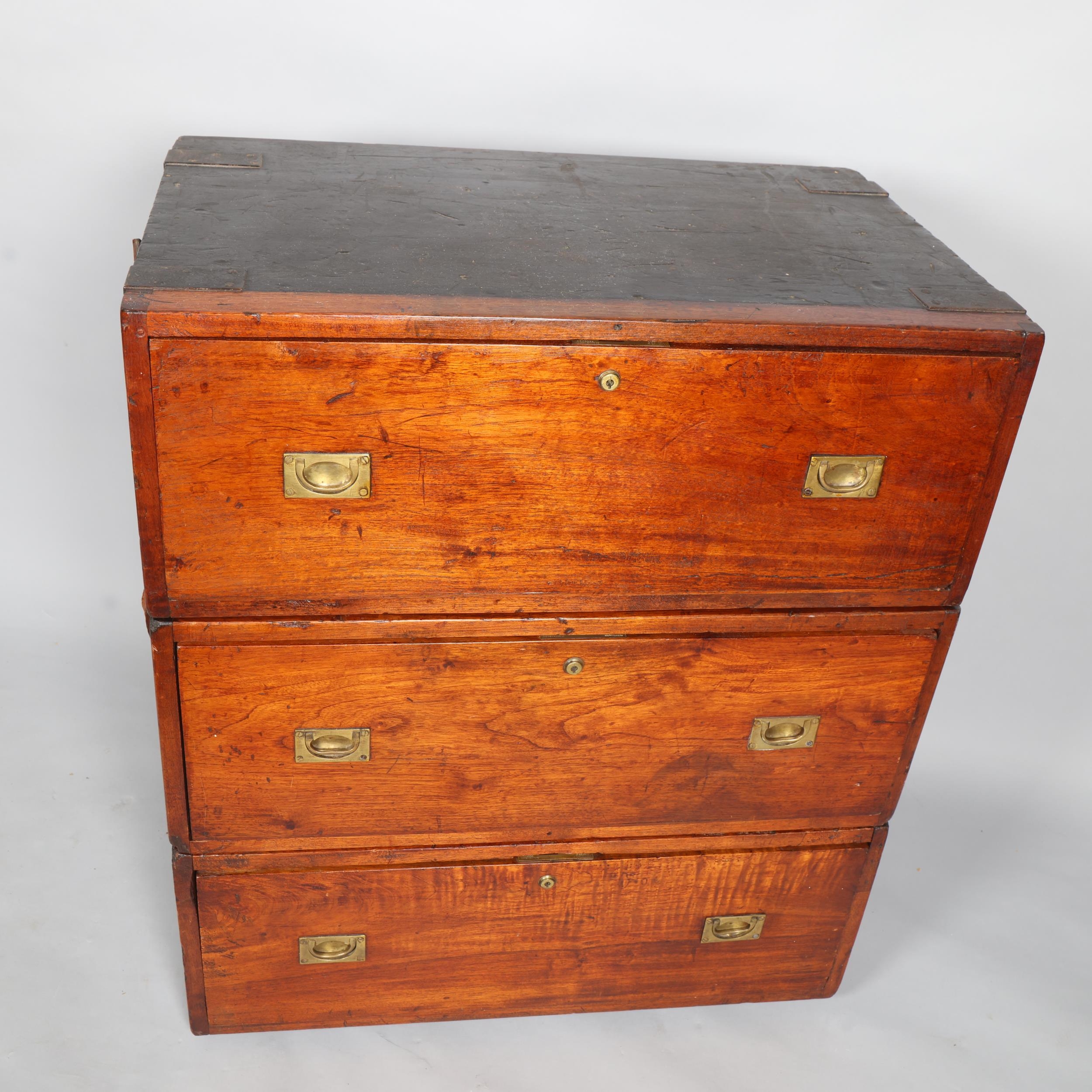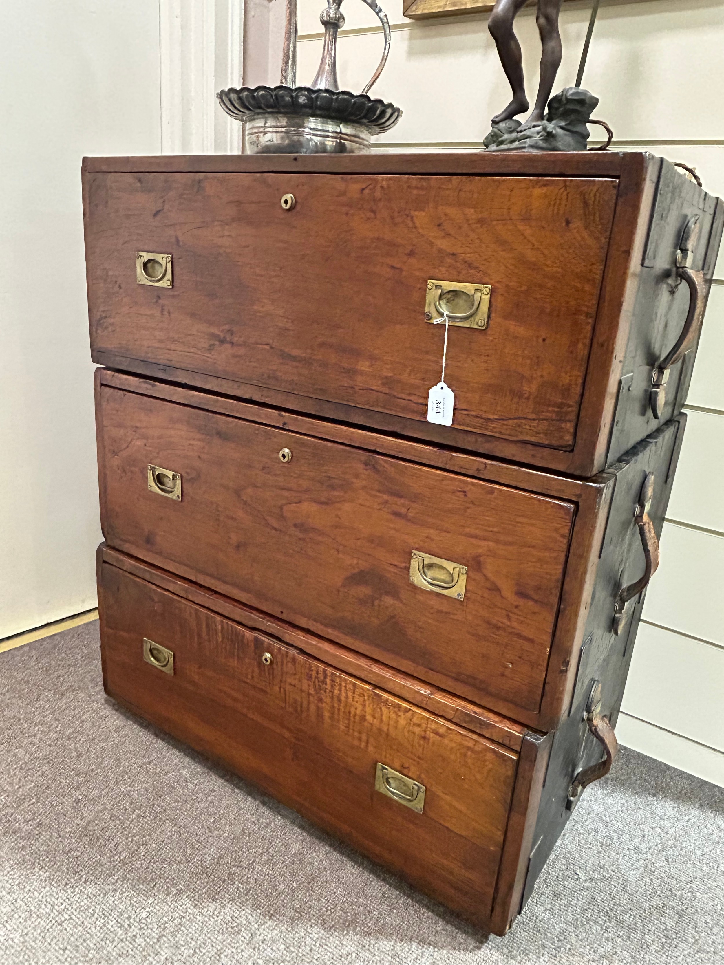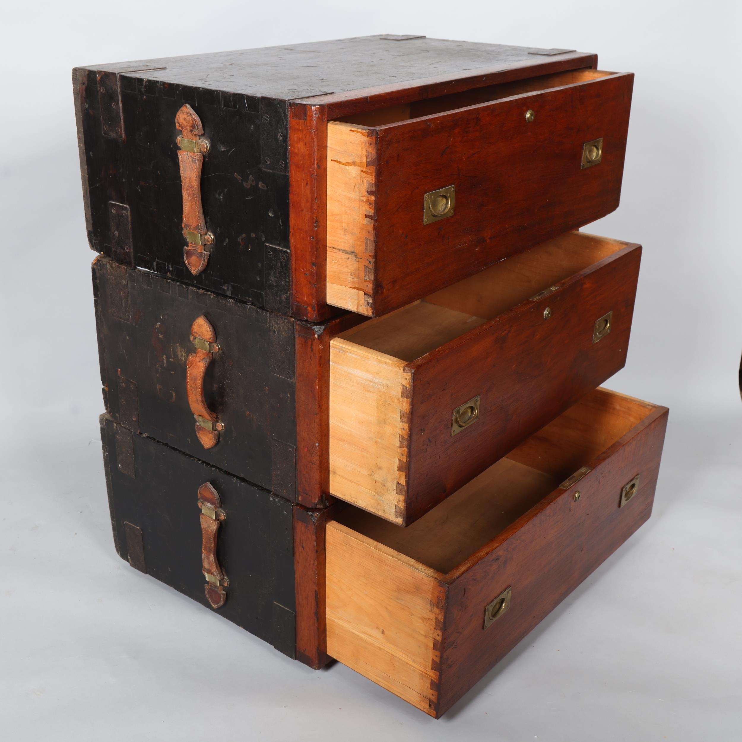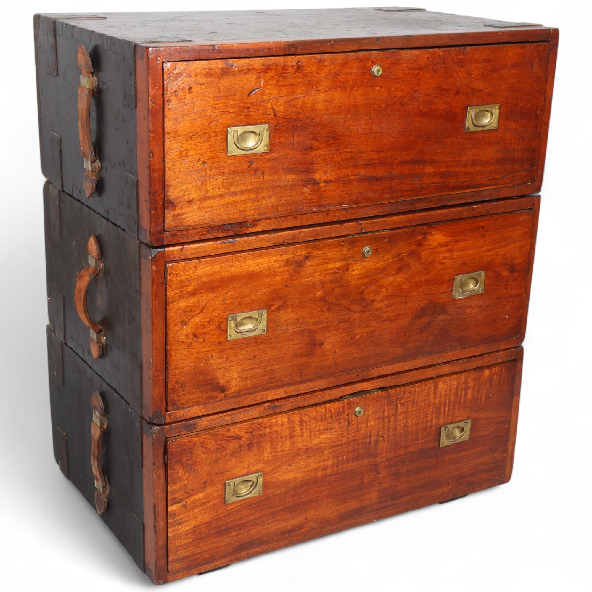 A 19th century teak campaign stacking chest of 3 long drawers in 3 parts, with recessed brass handles, metal corner binding brackets, and leather carrying handles, Bramah locks stamped J Needs of New Bond Street, width 84cm, depth 53cm, height 98cm