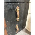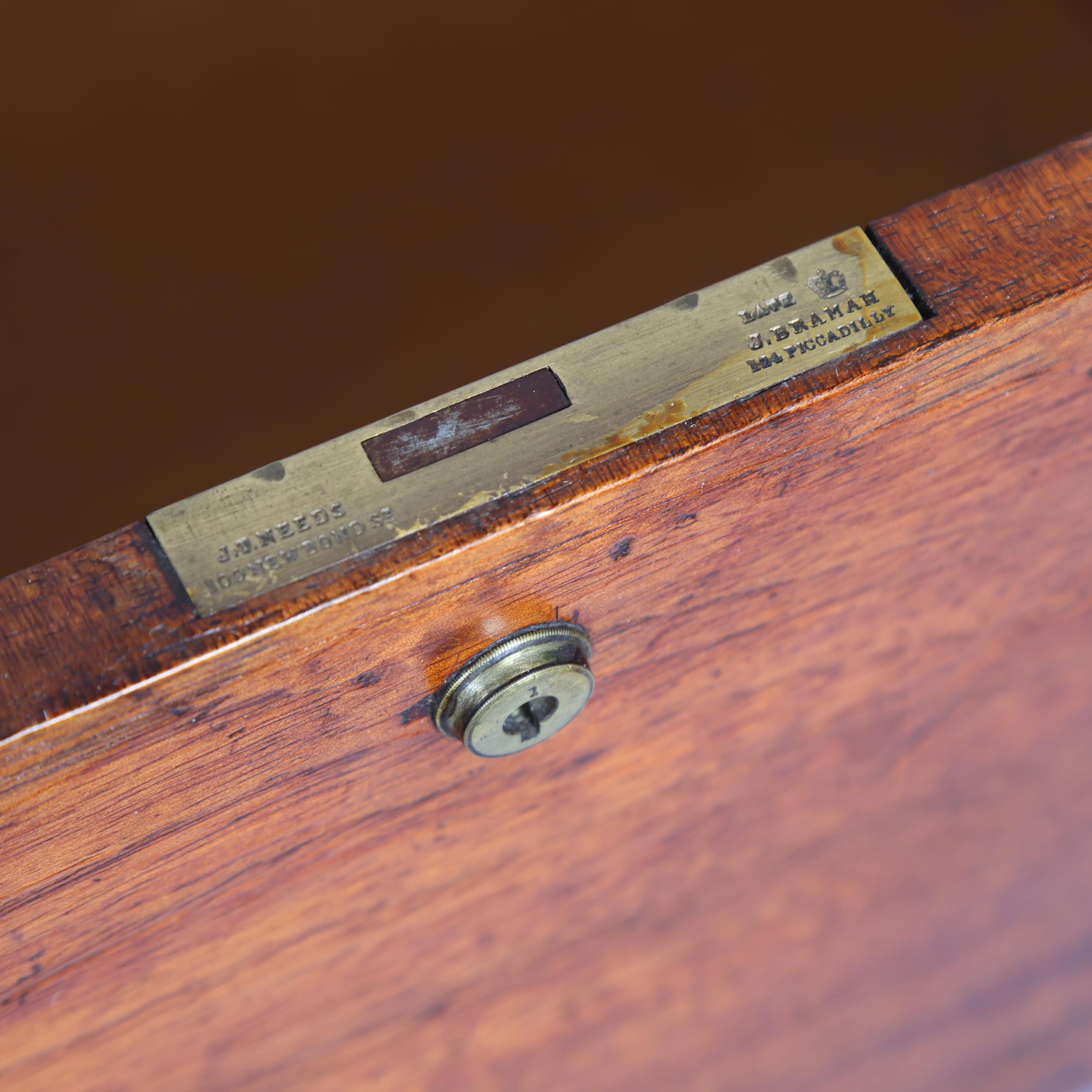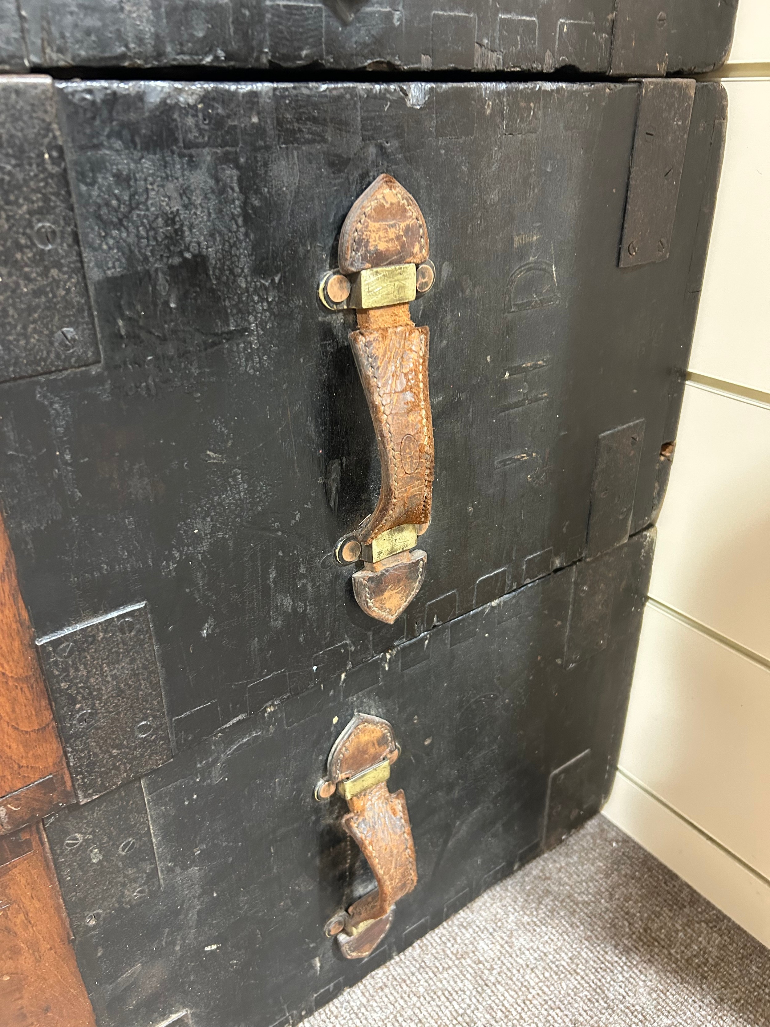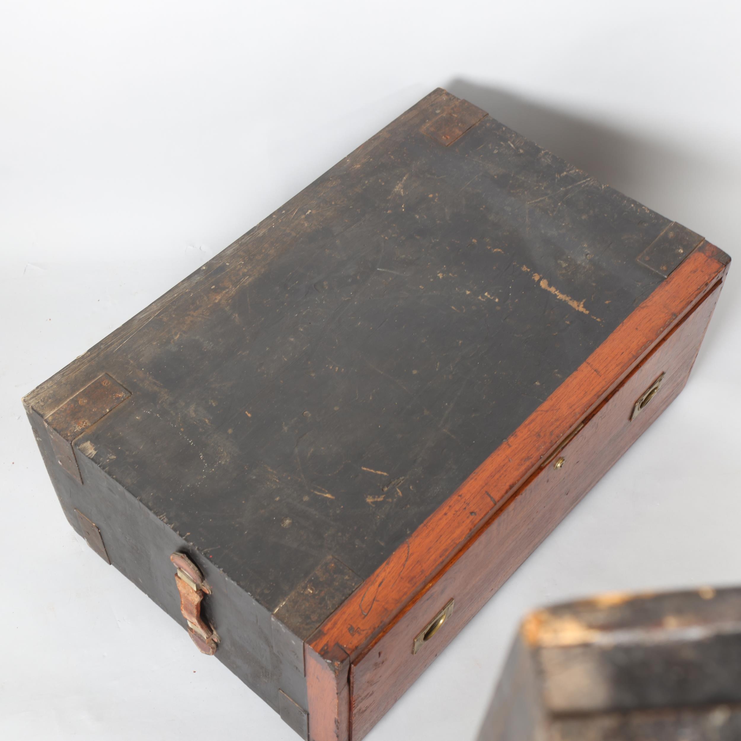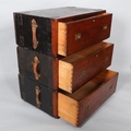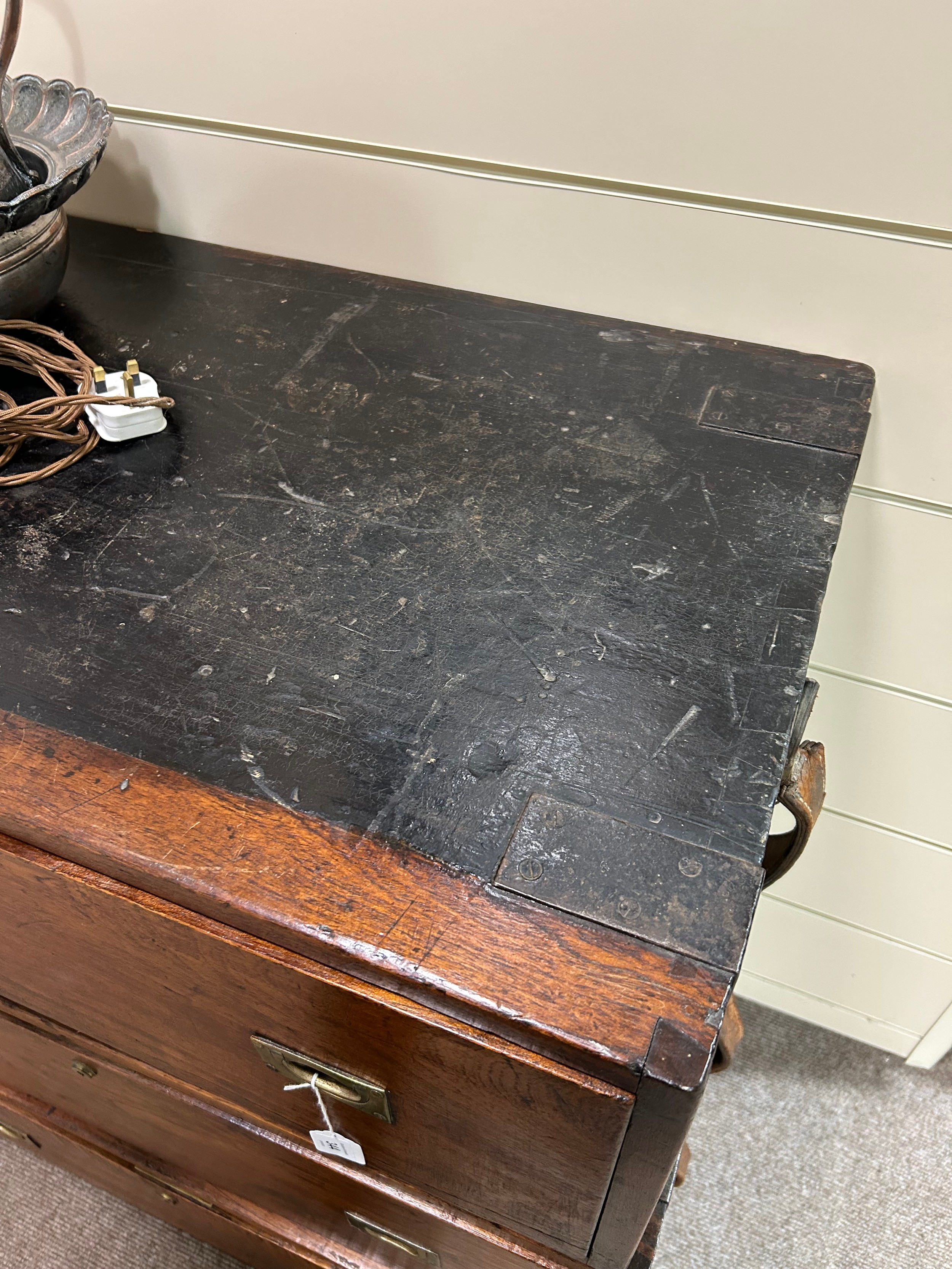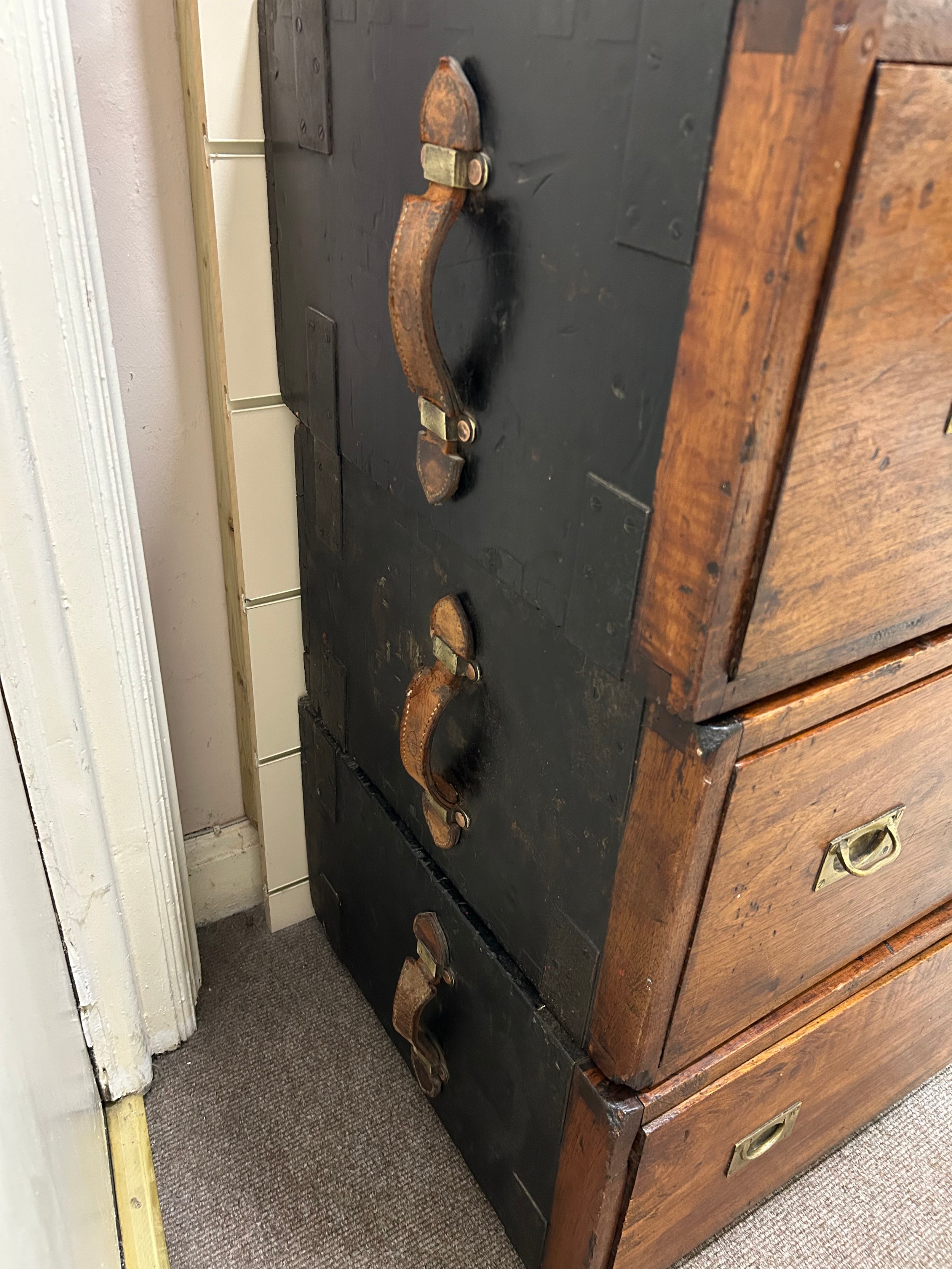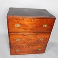 A 19th century teak campaign stacking chest of 3 long drawers in 3 parts, with recessed brass handles, metal corner binding brackets, and leather carrying handles, Bramah locks stamped J Needs of New Bond Street, width 84cm, depth 53cm, height 98cm
