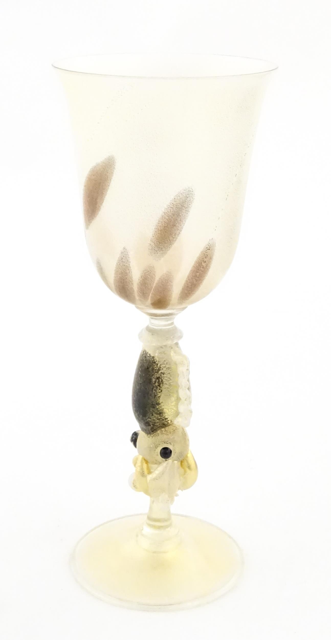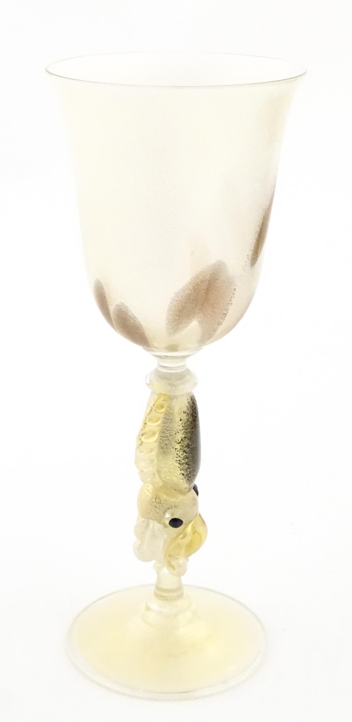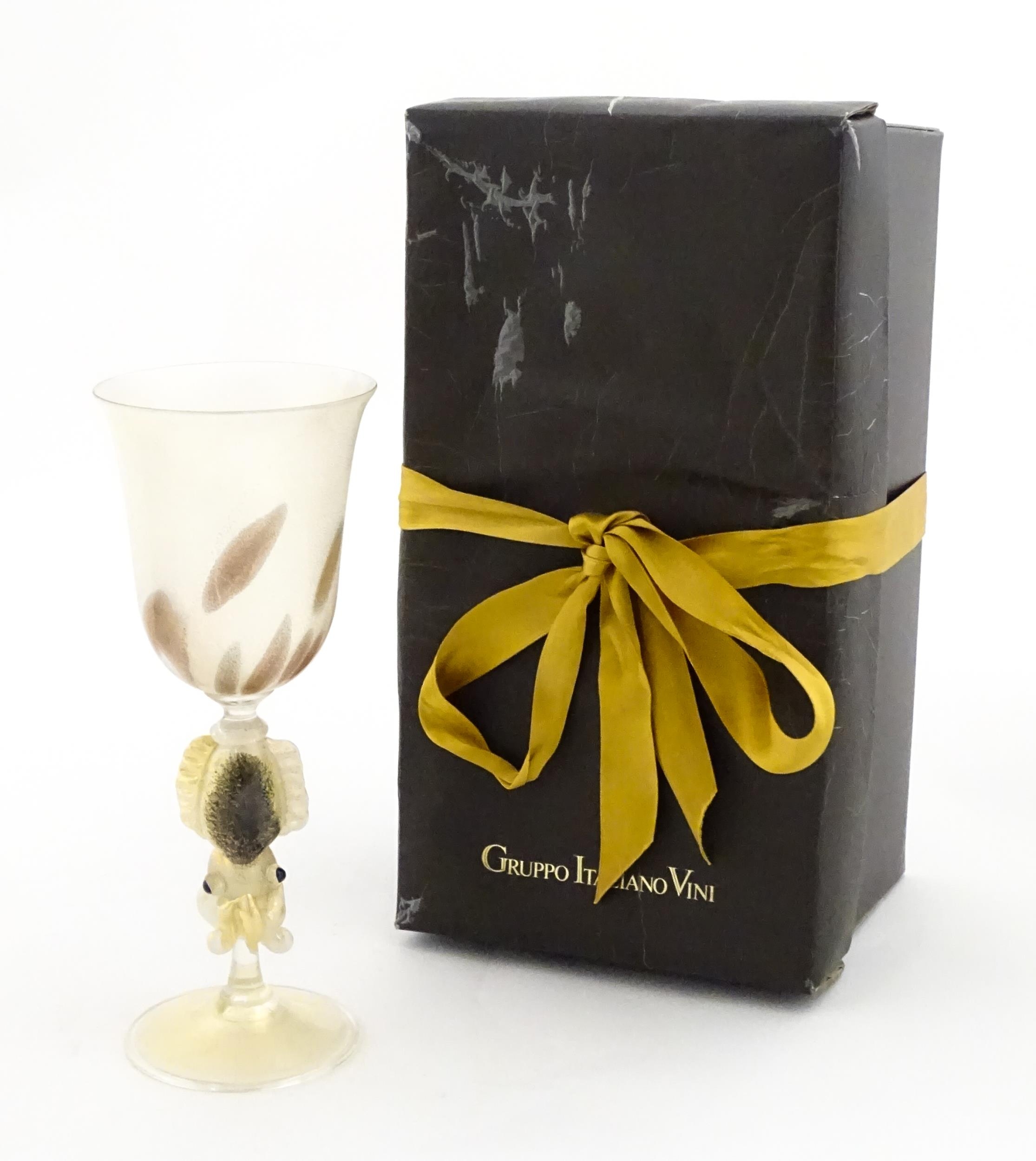 An Italian Maria Grazia Rosin 'Cuttlefish' blown glass wine glass with fish detail to stem. Boxed. Approx. 9 1/4" high