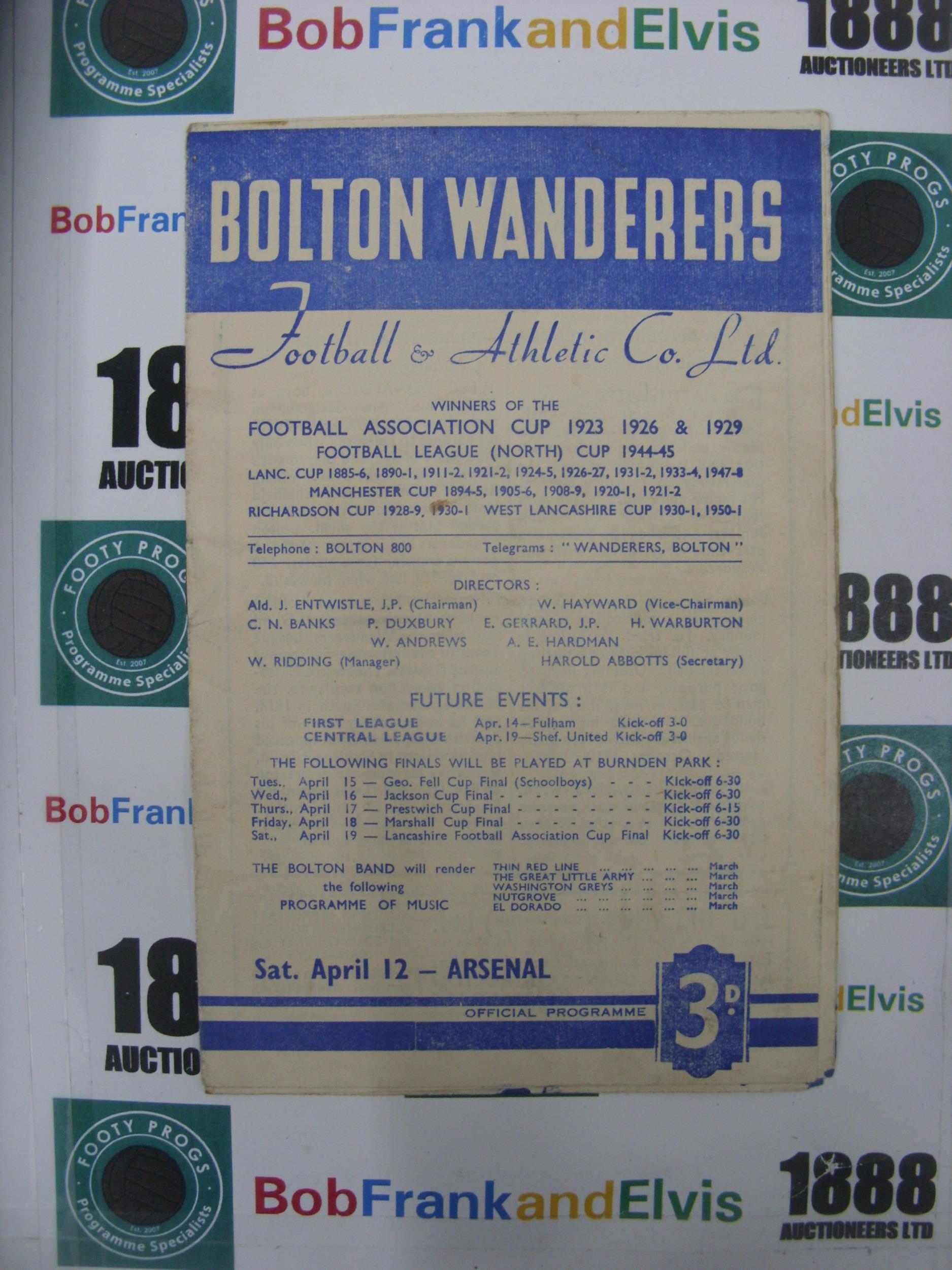 BOLTON WANDERERS, 1951/1952, a football programme from the game versus Arsenal, played on 12/04/1952 (folded, ink stained at bottom).