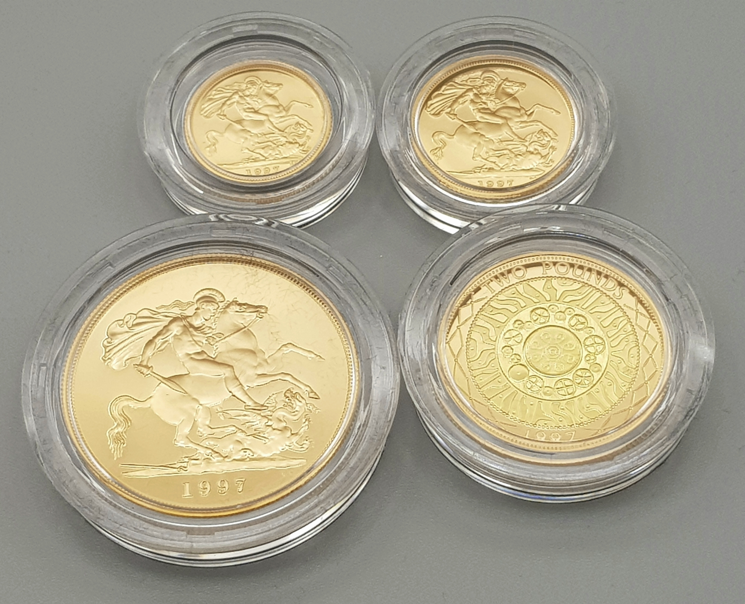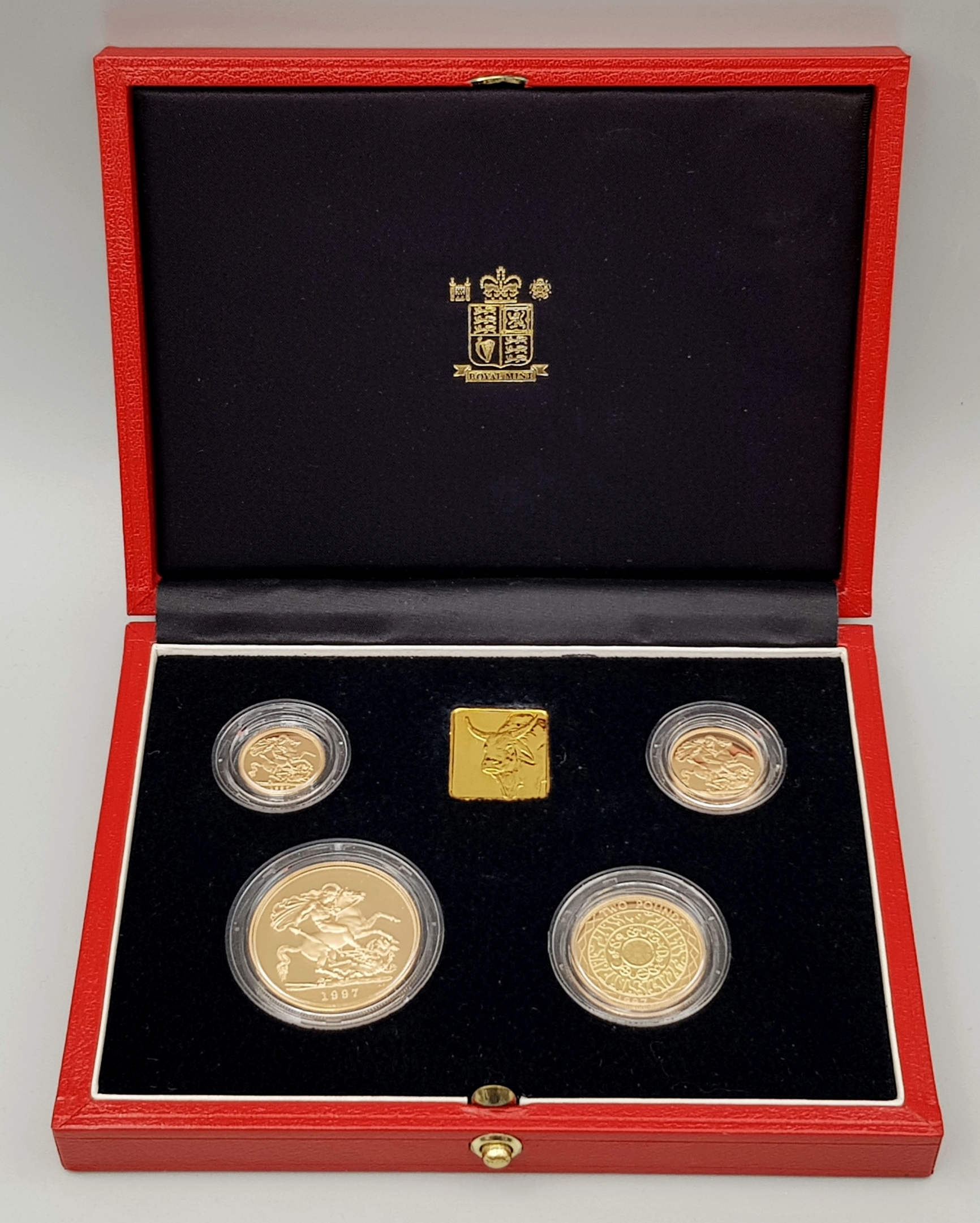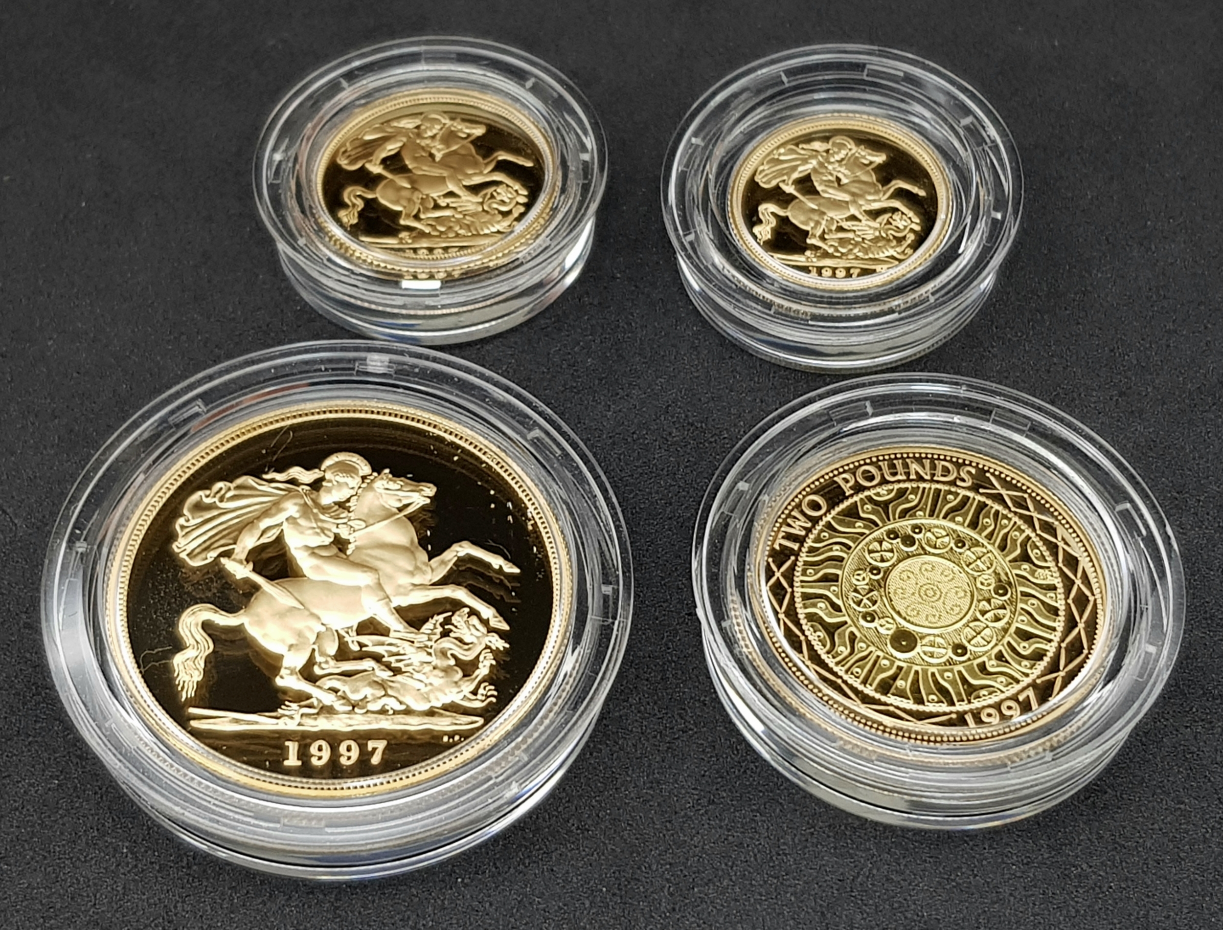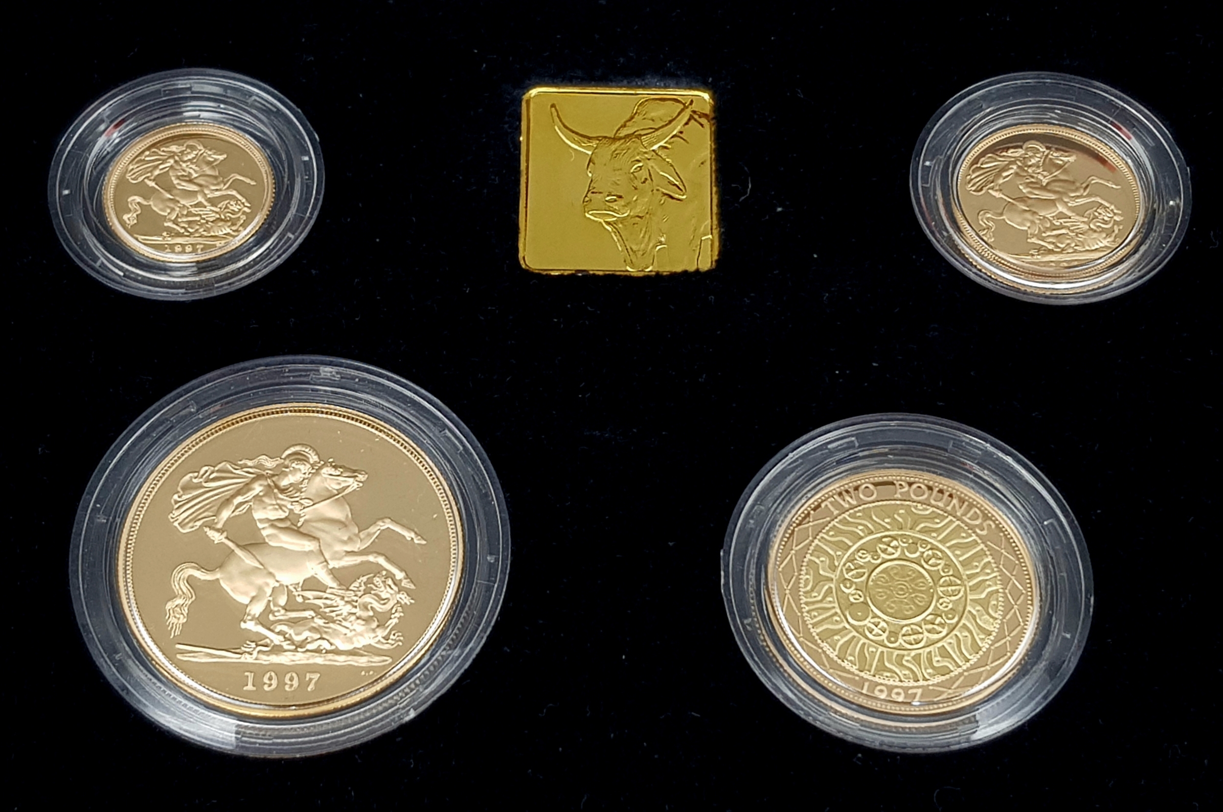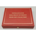 A 1997 United Kingdom Gold Proof Four Coin Sovereign Collection. This 1997 Proof gold 22K Gold Sovereign 4-coin set features a proof quintuple-sovereign (five-pound coin), double-sovereign (two-pound coin), sovereign and half-sovereign. Total 22k gold weight 67.88g. Limited edition: No 0622 of 1000. Comes with a certificate of authenticity and presentation case. Excellent condition. A wonderful coin collectible or gift to hand down to loved ones.