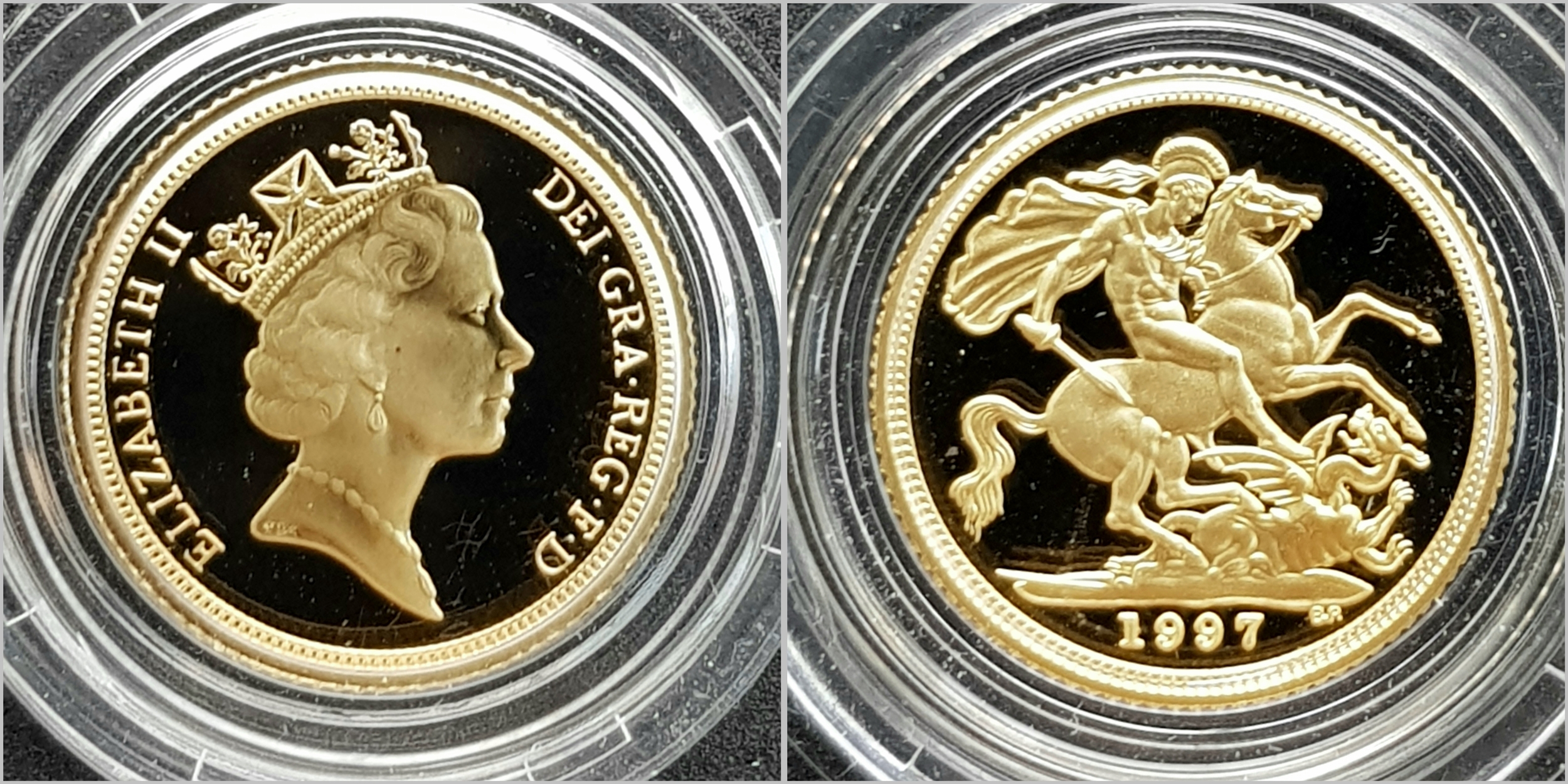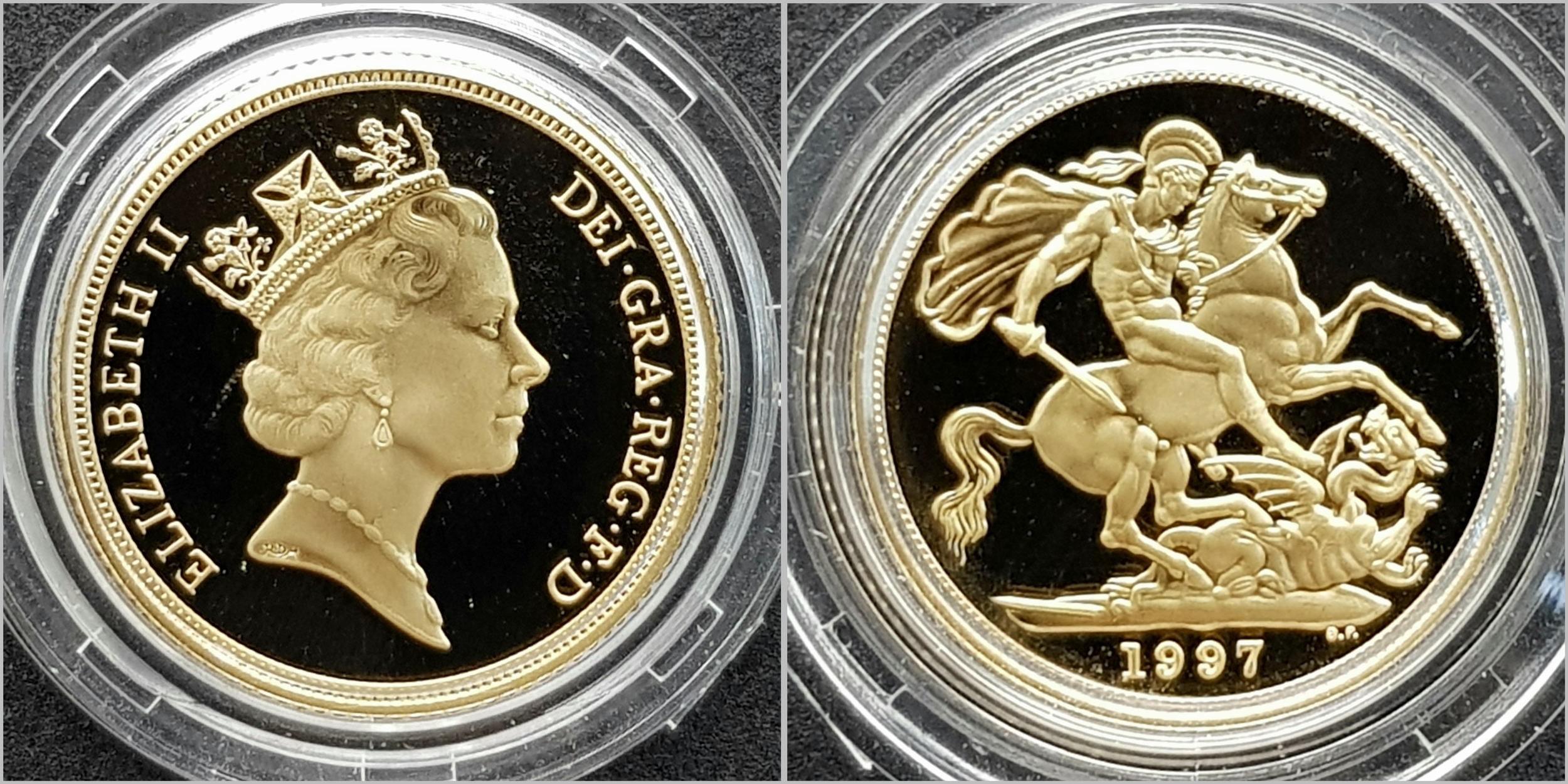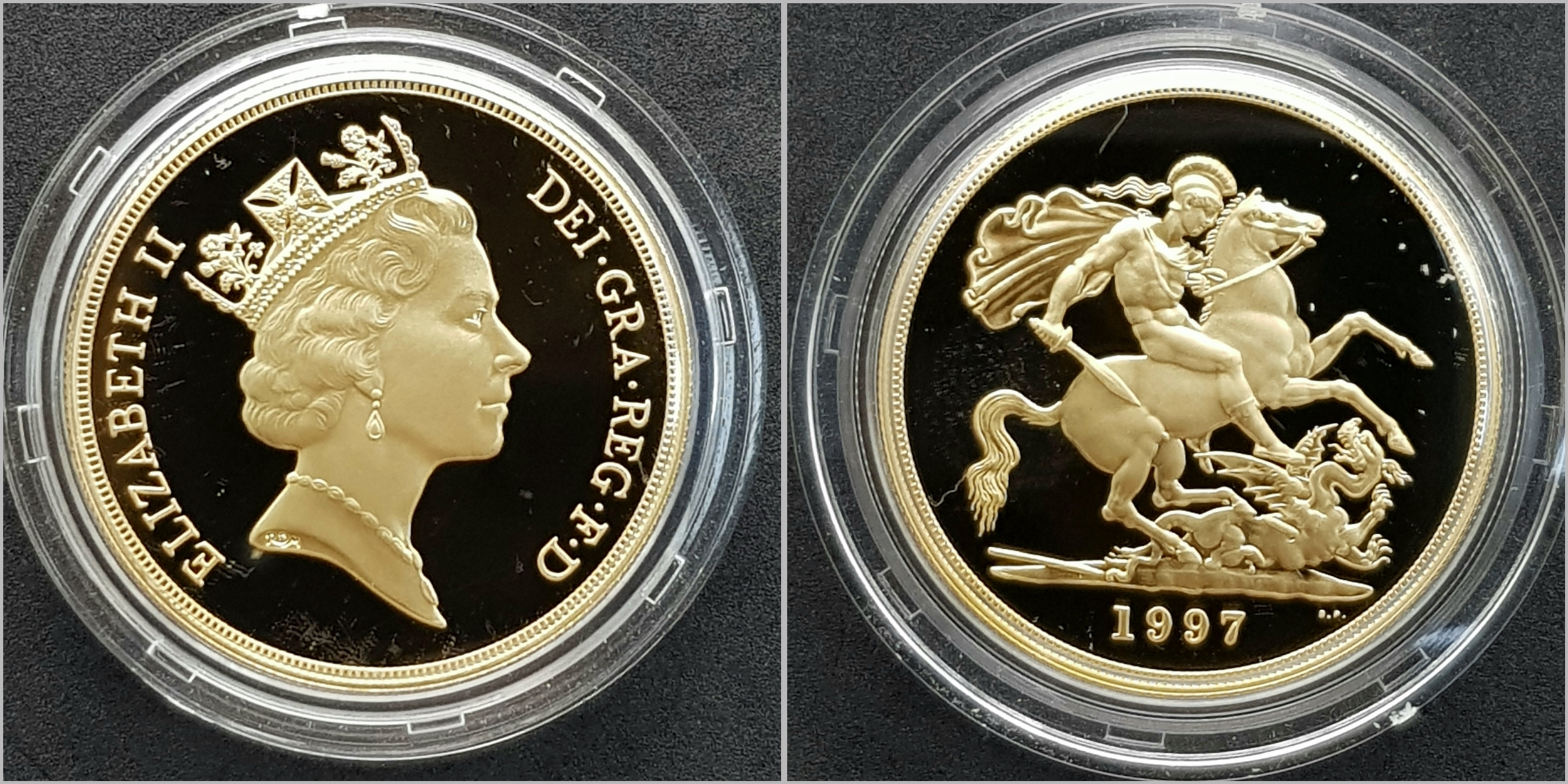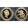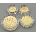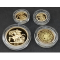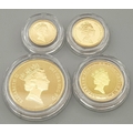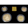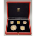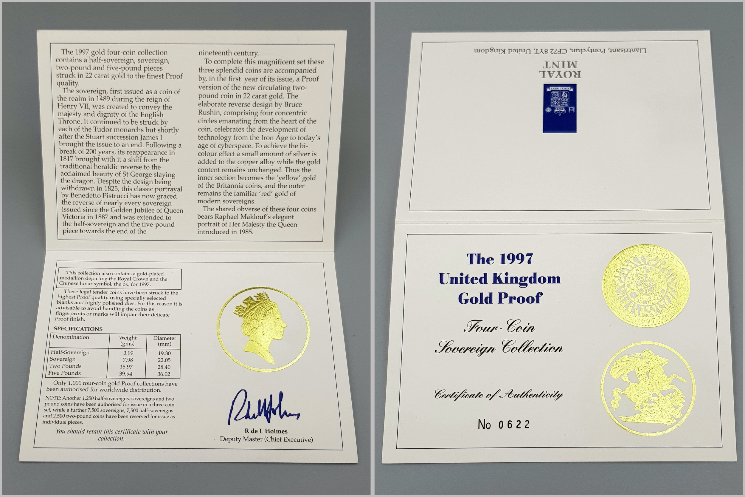 A 1997 United Kingdom Gold Proof Four Coin Sovereign Collection. This 1997 Proof gold 22K Gold Sovereign 4-coin set features a proof quintuple-sovereign (five-pound coin), double-sovereign (two-pound coin), sovereign and half-sovereign. Total 22k gold weight 67.88g. Limited edition: No 0622 of 1000. Comes with a certificate of authenticity and presentation case. Excellent condition. A wonderful coin collectible or gift to hand down to loved ones.