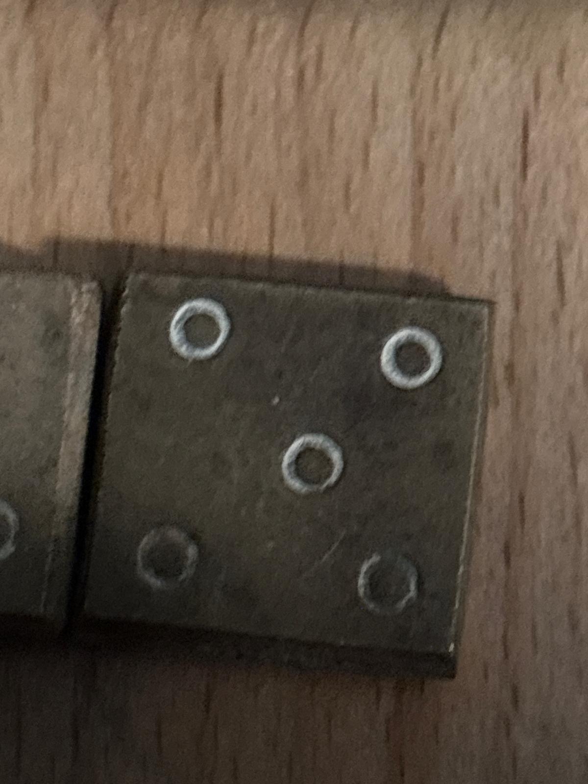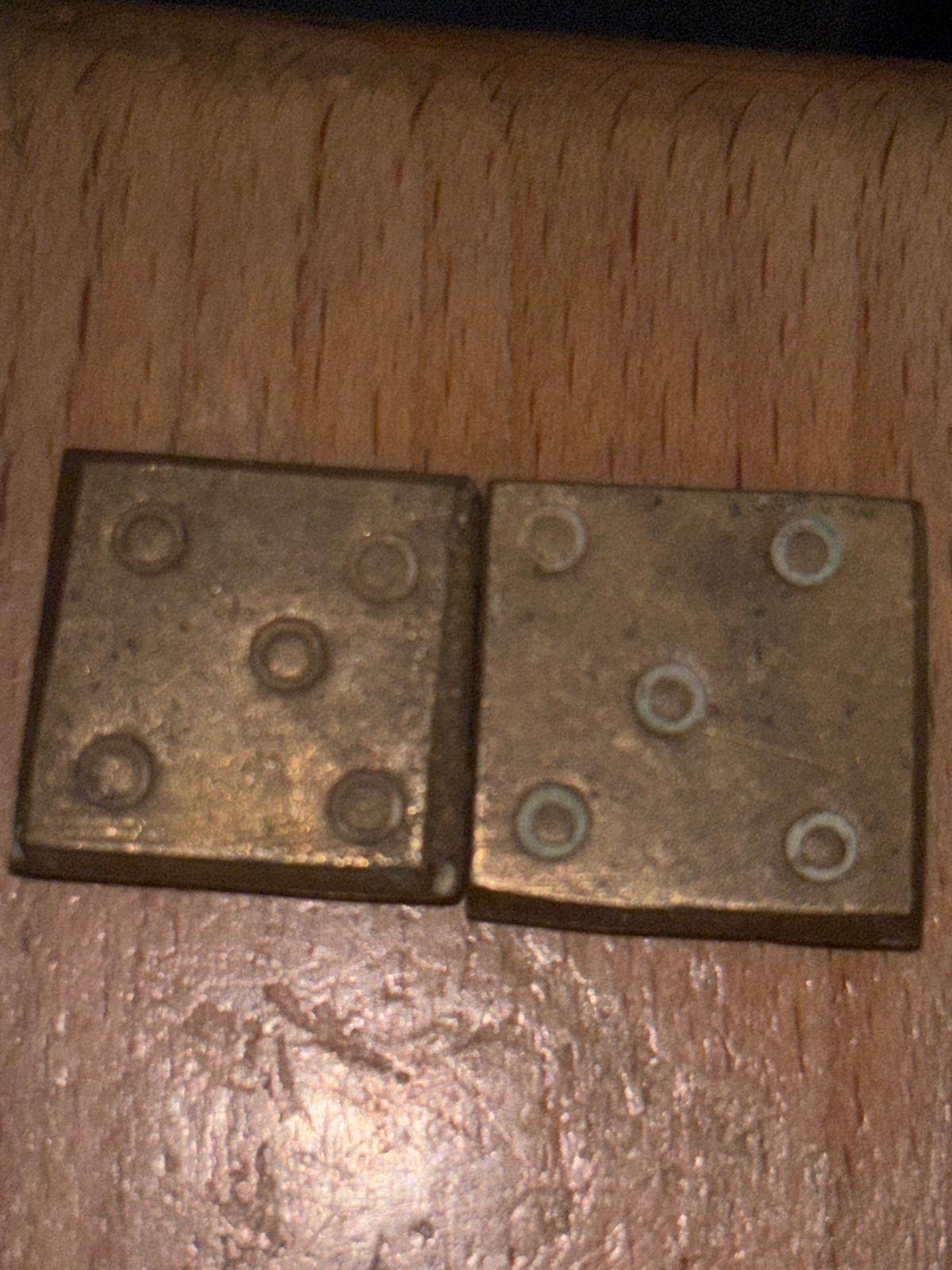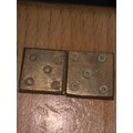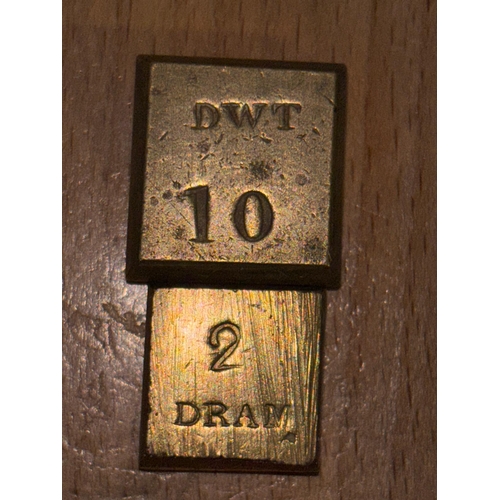 Pair of Antique Brass Trade Weights (Dice-Marked Type), c.18th–19th Century A matched pair of small solid brass square trade weights, each struck to both faces with a five-dot punch mark for identification within a boxed set. Unlike decorative gaming counters, these pieces are precisely matched in weight at approximately 7.7 grams each, indicating intentional manufacture for use on a balance scale rather than casual table play. Such simple dot-marked weights were commonly used by: • Market traders • Goldsmiths and jewellers • Apothecaries • General merchants The punched dot arrangement acted as a quick visual code within a graduated weight set, particularly on smaller fractional weights where full inscriptions were often omitted. Their consistent mass strongly suggests they represent a small fractional avoirdupois or apothecary standard, allowing for historic wear and tolerance. Material: Solid brass Weight: Approx. 7.7g each Period: Likely 18th–19th century Condition: Honest age wear with attractive patina An appealing and practical pair of early mercantile artefacts — far more than simple gaming pieces, these were working tools of everyday commerce. Offered together as one lot.