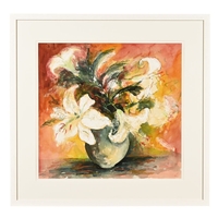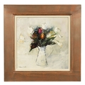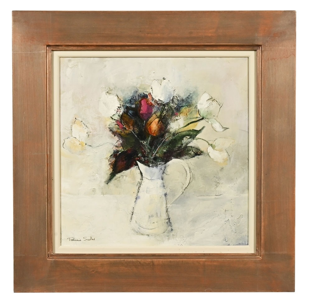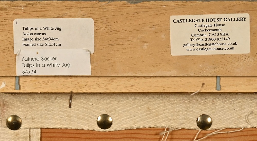 Patricia Sadler (Contemporary Scottish artist), Tulips in a white jug. 34 x 34 cm, framed, glazed, mounted and signed. ARR.