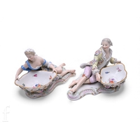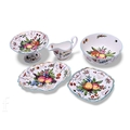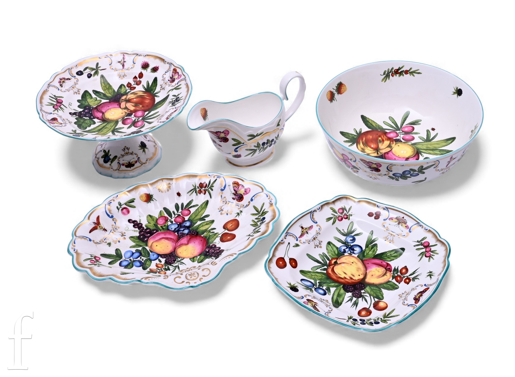 A Royal Worcester 'The Duke of Gloucester Service' fruit bowl, decorated with exotic fruit and foliate sprigs over white ground, diameter 26cm, a matching comport, gravy boat and two entree dishes. (5)