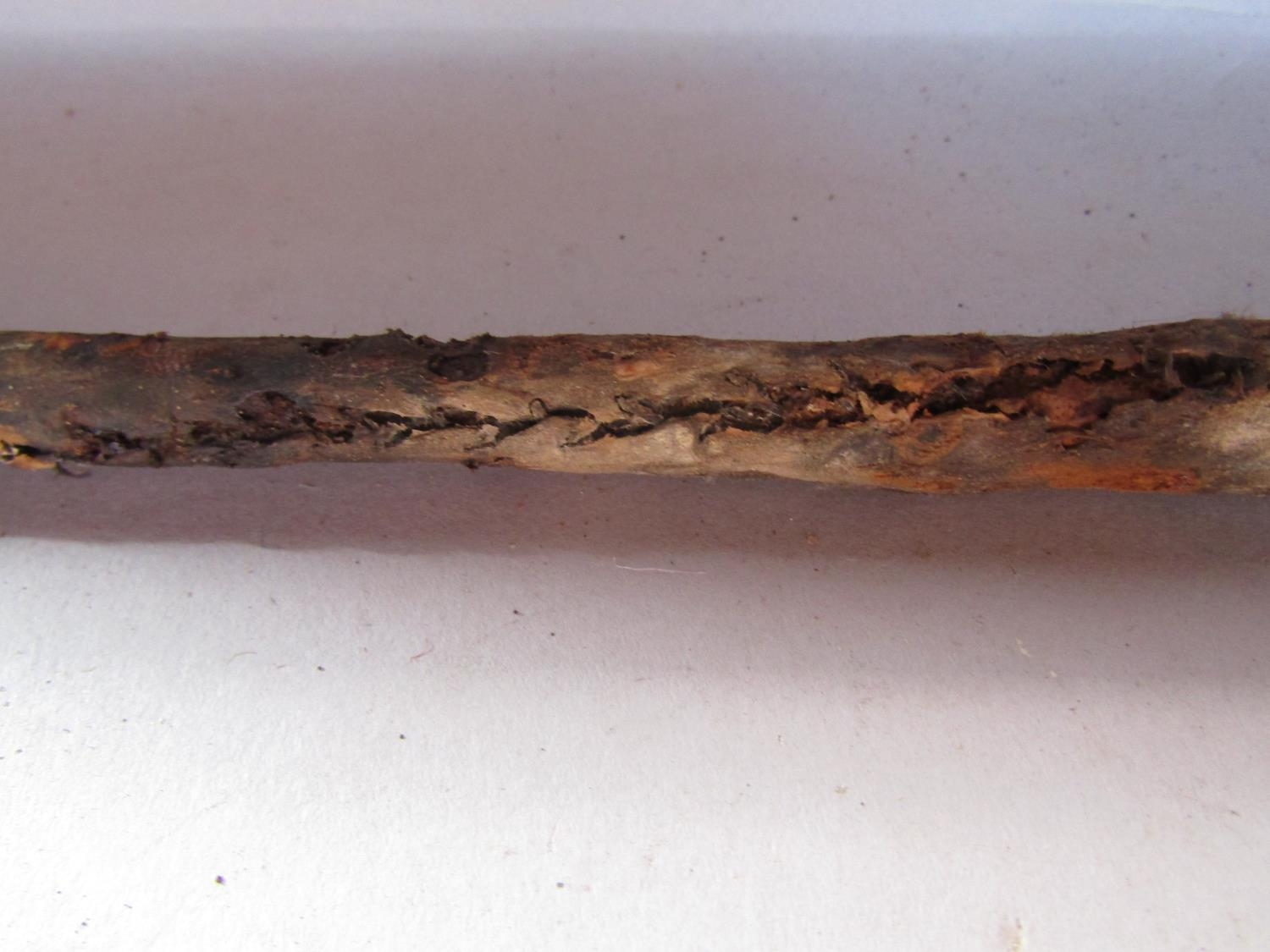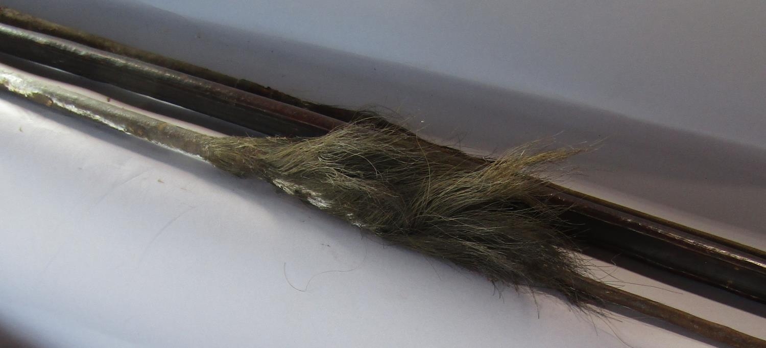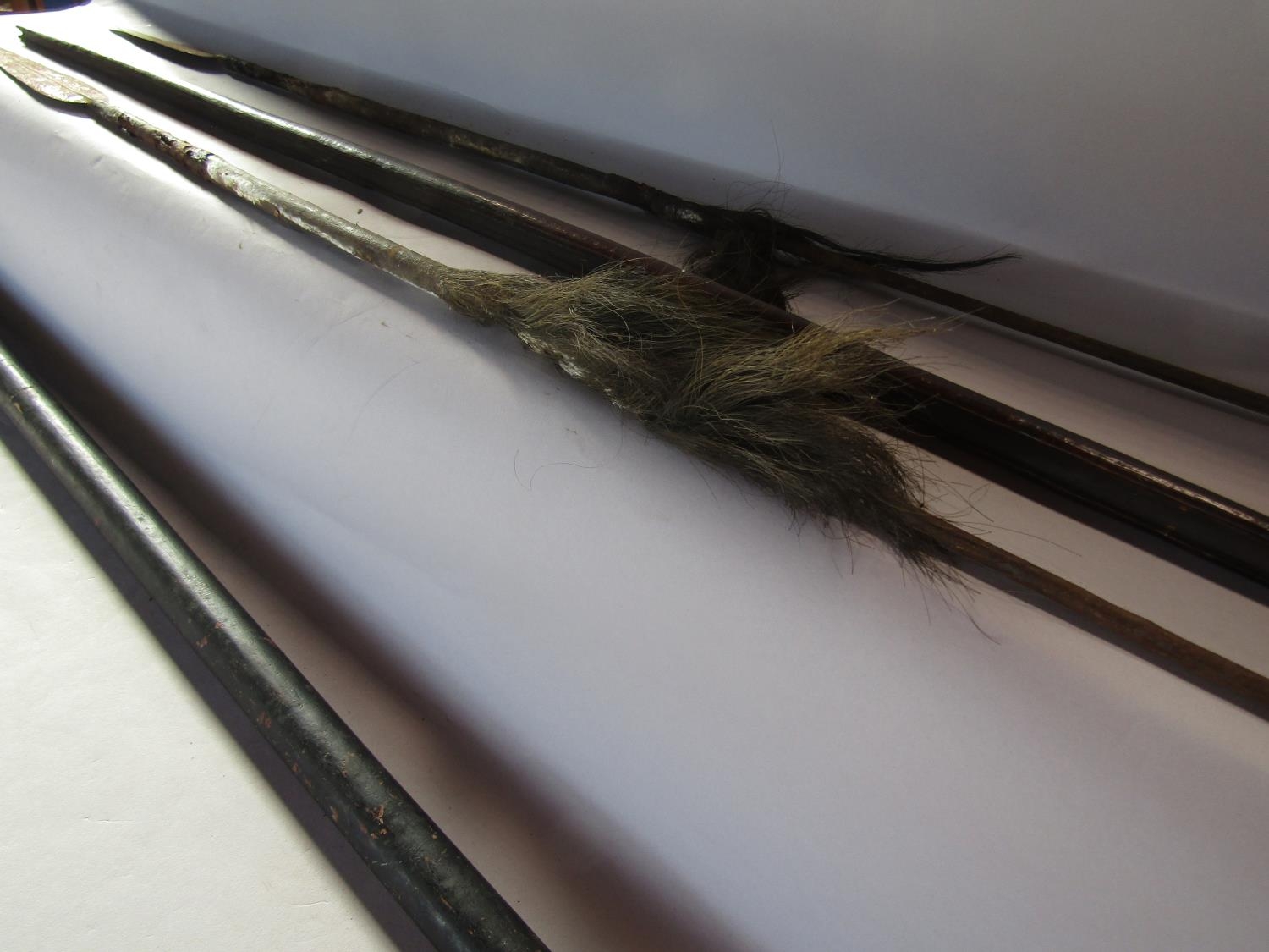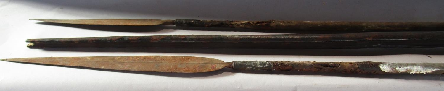 Two Tribal spears (as found) 145cm and 134cm a Tribal wooden spear launcher 149cm and a wooden Papua New Guinea dance stick (4)