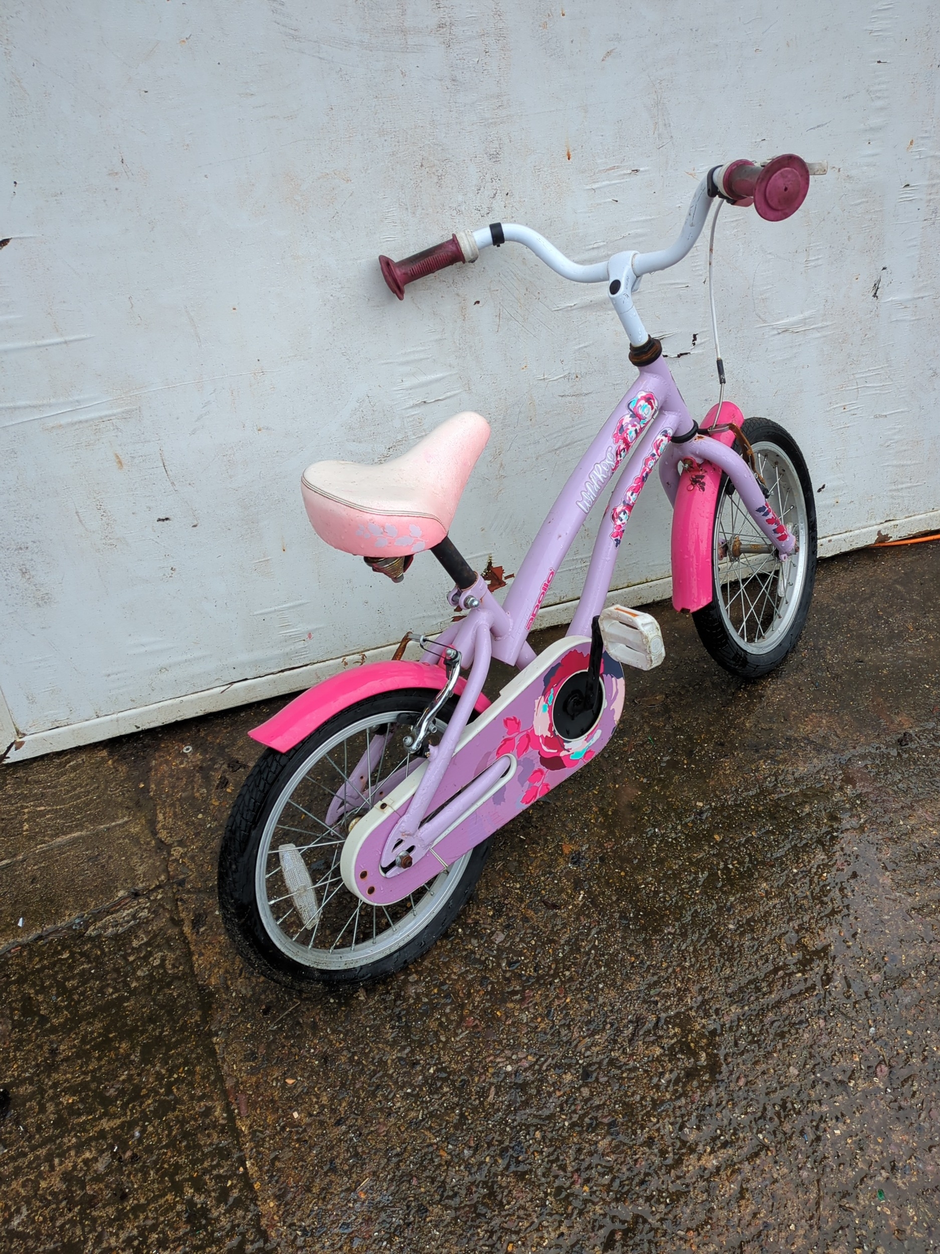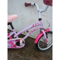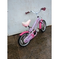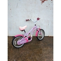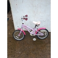 A small, colourful girls bike with a decorative floral design on the frame and chain guard. The bike features a comfortable seat and rubber grips on the handlebars for easy handling. It is designed to be sturdy and suitable for outdoor cycling activities for younger children.
