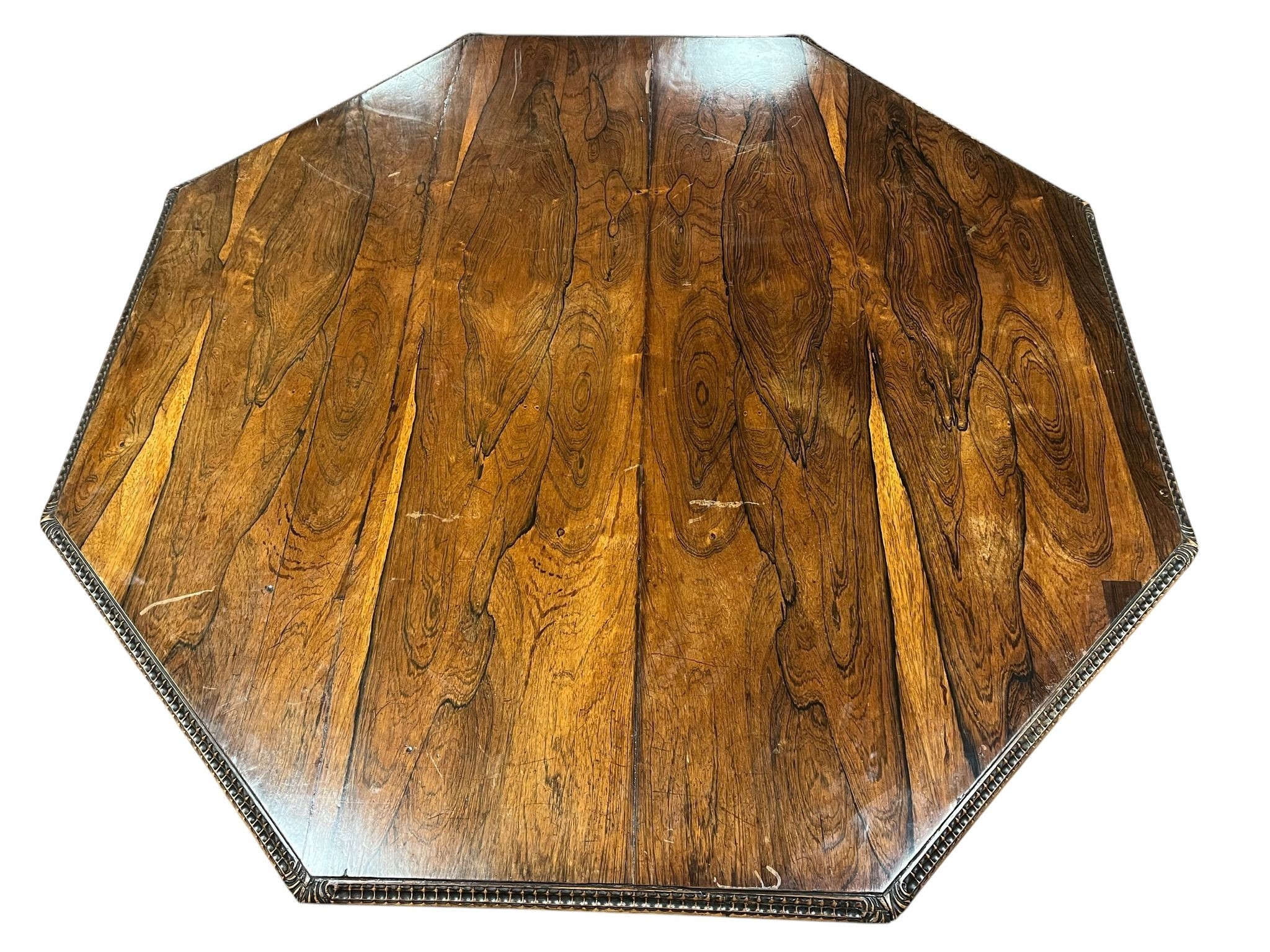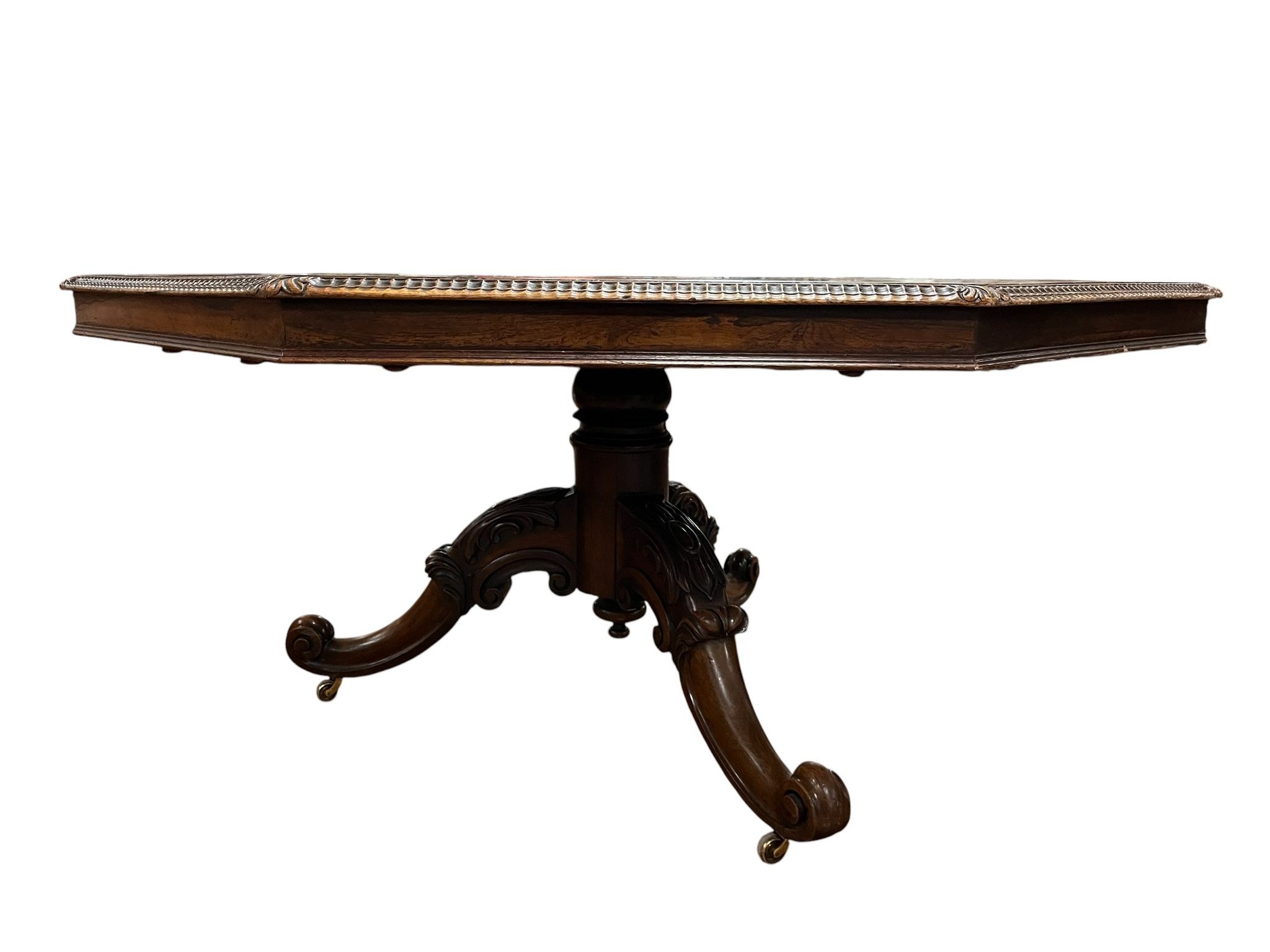 A 19TH CENTURY ROSEWOOD POD TABLE of octagonal form the shaped top above a baluster column on carved tripod support with scroll toes 72cm (h) x 144cm (d)