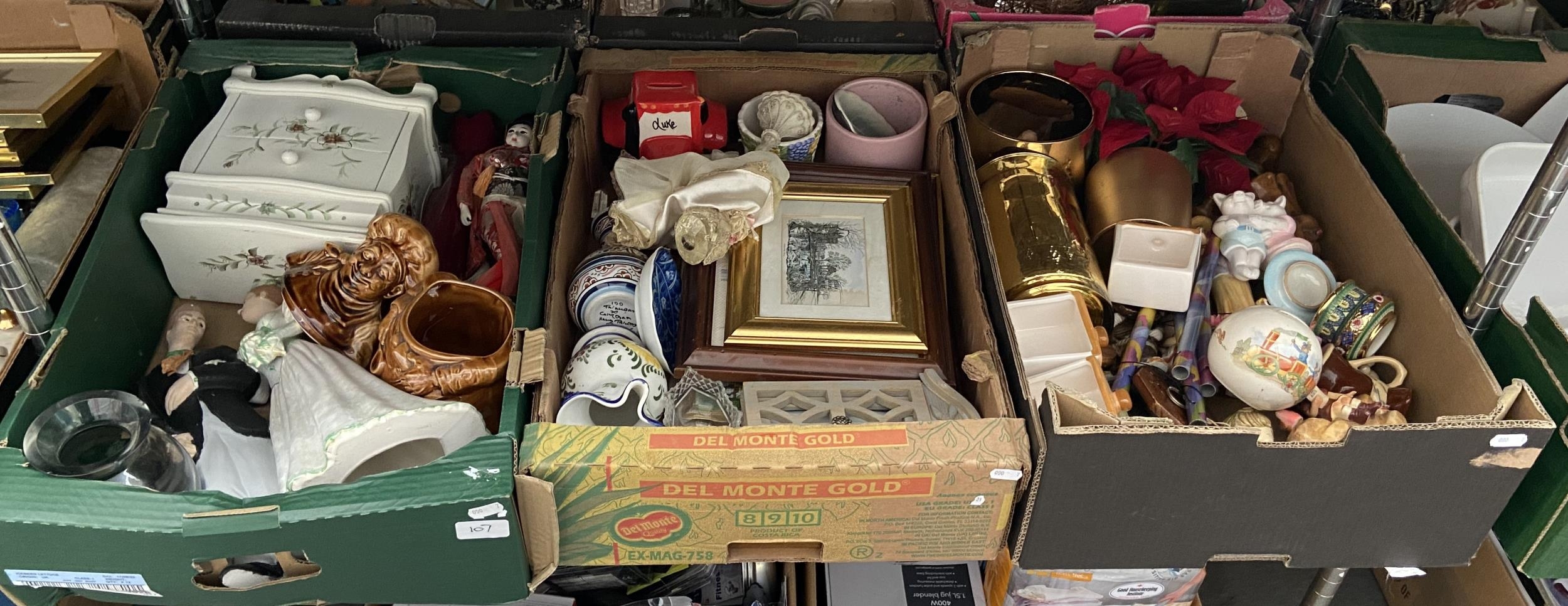 3 Boxes containing brass, ornaments and pictures etc