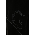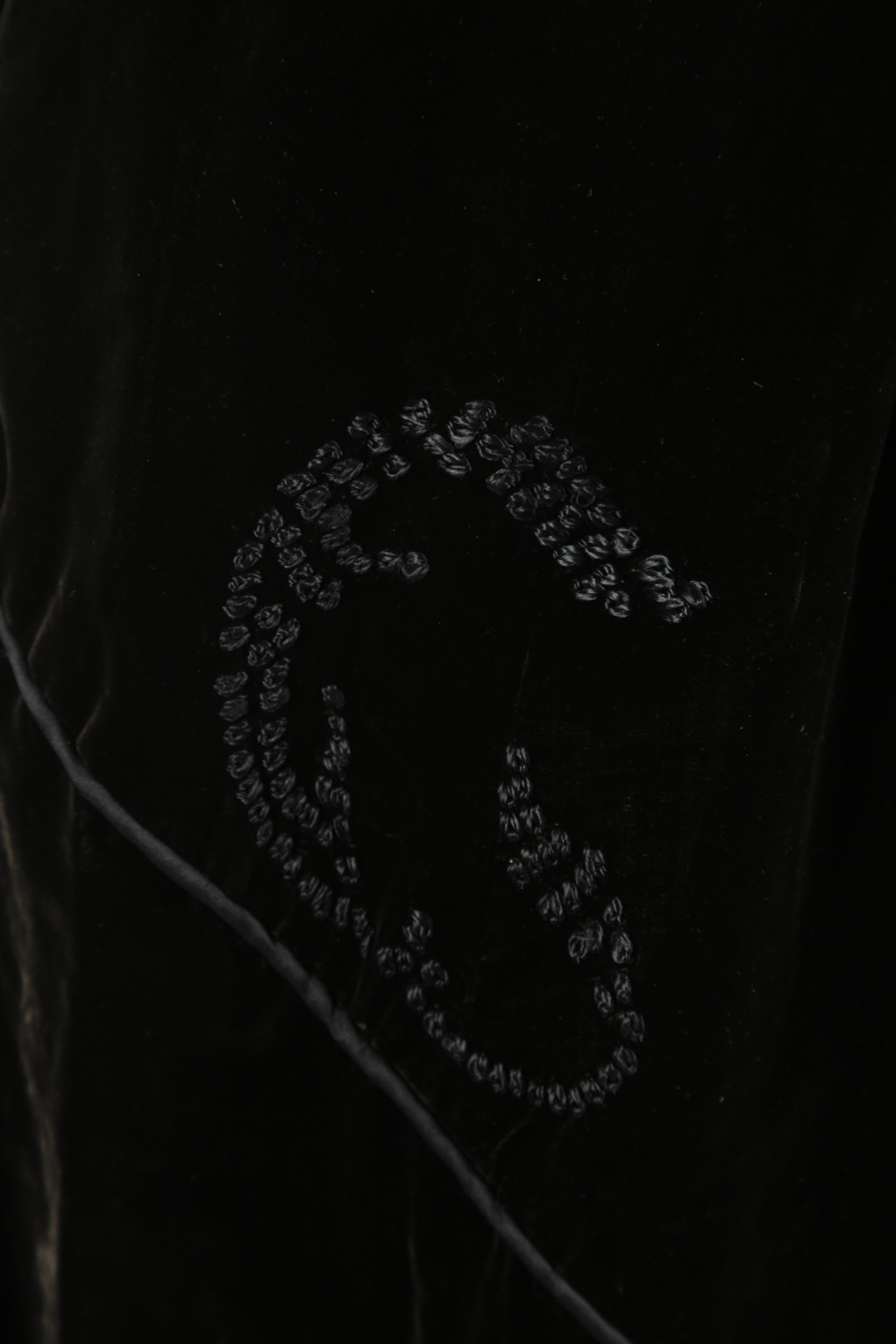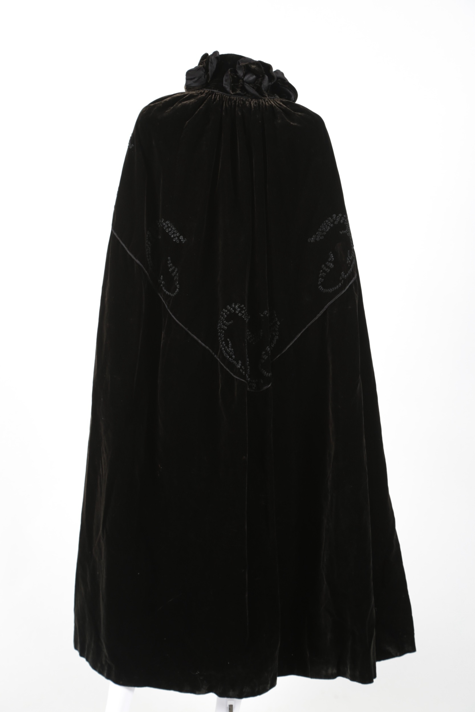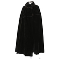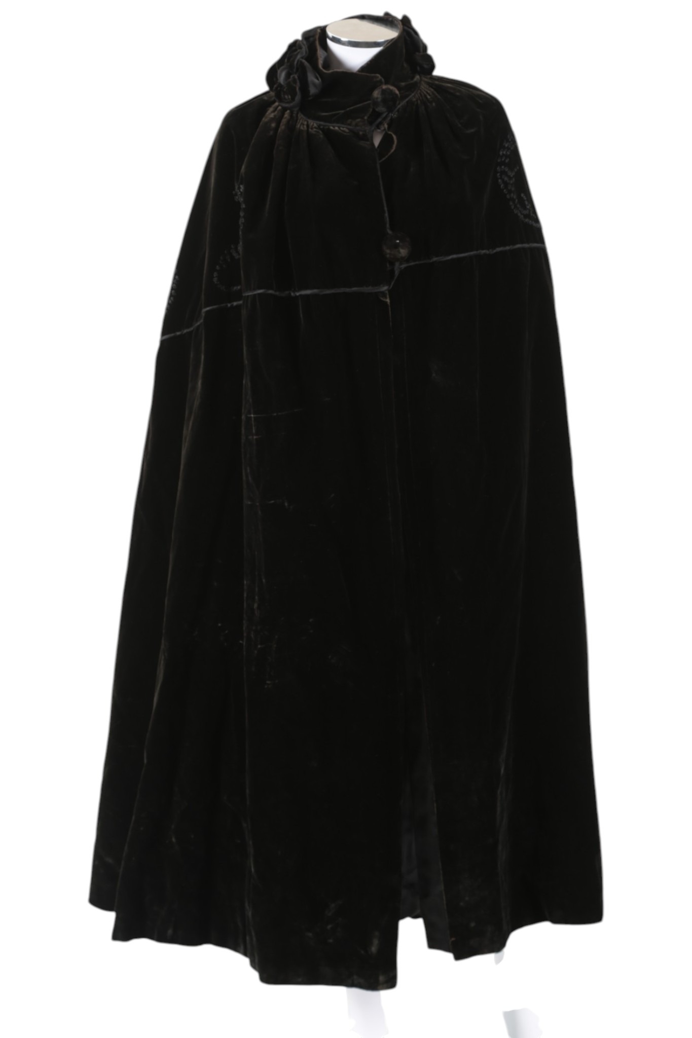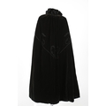 An early 20th century black velvet evening cape, with a floral decorative appliqué collar and embroidered shoulder and similar large decorative back motif, lined with black satin, top of collar to hem line, 138cm long.