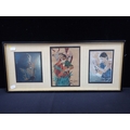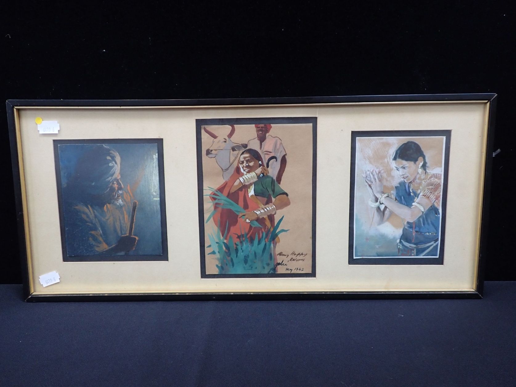 THREE INDIAN GOUACHE ILLUSTRATIONS framed as one, one with a gift inscription, and dated May 1943, the largest 18 x 13cm (under non-reflective glass)